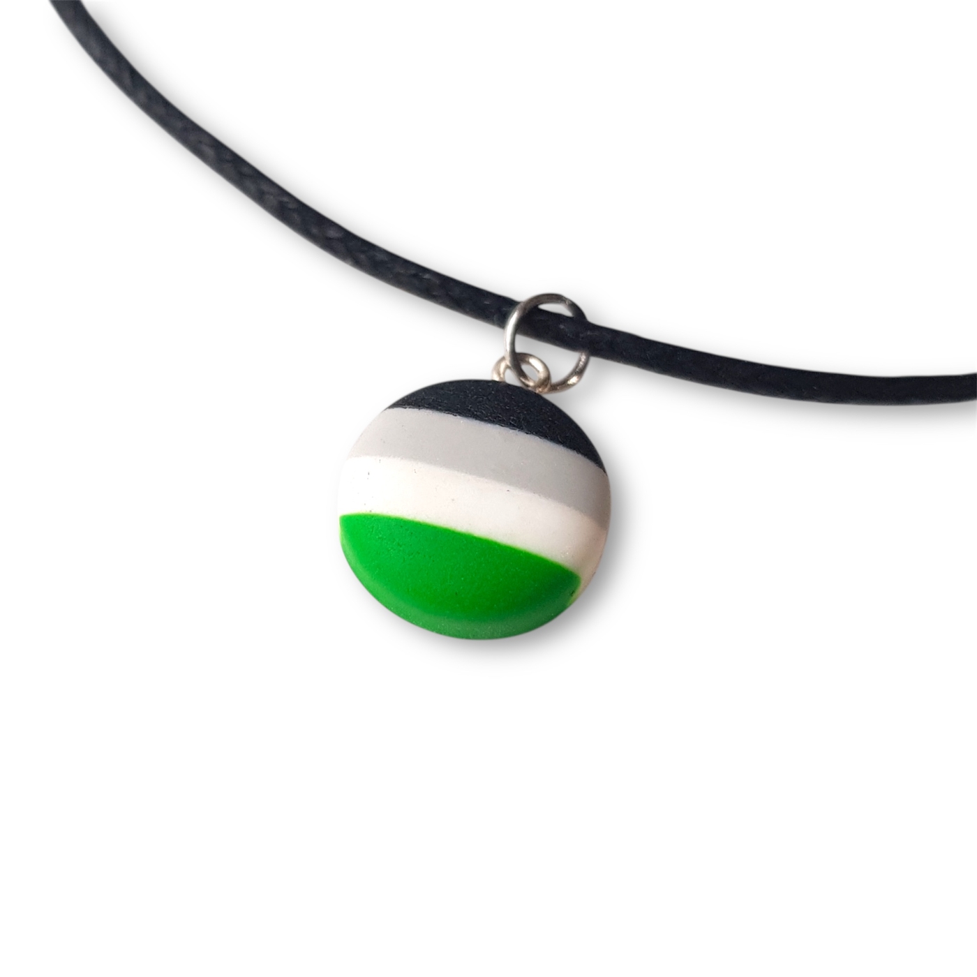 A cute button shaped necklace in the agender pride flag colours of black, grey, white, and green.