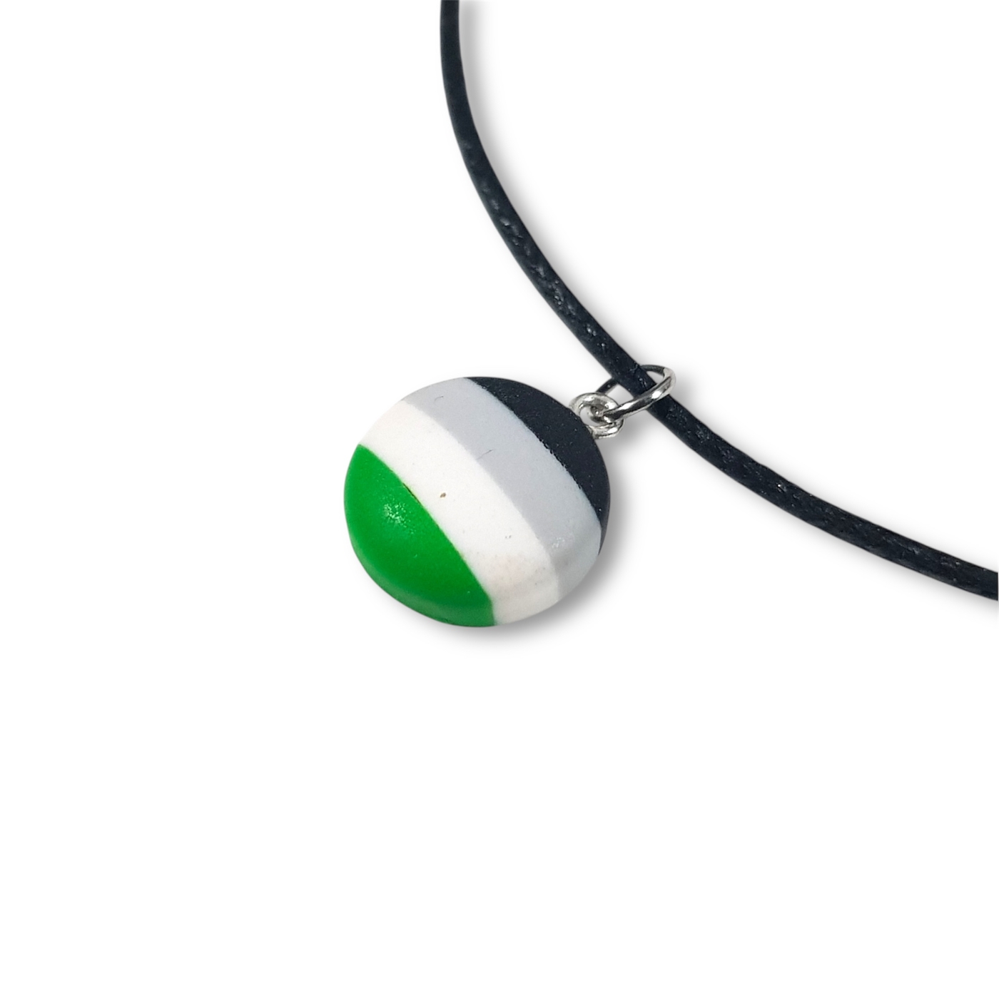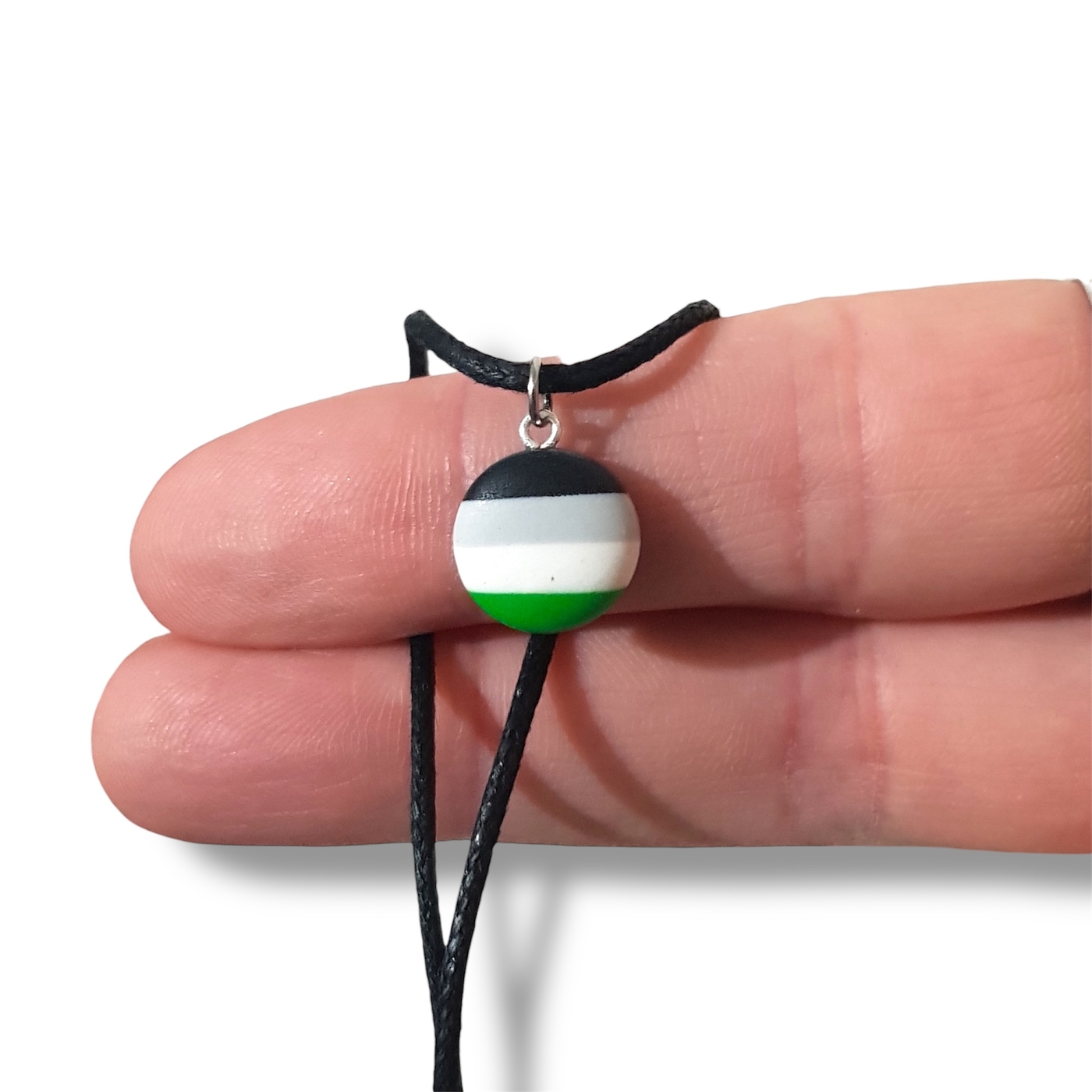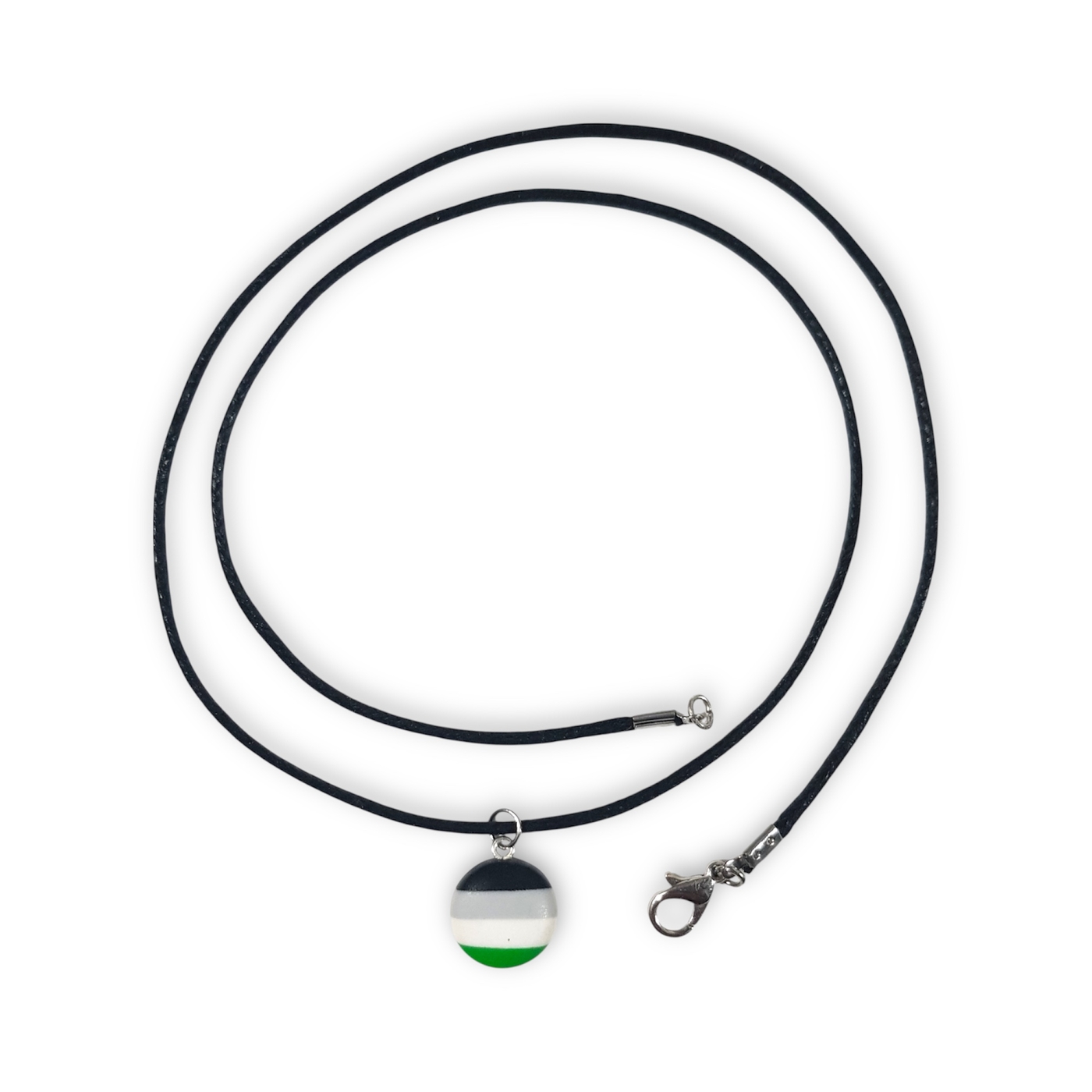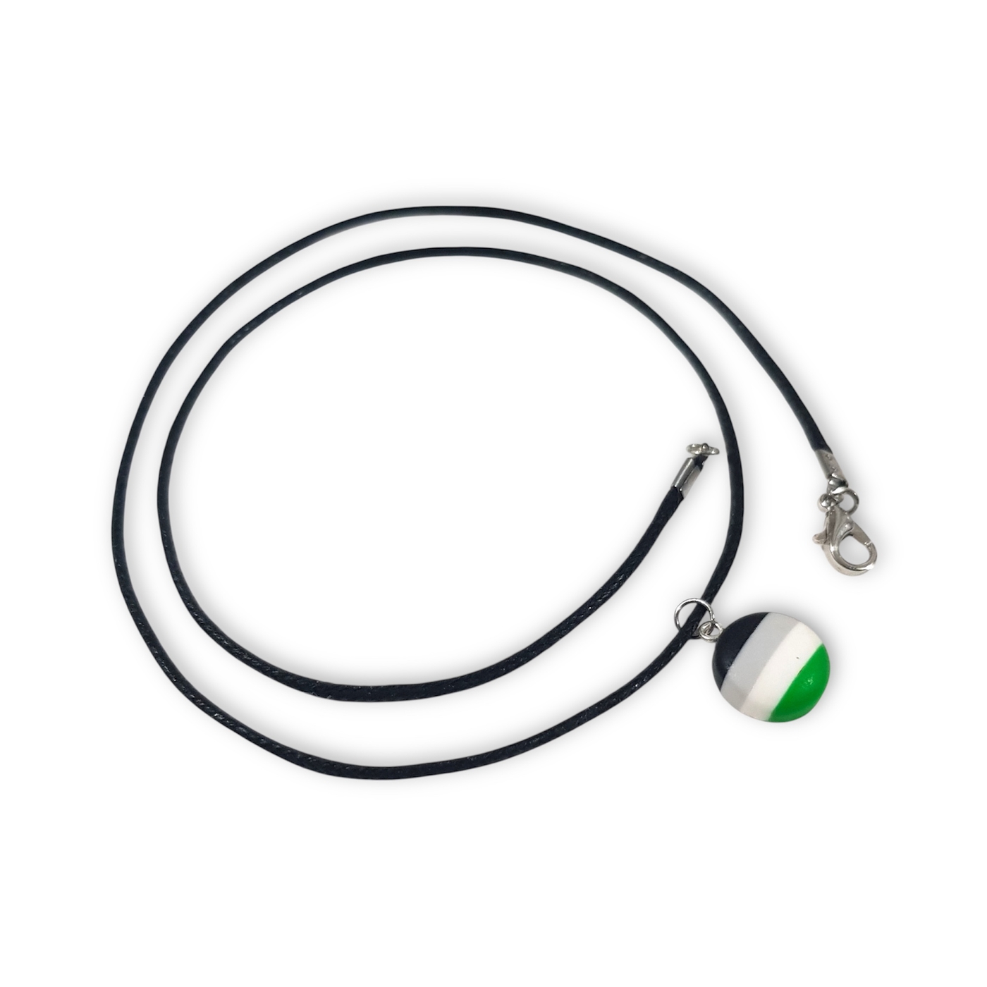 Agender pride flag necklace in the agender pride colours of black, grey, white, and green.