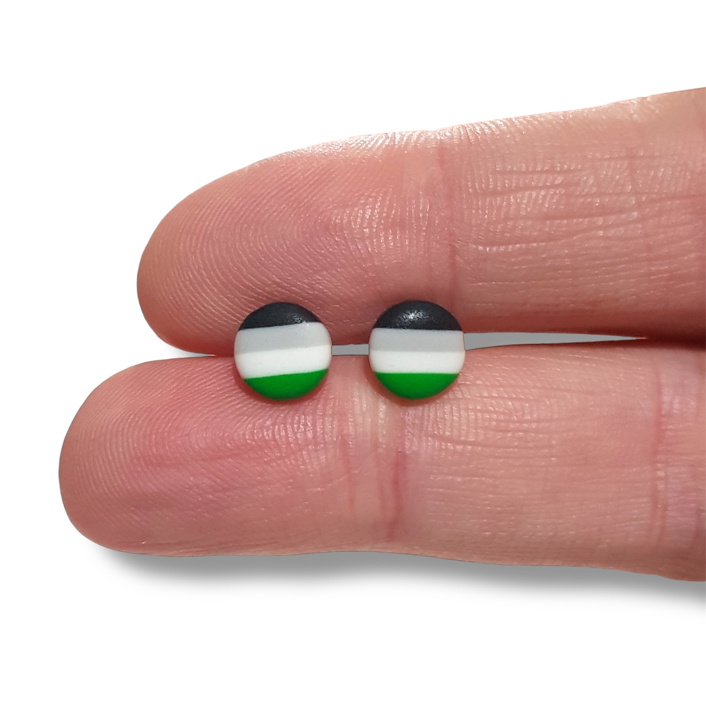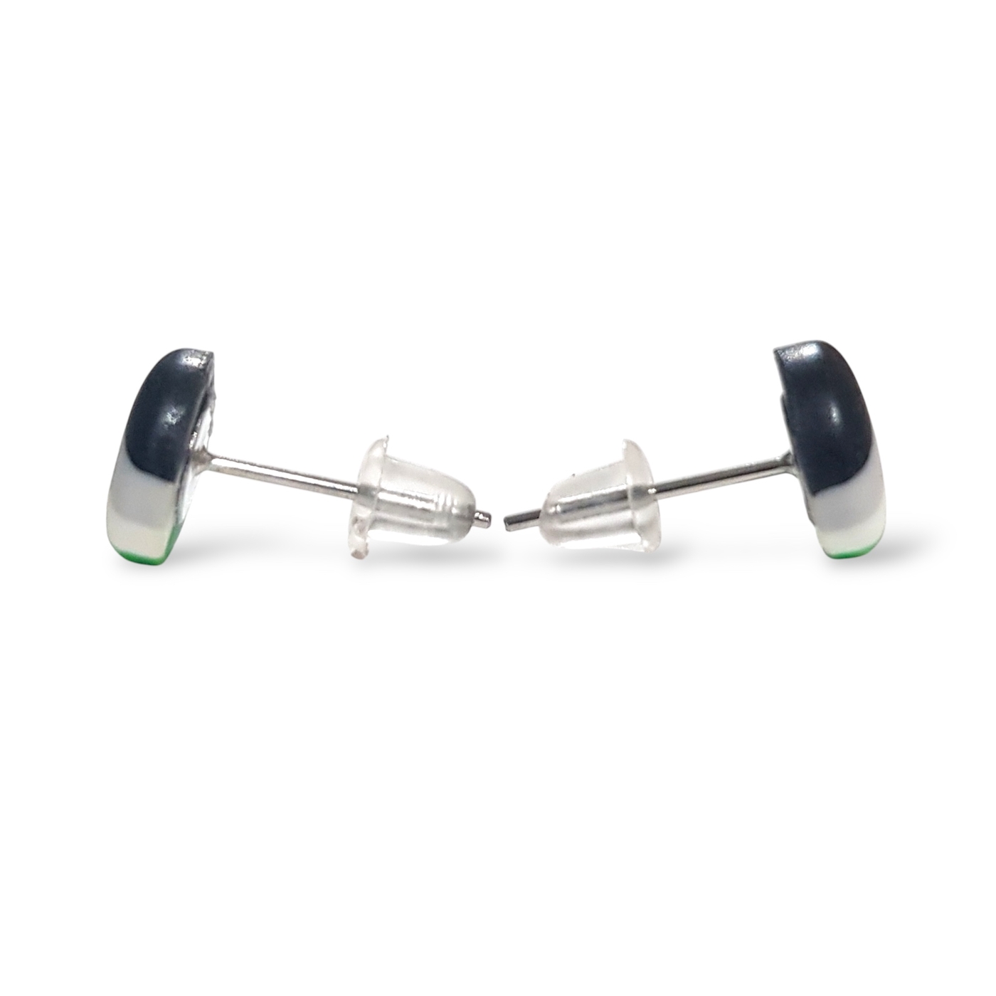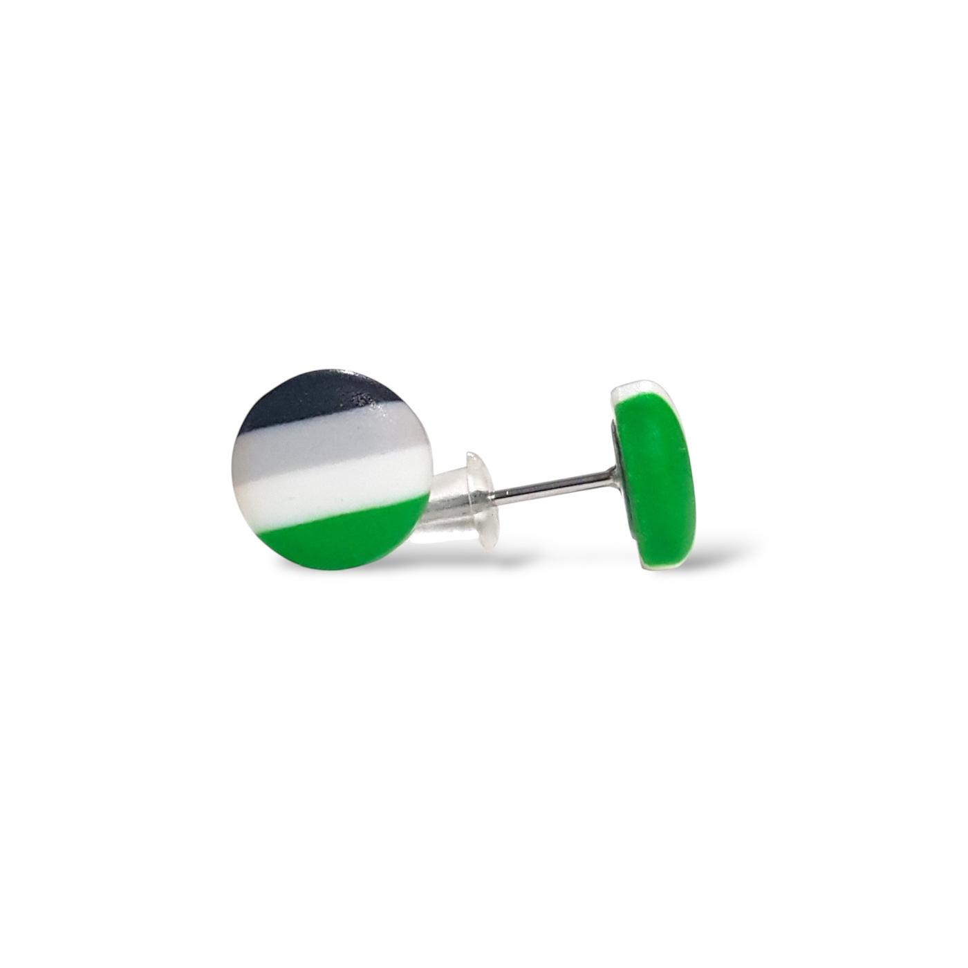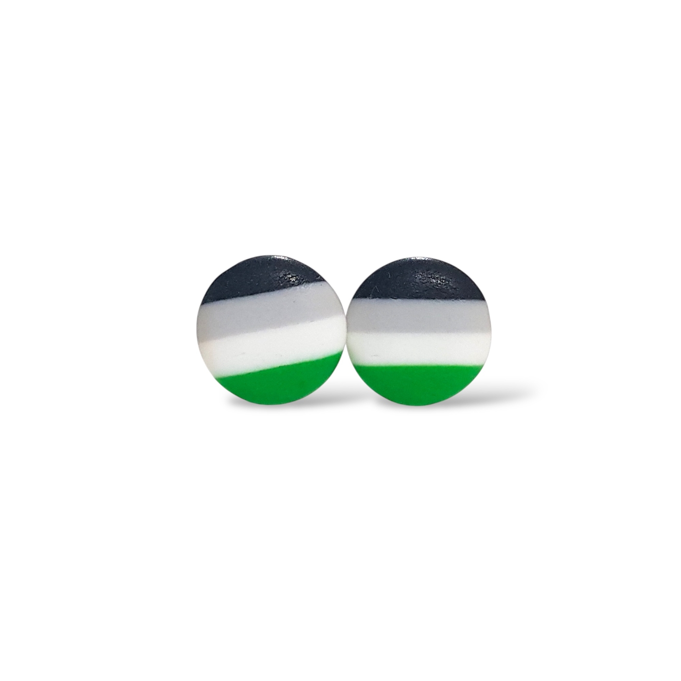 A beautiful pair of agender pride flag button shaped earrings. Handmade in polymer clay in the agender pride flag colours of black, grey, white, and green. Featuring hypoallergenic stainless steel posts and silicone rubber stoppers.