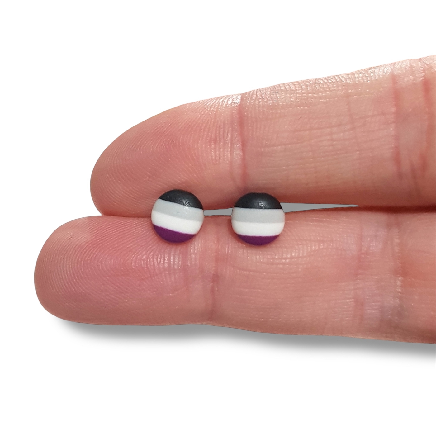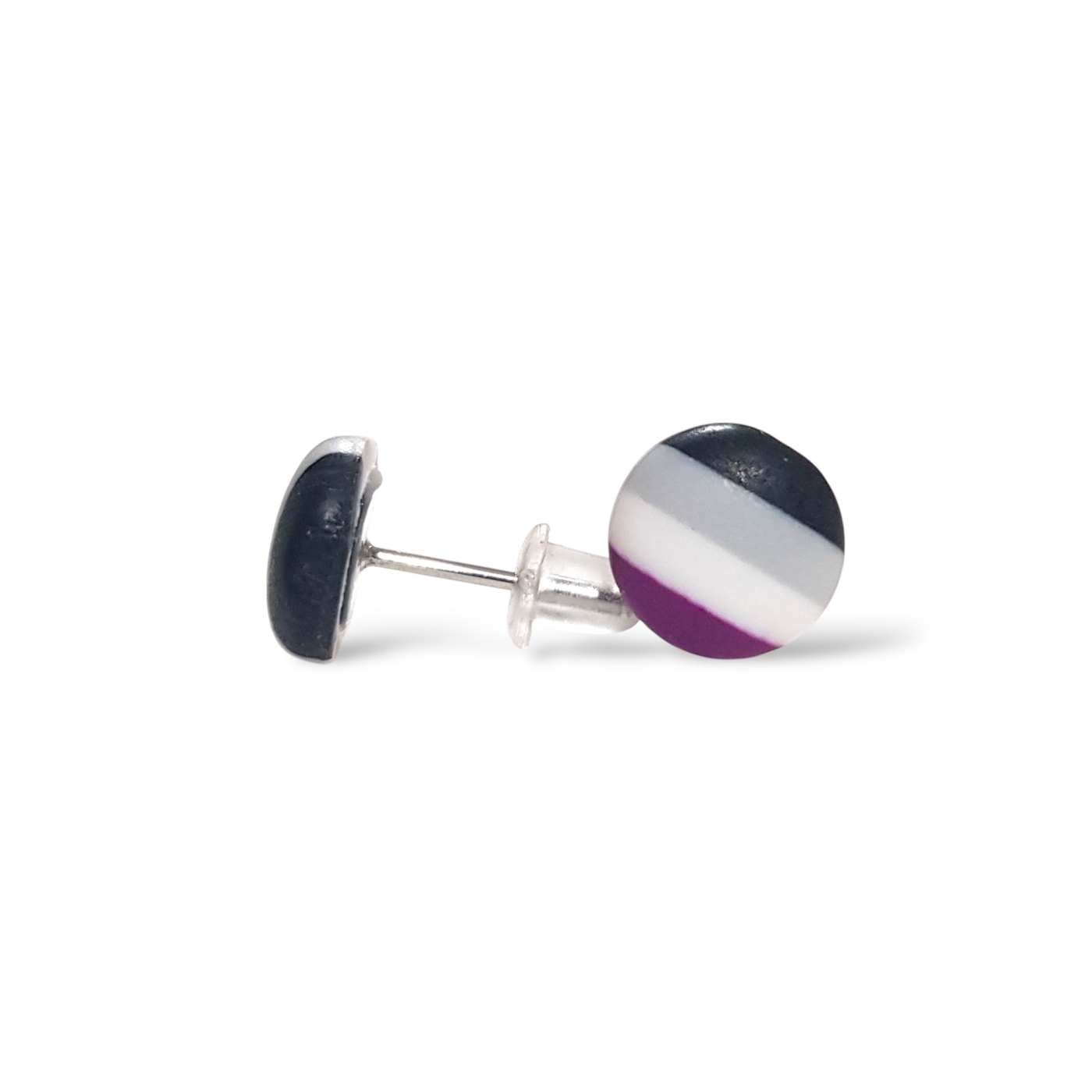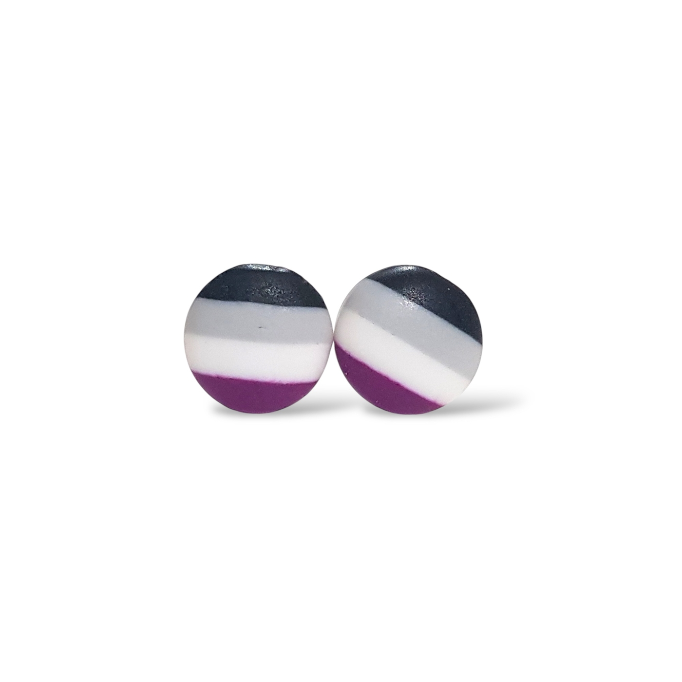 A beautiful pair of asexual pride flag button shaped earrings. Handmade in polymer clay in the asexual pride flag colours of black, grey, white, and purple. Featuring hypoallergenic stainless steel posts and silicone rubber stoppers.