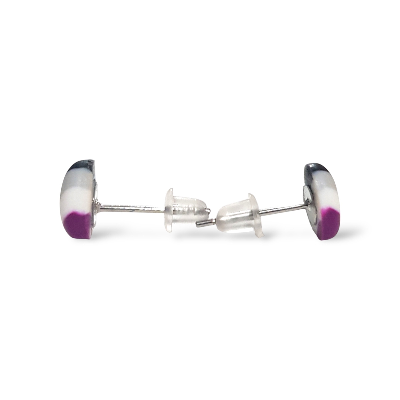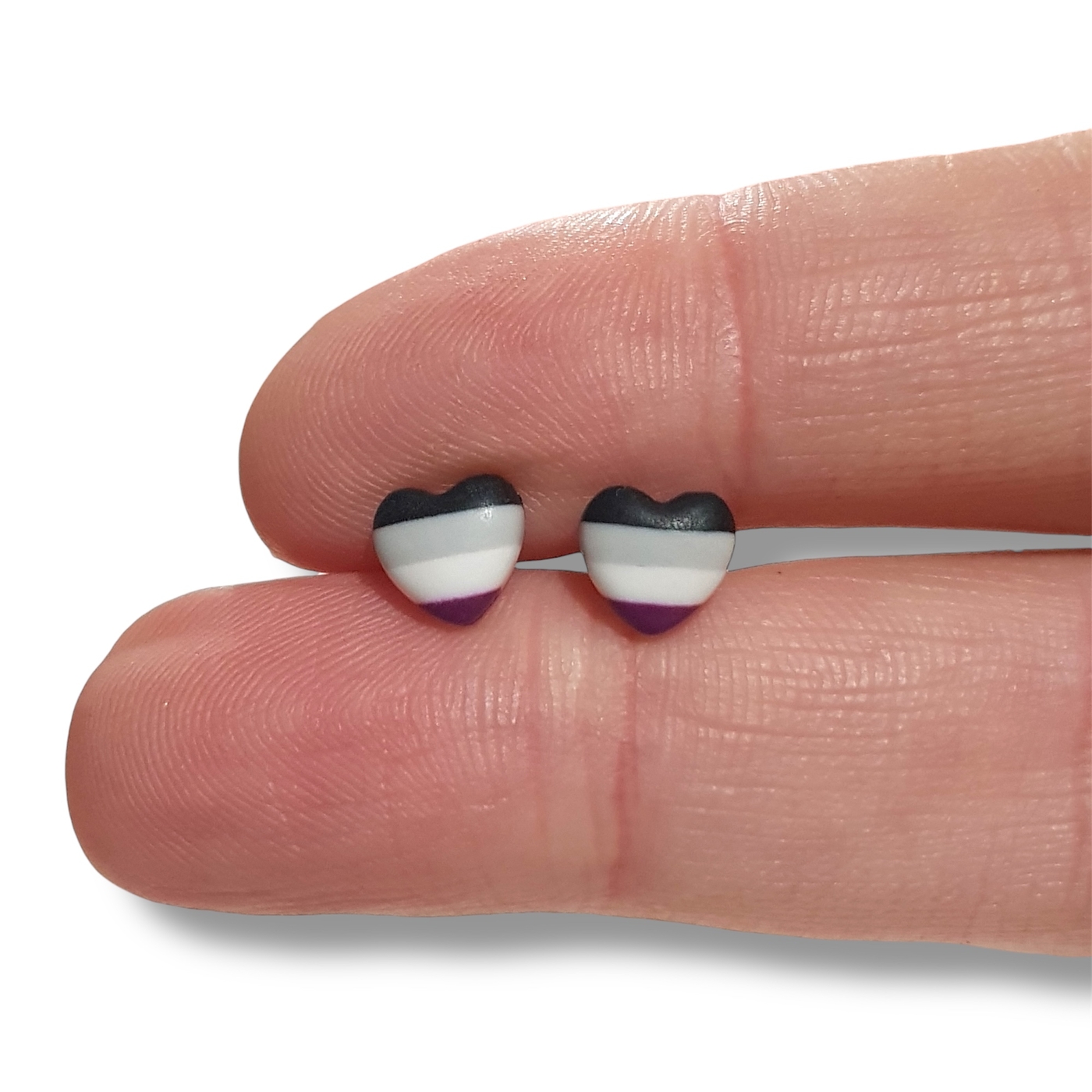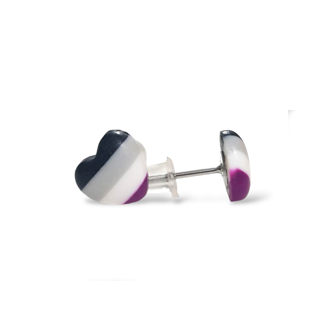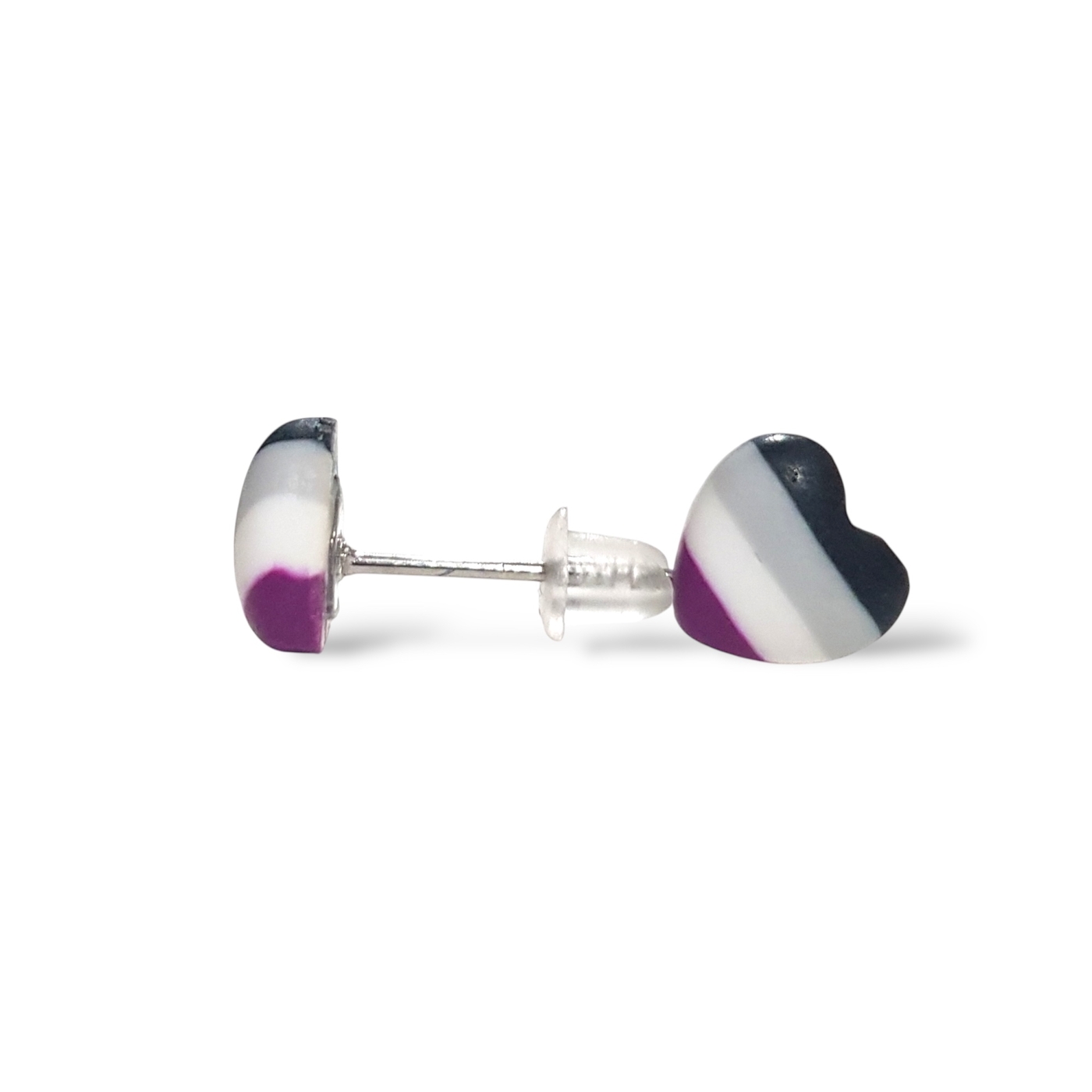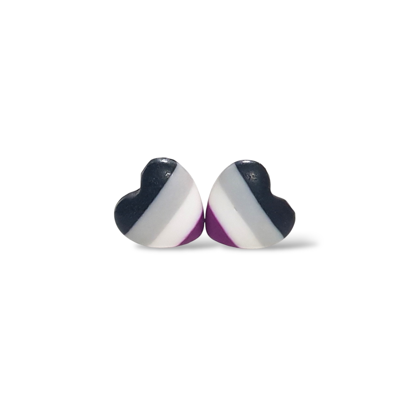 A beautiful pair of asexual pride flag heart shaped earrings in the asexual flag colours of black, grey, white, and purple. Handmade in polymer clay and featuring hypoallergenic stainless steel posts and silicone rubber stoppers.