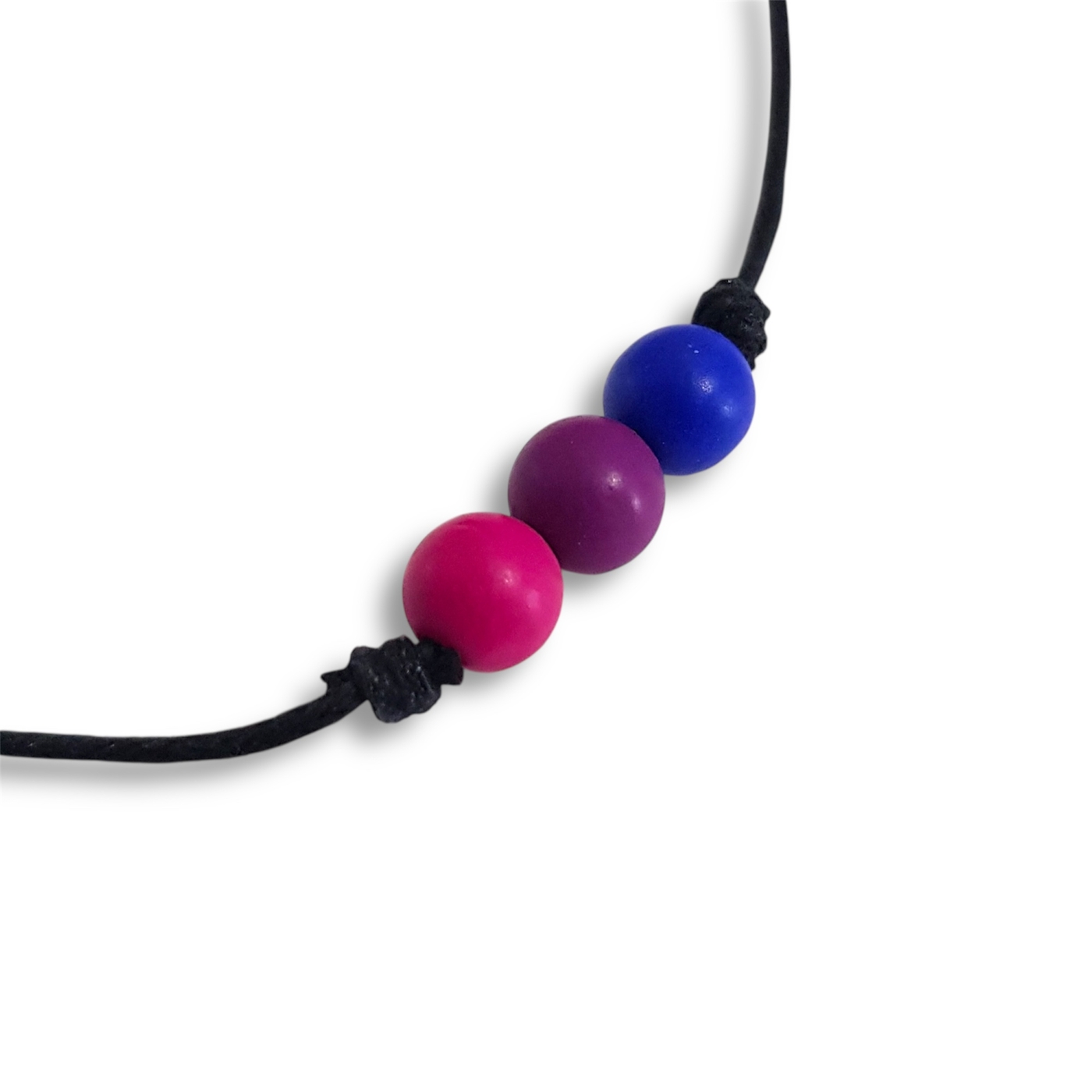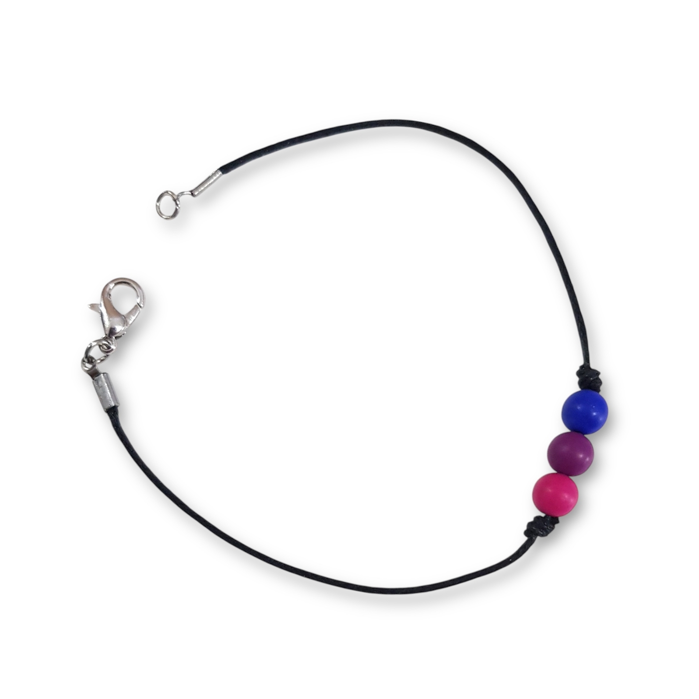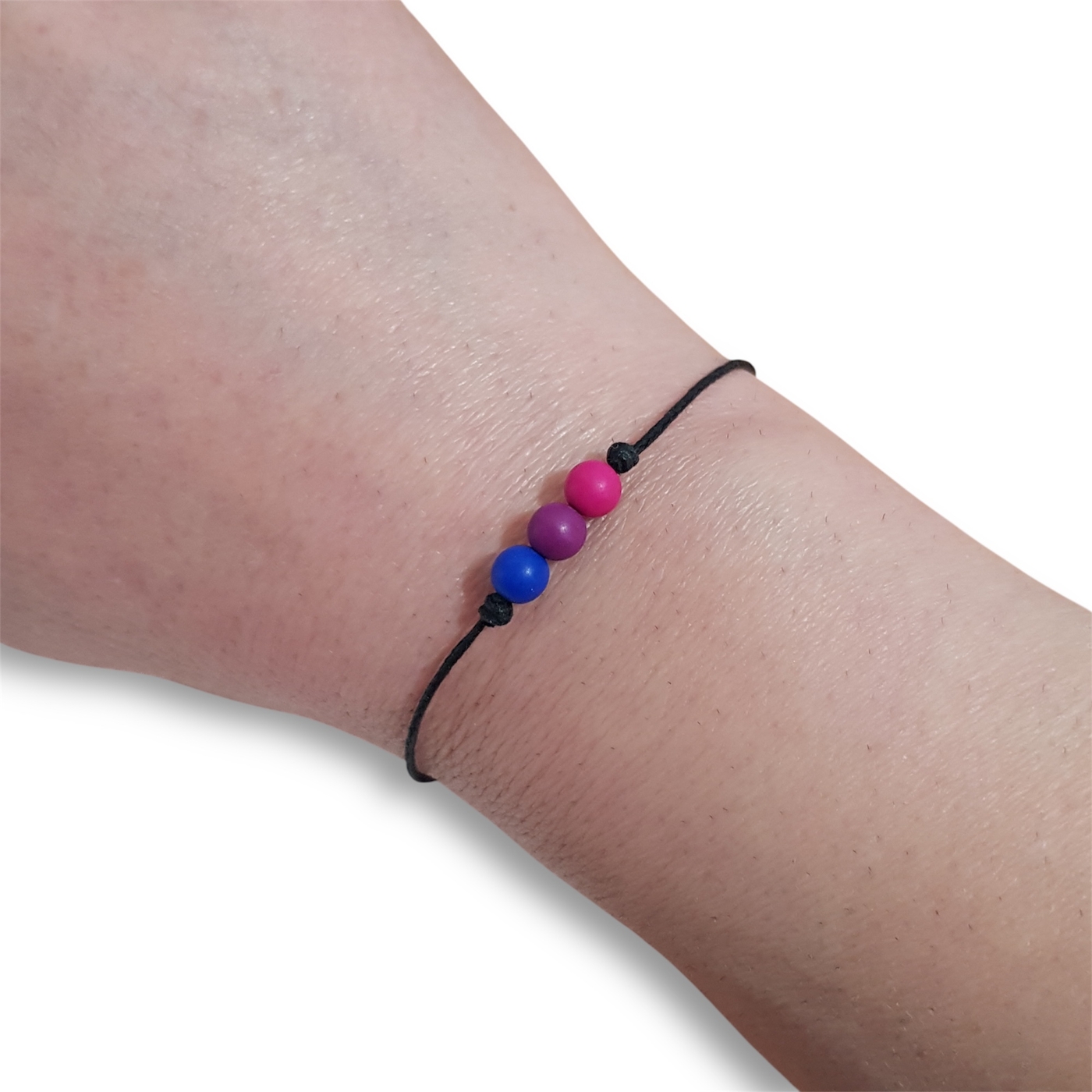 Handmade bisexual bracelet in the bi pride flag colours of pink, purple, and blue.