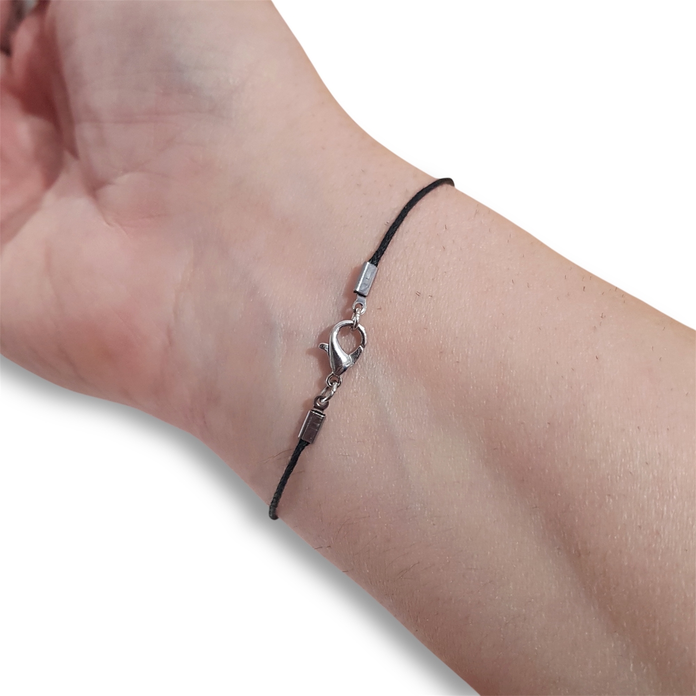 The beads are approximately 6mm in diameter and are handmade from polymer clay. The bracelet is made from 1mm waxed cotton, and closure is via a lobster clasp.