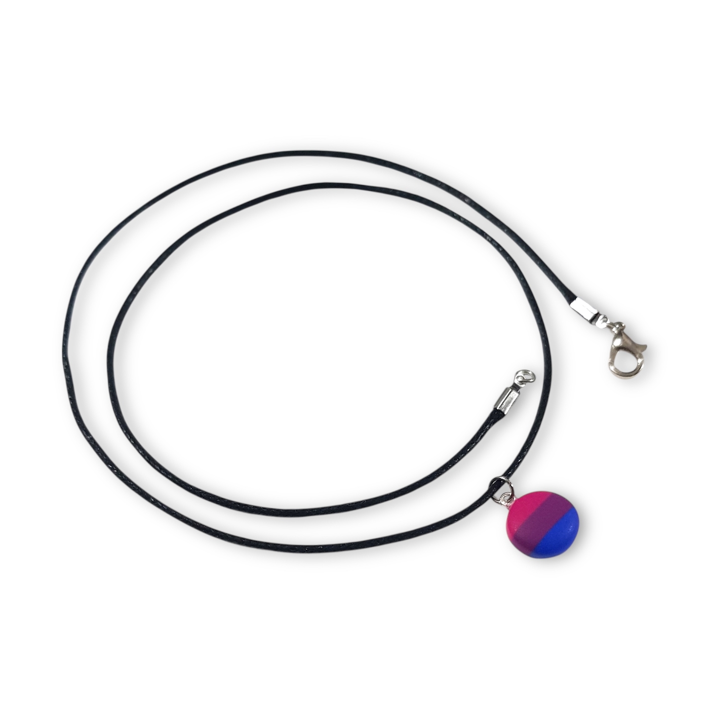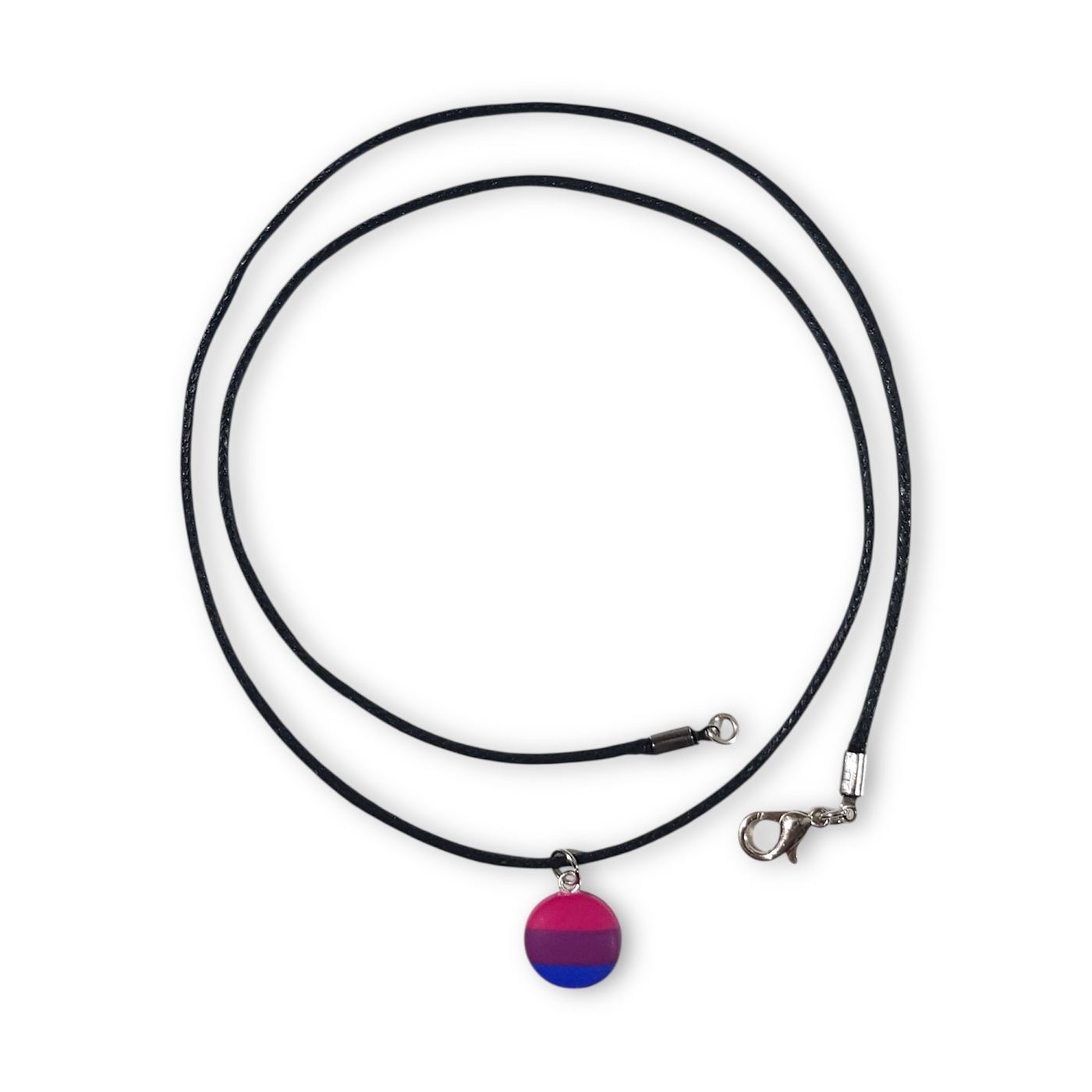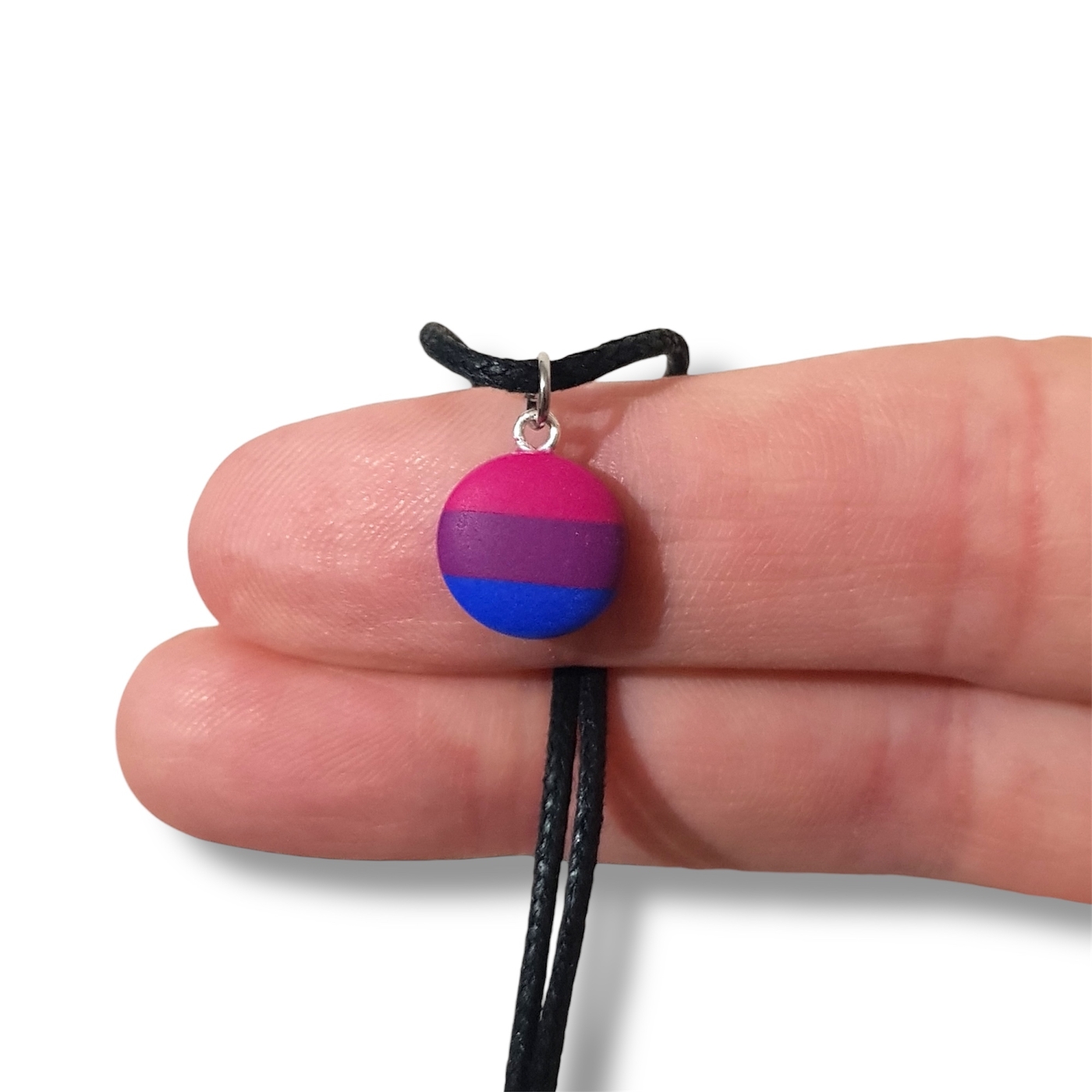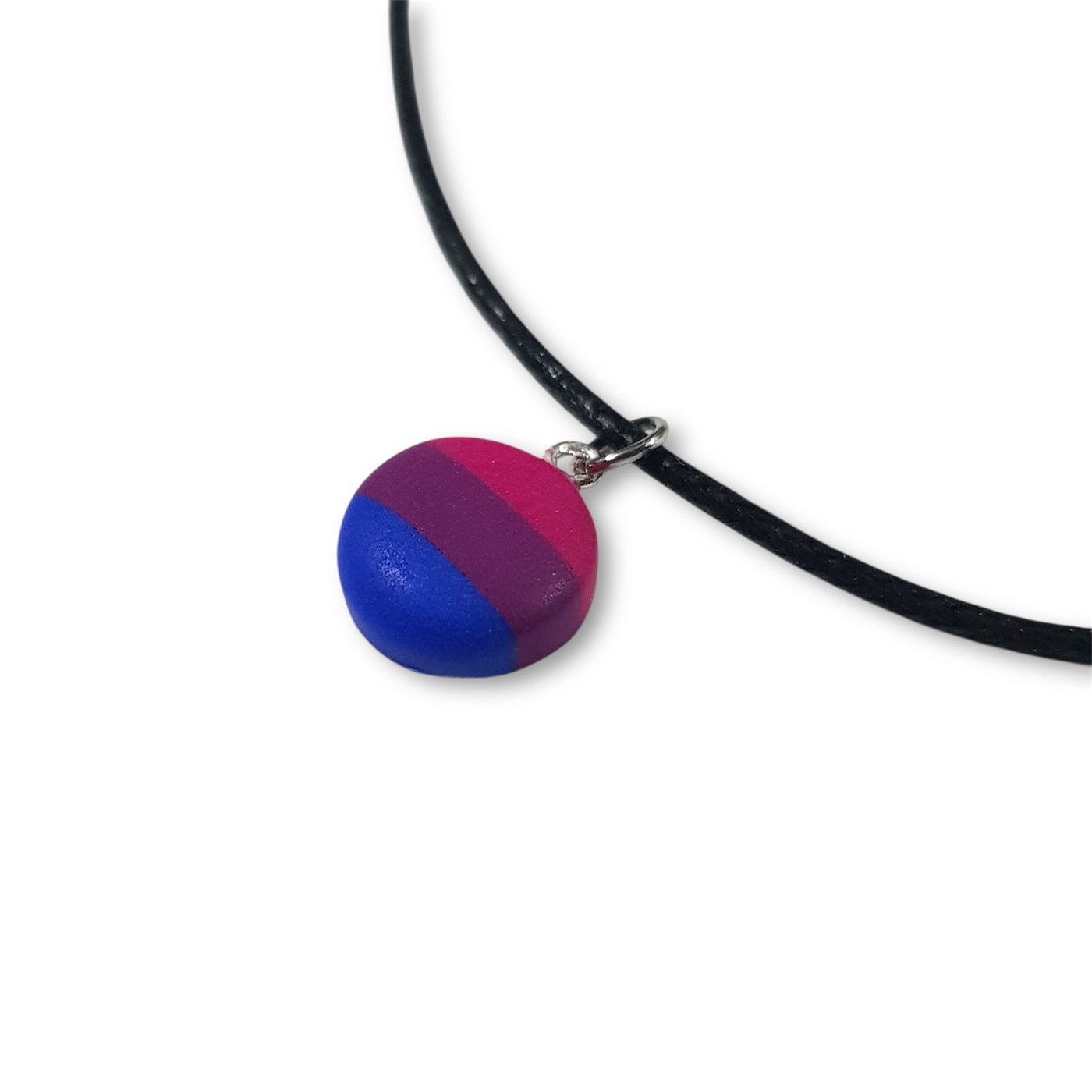 Bisexual necklace in the bisexual pride flag colours of pink, purple, and blue.