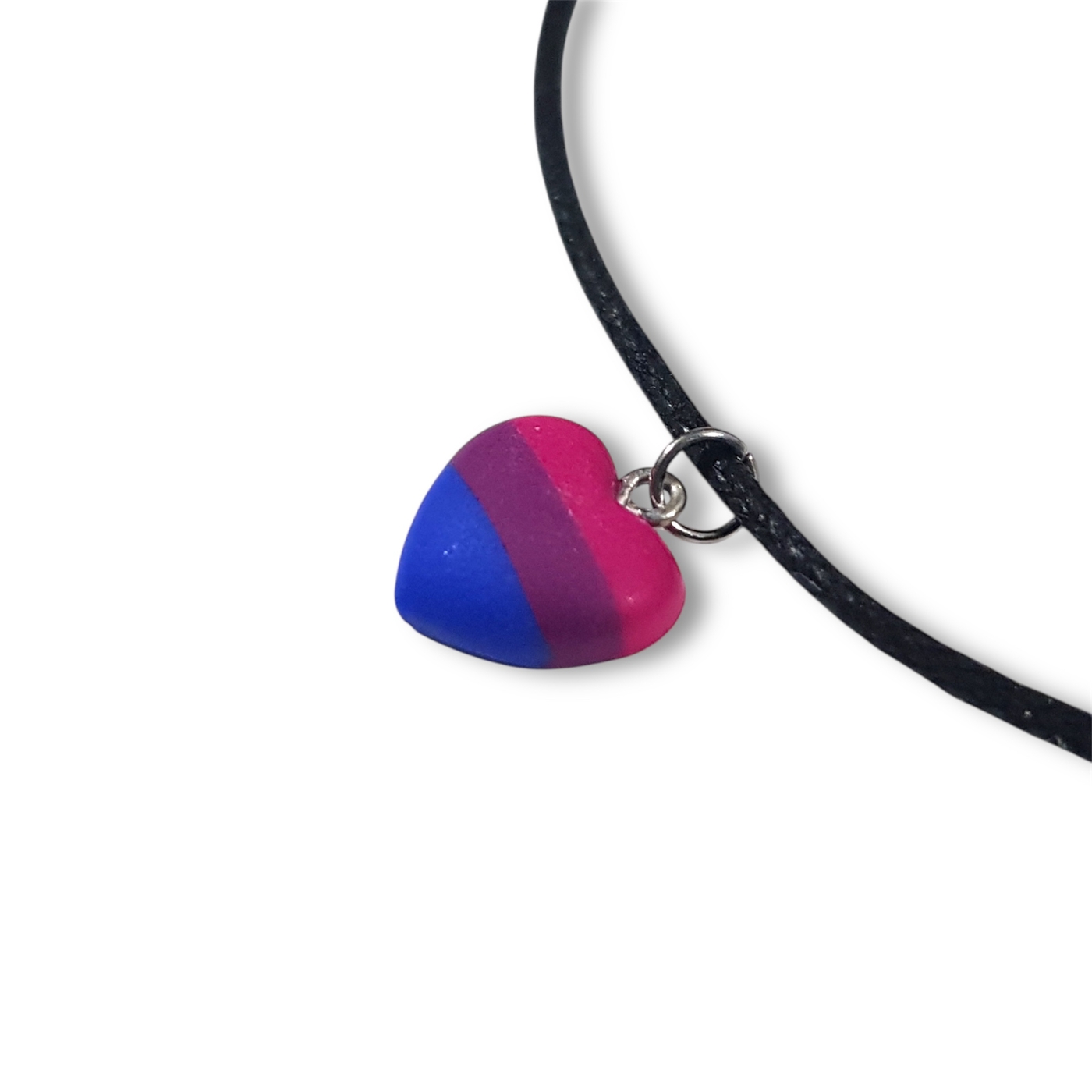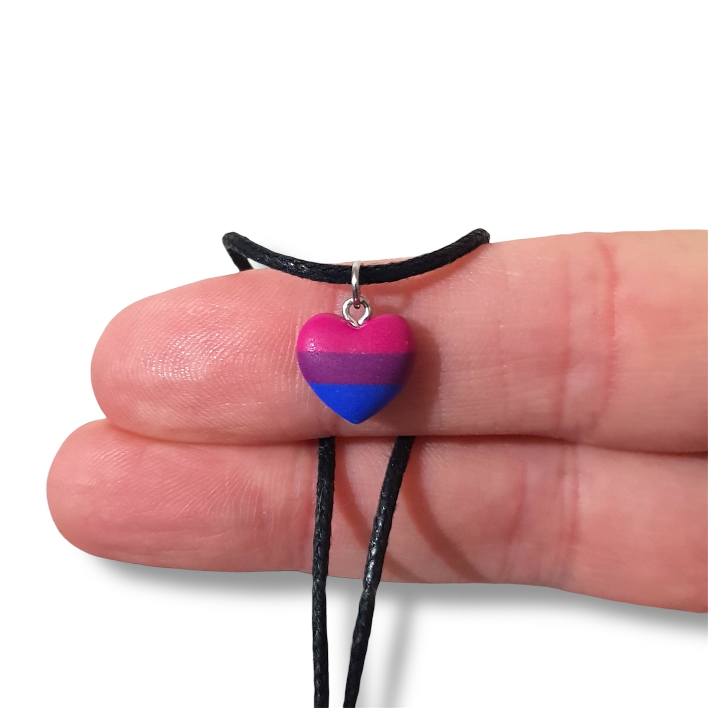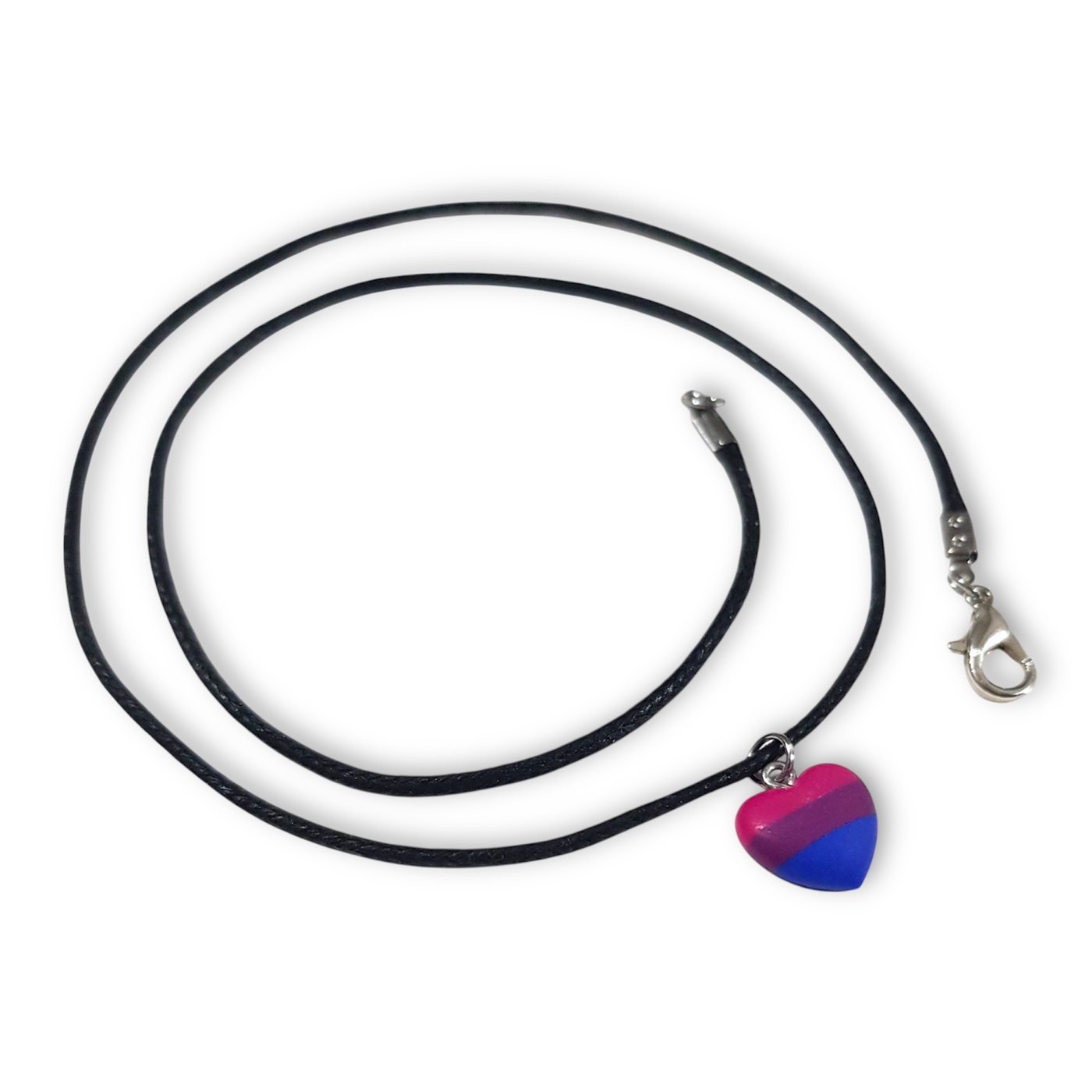 Bisexual pride flag necklace in the bisexual pride flag colours of pink, purple, and blue.