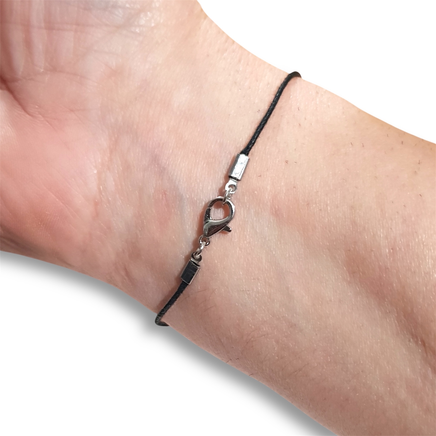 The beads are approximately 6mm in diameter and are handmade from polymer clay. The bracelet is made from 1mm waxed cotton, and closure is via a lobster clasp.