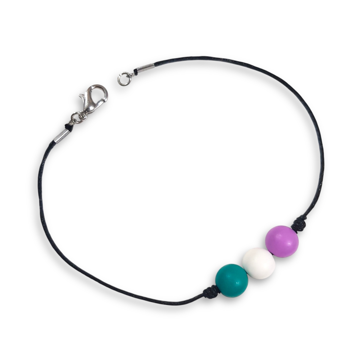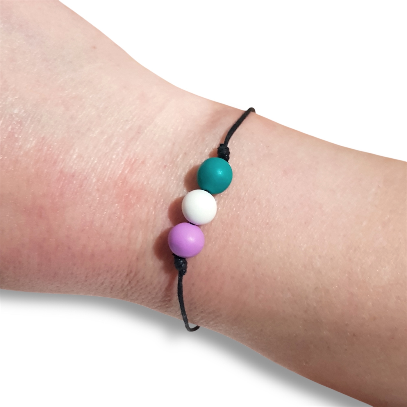 Genderqueer bracelet in the genderqueer pride flag colours of lavender, white, and green.