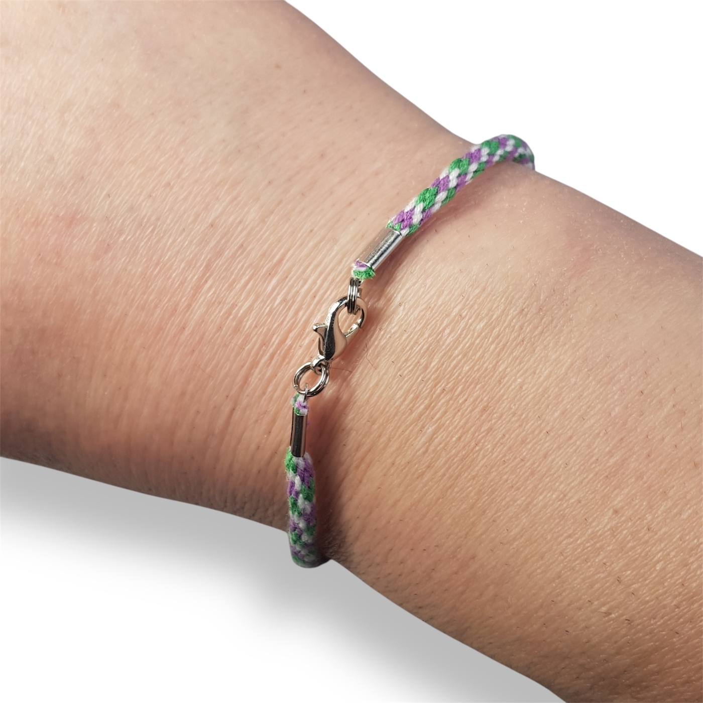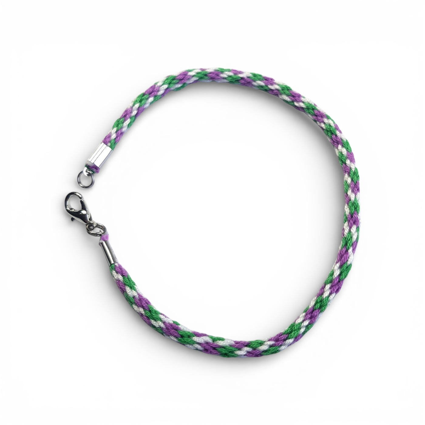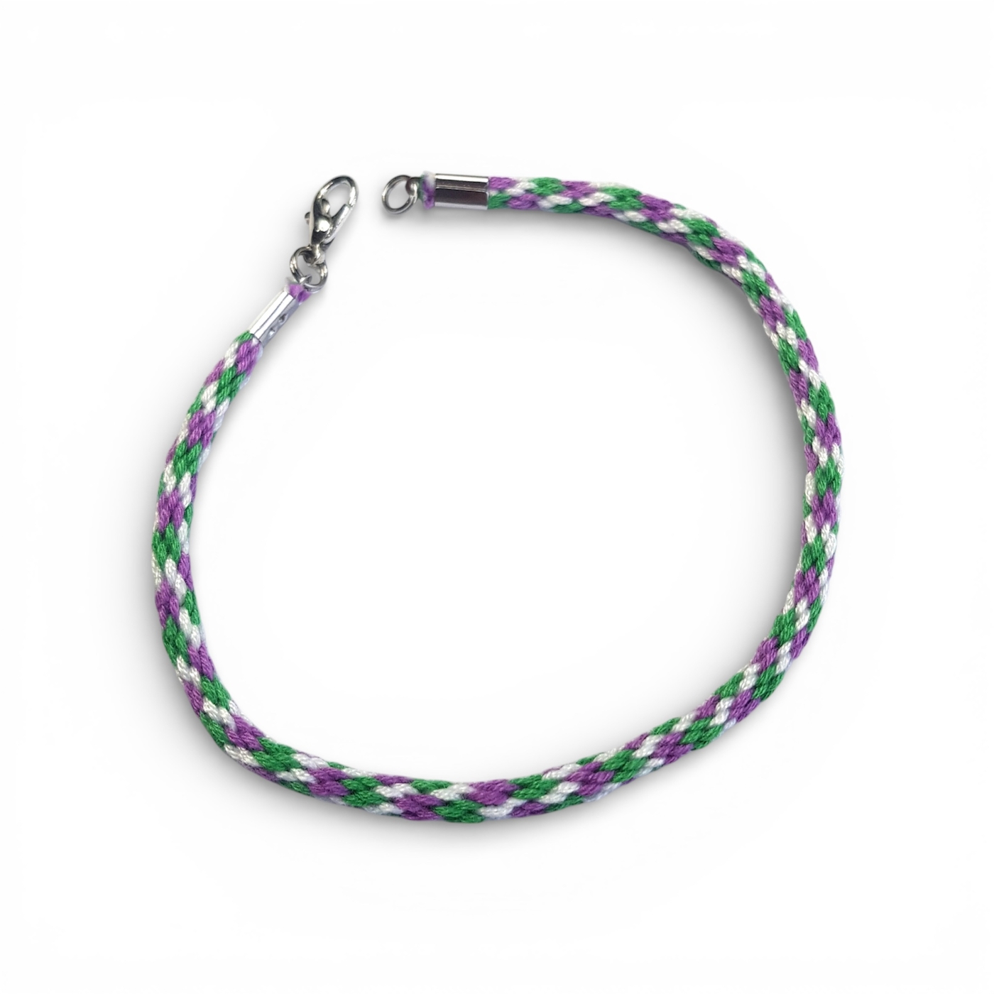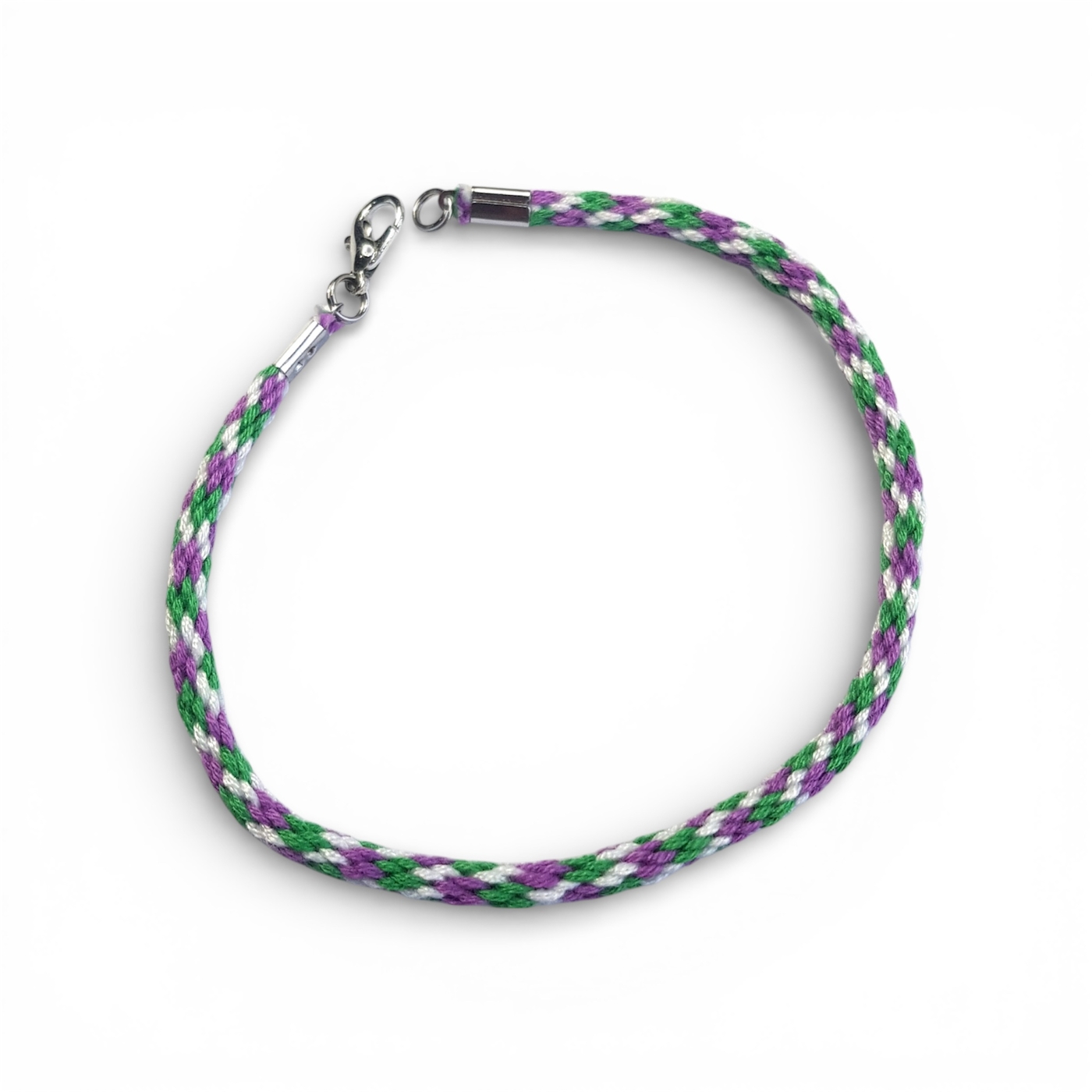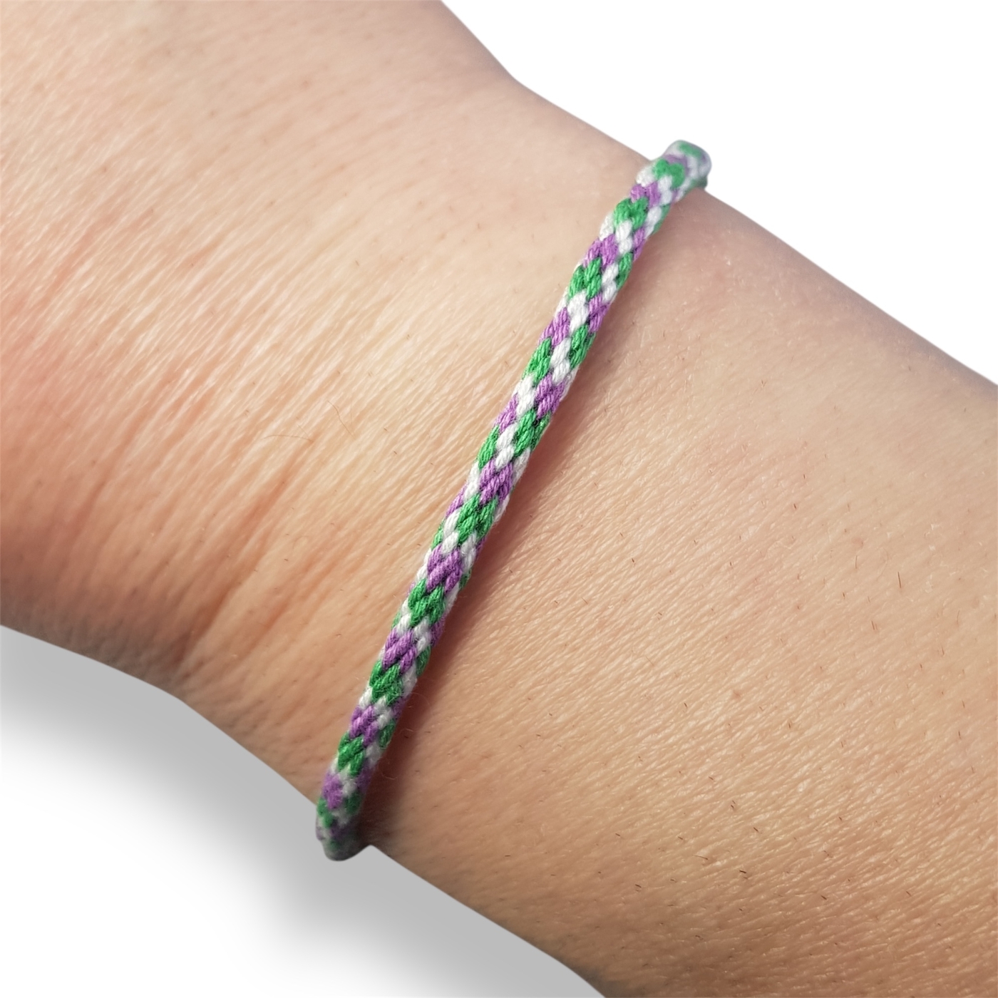 Handmade genderqueer braided bracelet in the flag colours of lavender, white, and light green.
