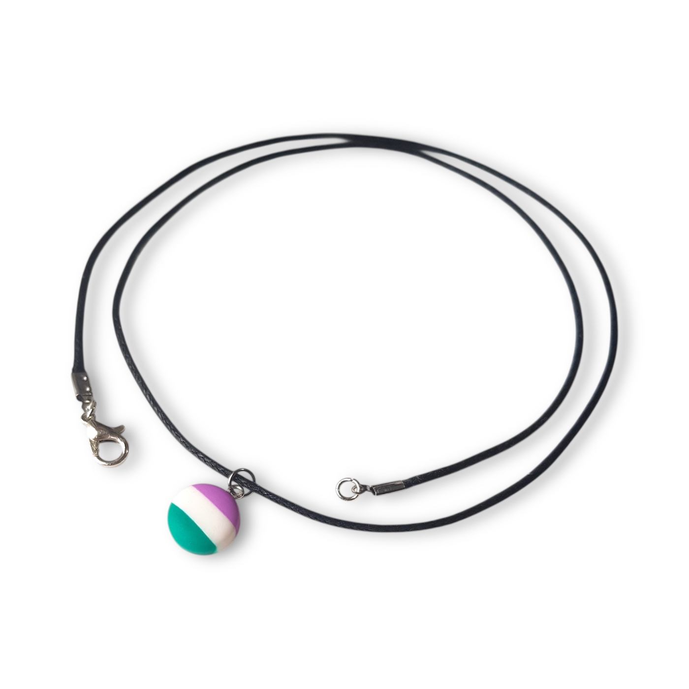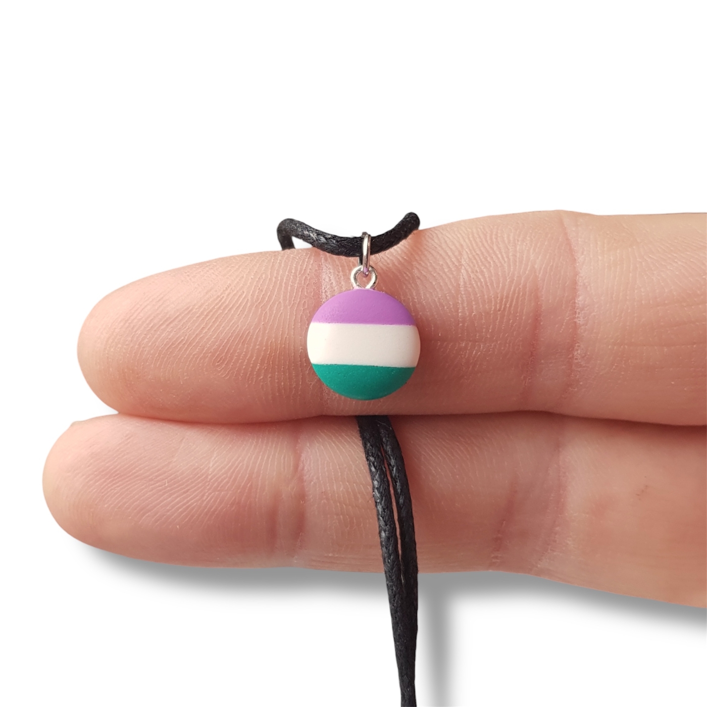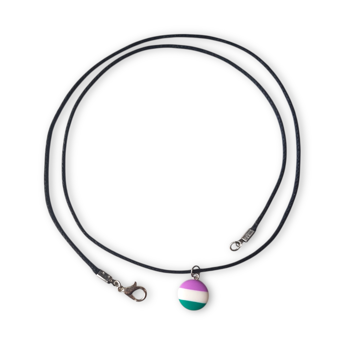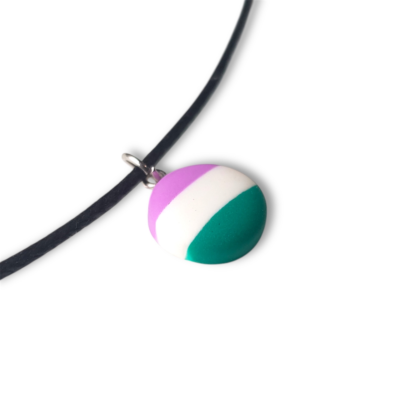 A cute button shaped necklace in the genderqueer pride flag colours of lavender, white, and green.