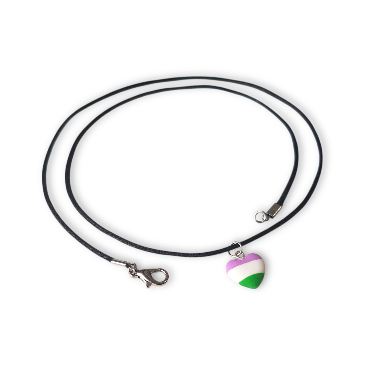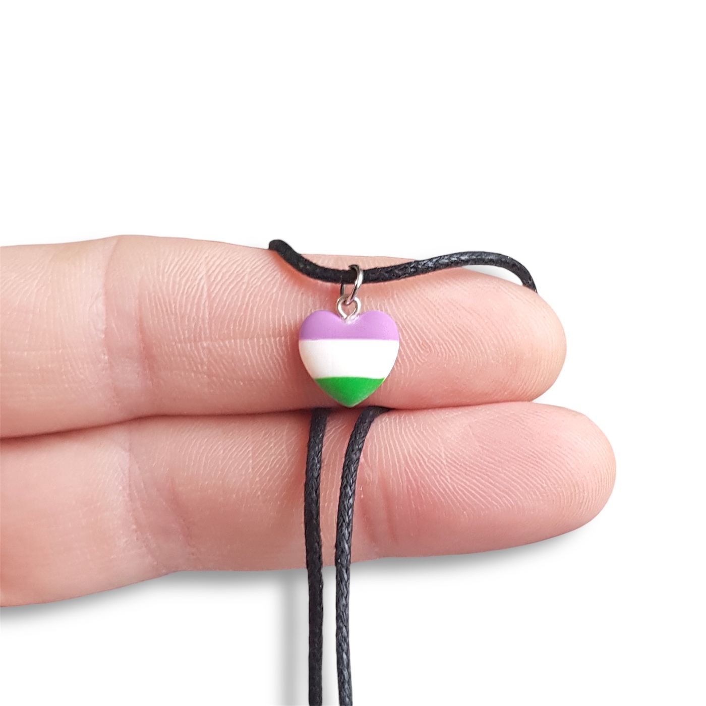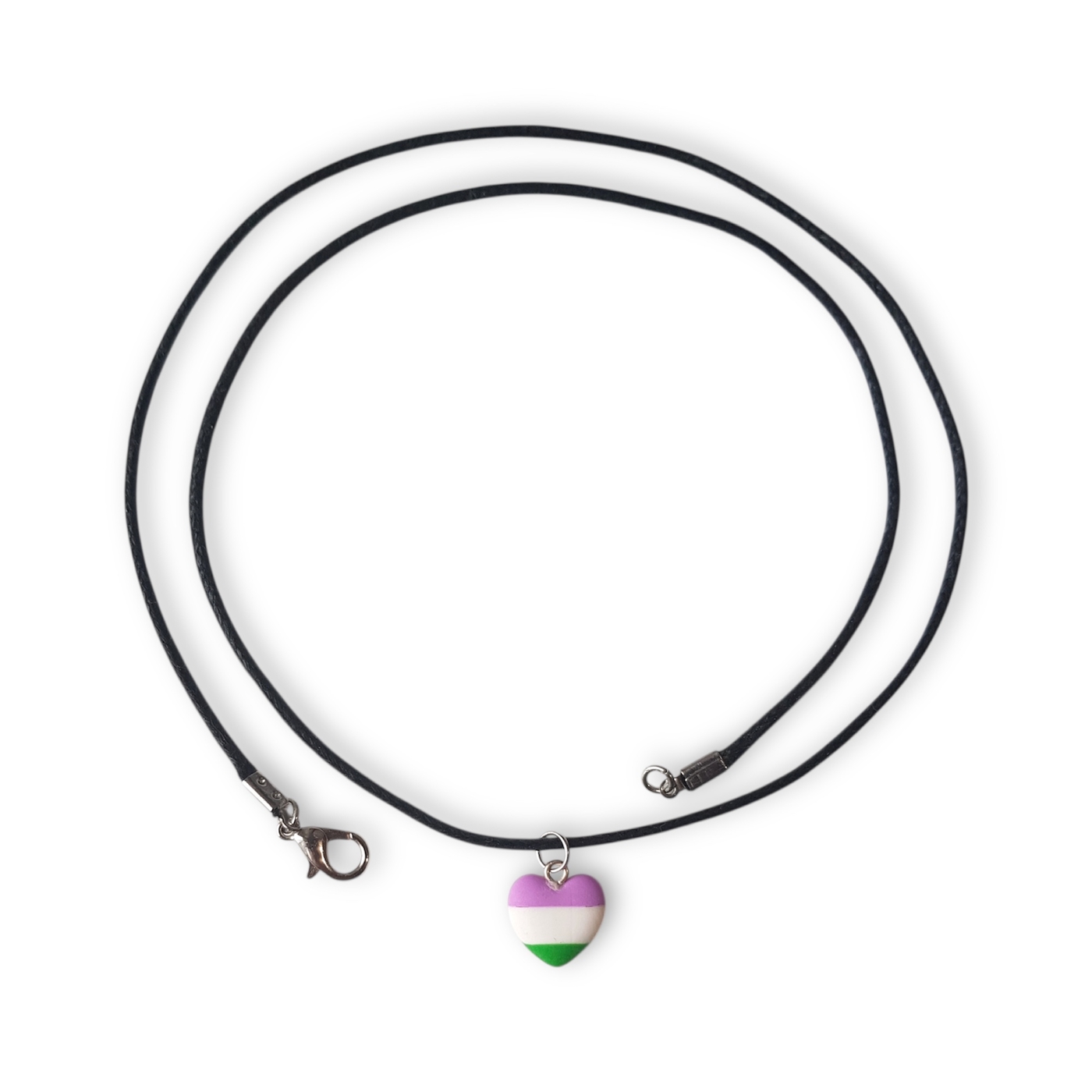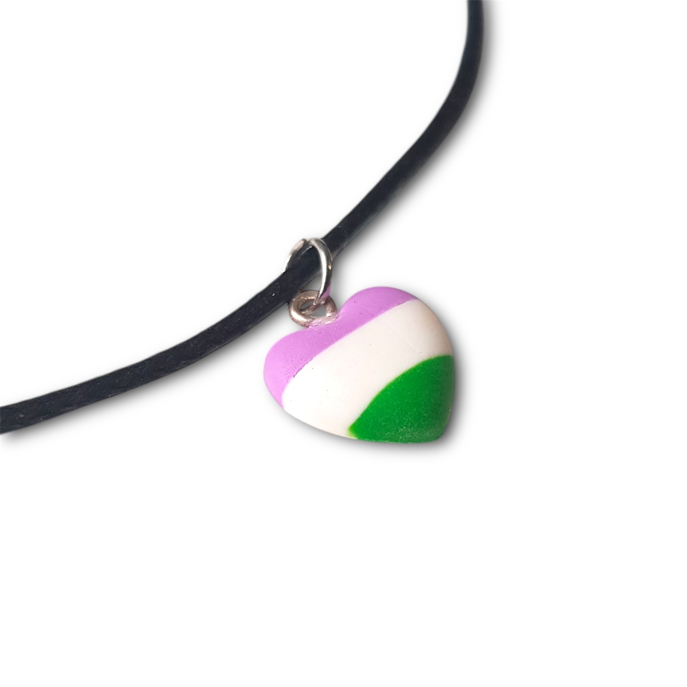 A cute heart shaped necklace in the genderqueer pride flag colours of lavender, white, and green.