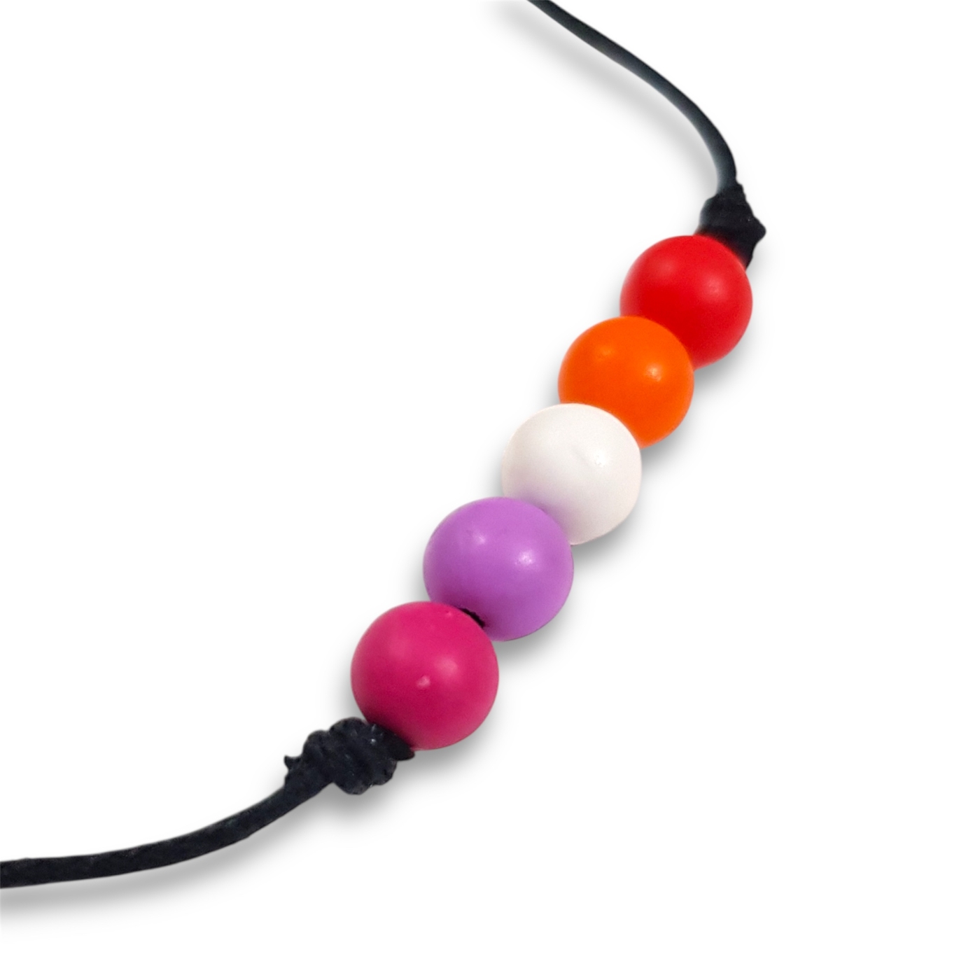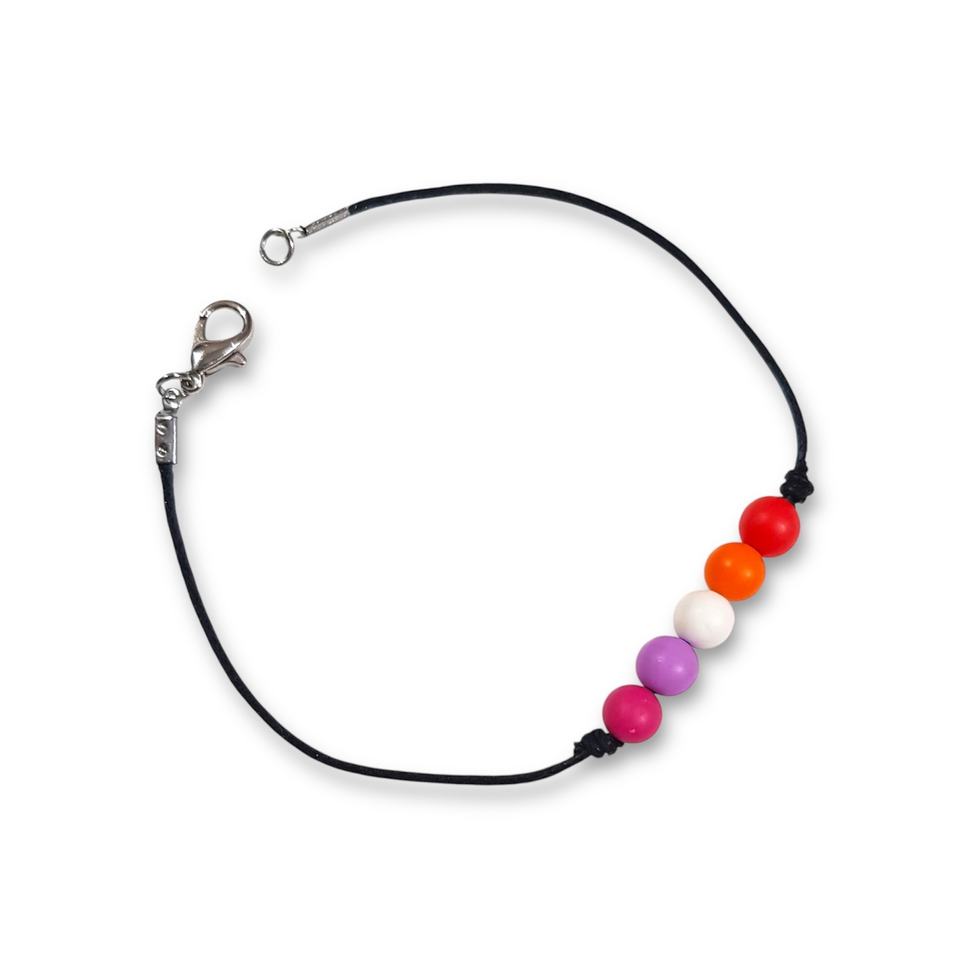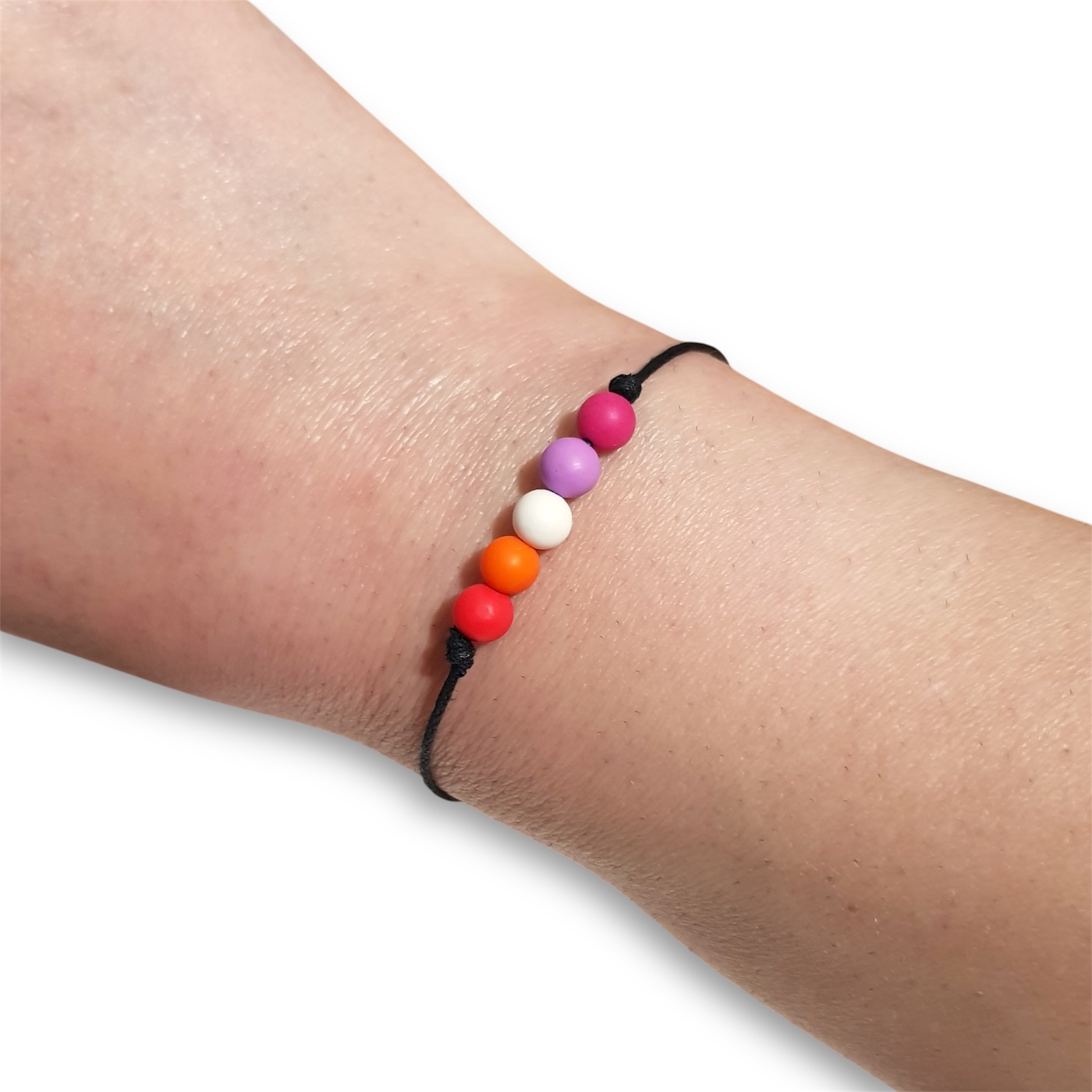 Lesbian pride bracelet in the lesbian pride flag colours of dark orange, light orange, white, pink, and dark pink.