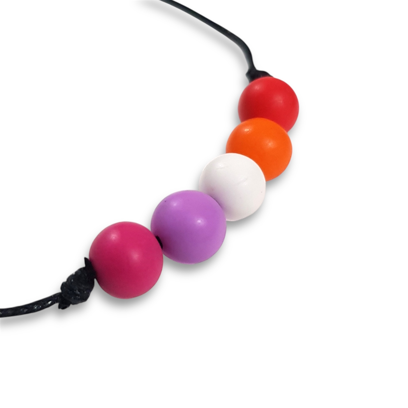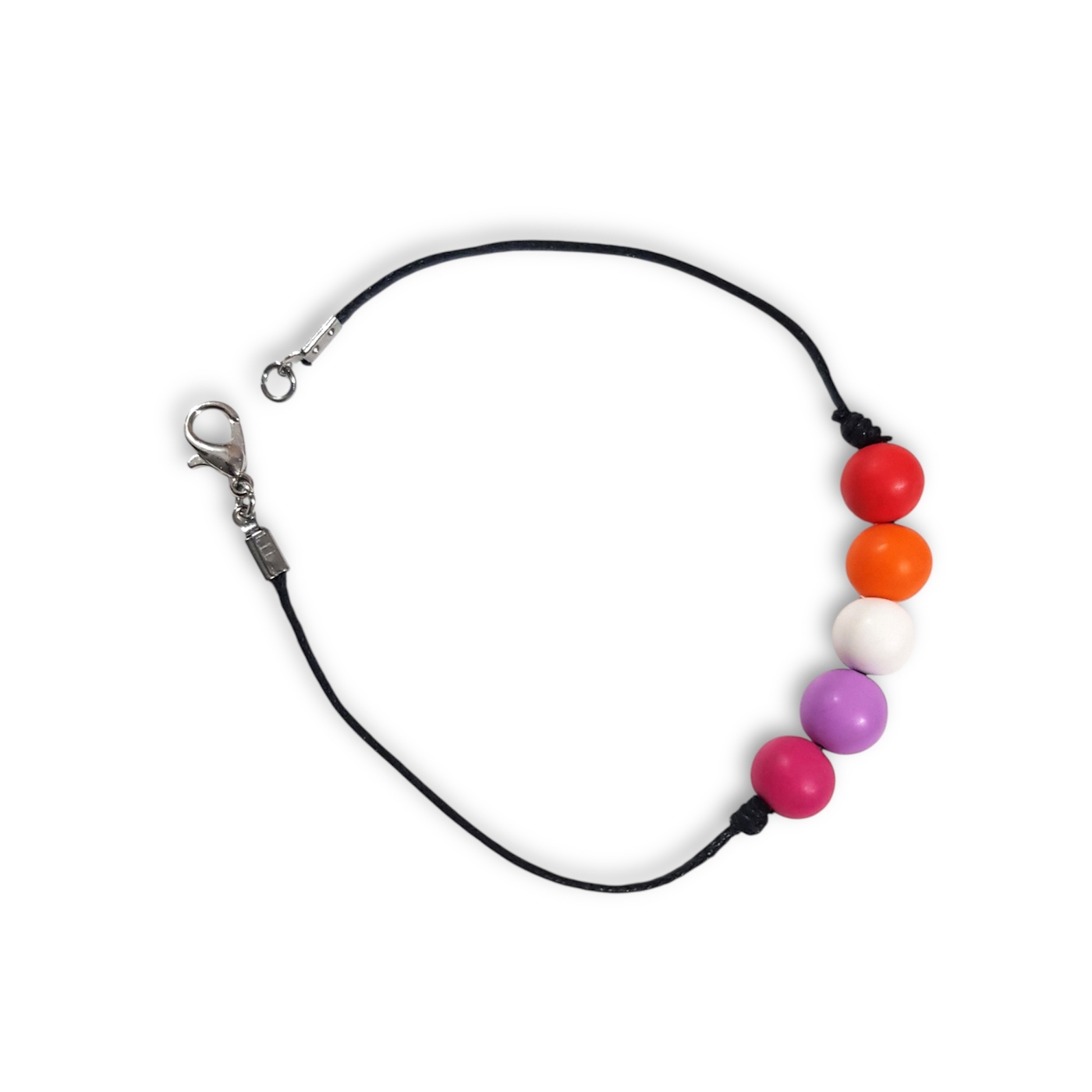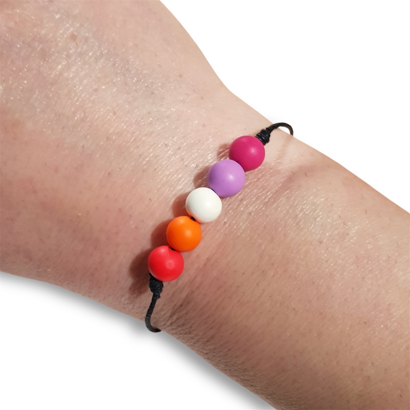 Lesbian pride flag bracelet in the lesbian flag colours of dark orange, light orange, white, pink, and dark pink.