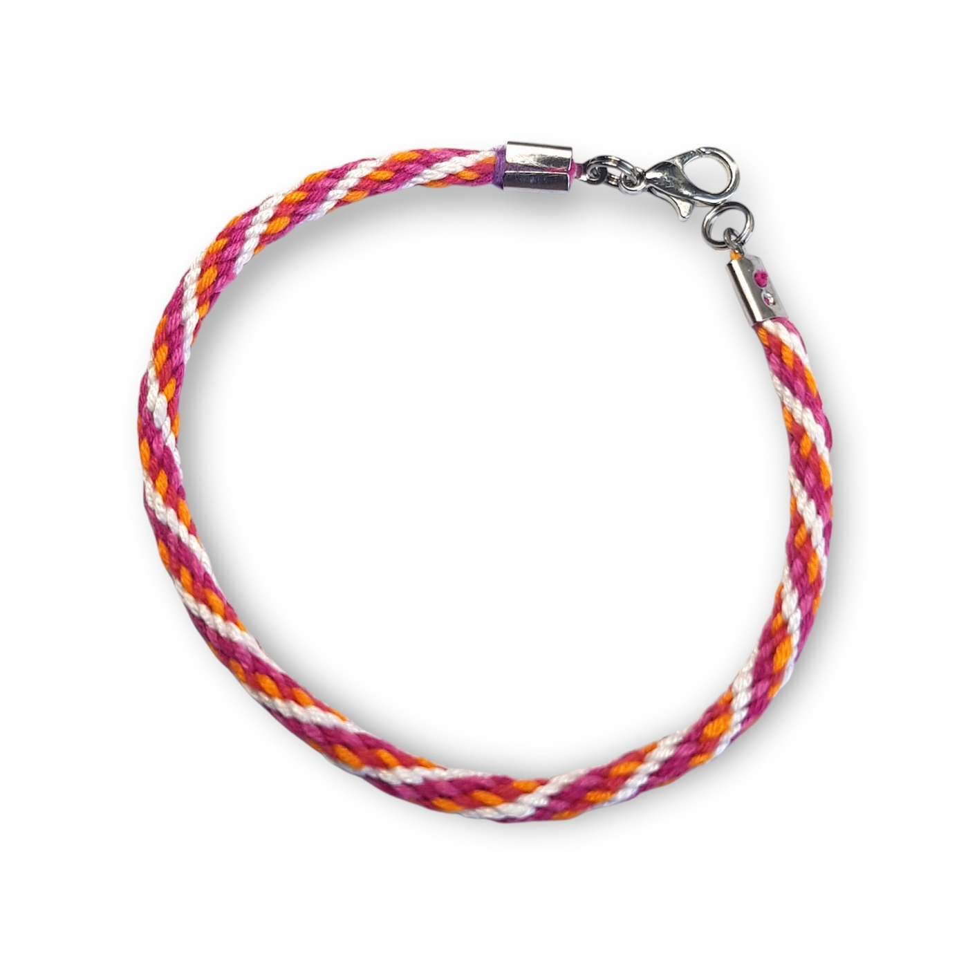 Handmade lesbian braided bracelet in the flag colours of dark orange, light orange, white, pink, and dark pink.