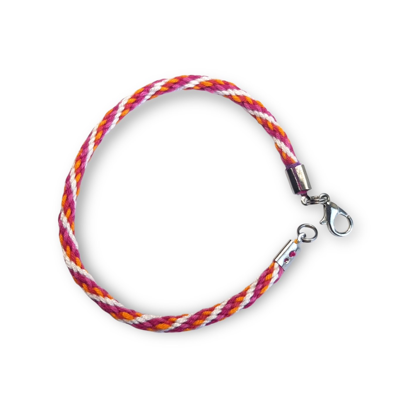 Handmade lesbian braided bracelet in the flag colours of dark orange, light orange, white, pink, and dark pink.