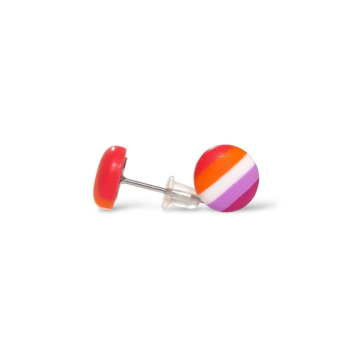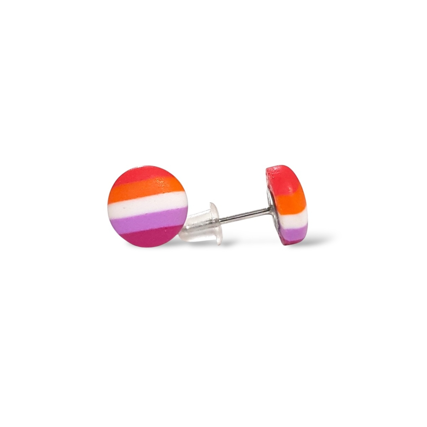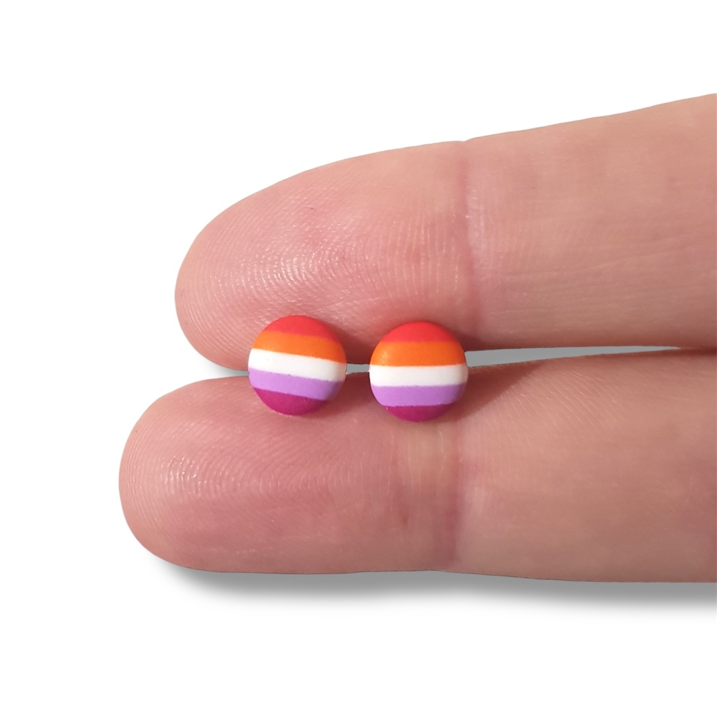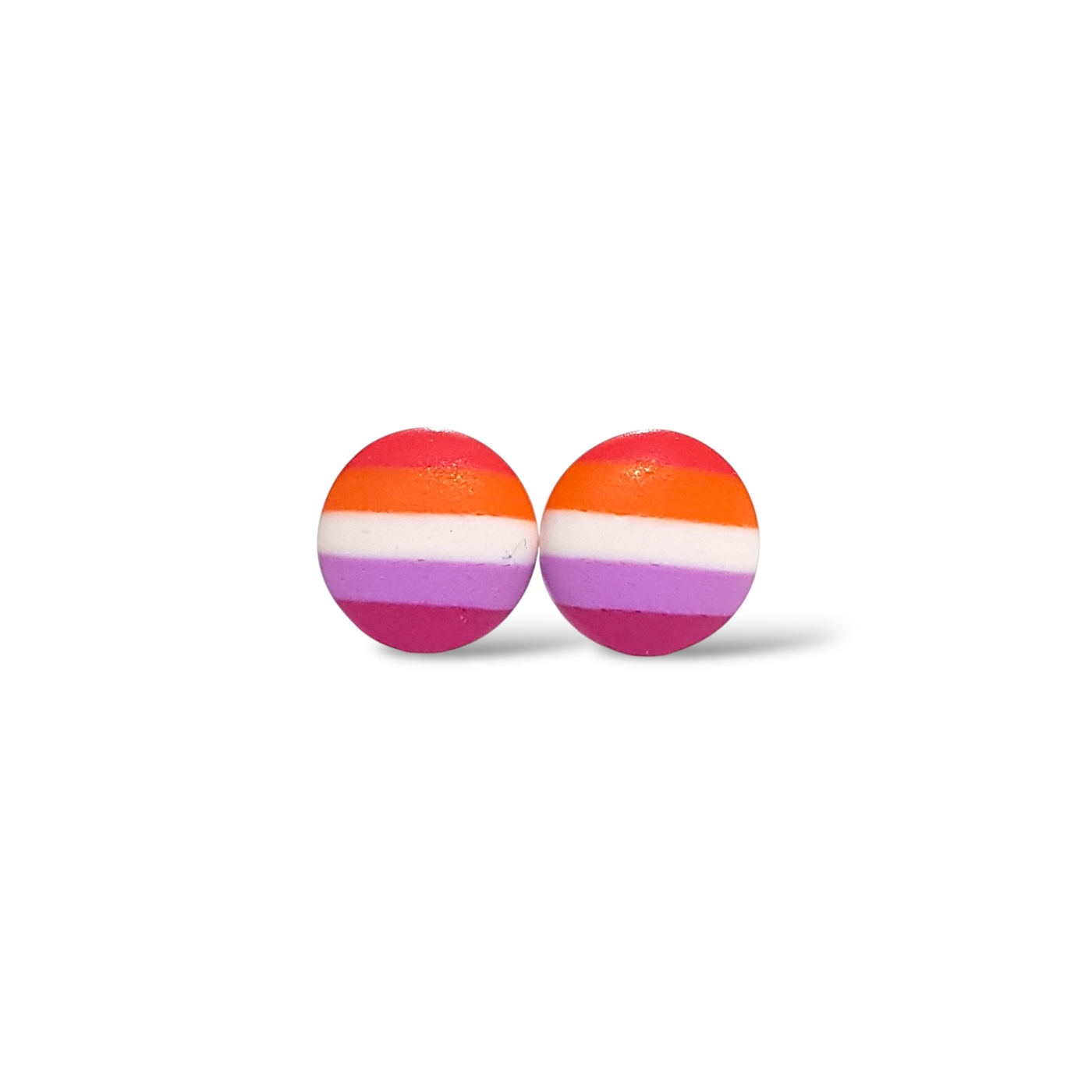 A beautiful pair of lesbian pride flag button earrings. Handmade in polymer clay in the lesbian pride flag colours of dark orange, light orange, white, light pink, and magenta. Featuring hypoallergenic stainless steel posts and silicone rubber stoppers.