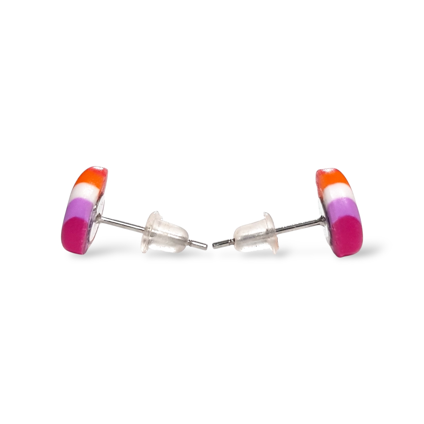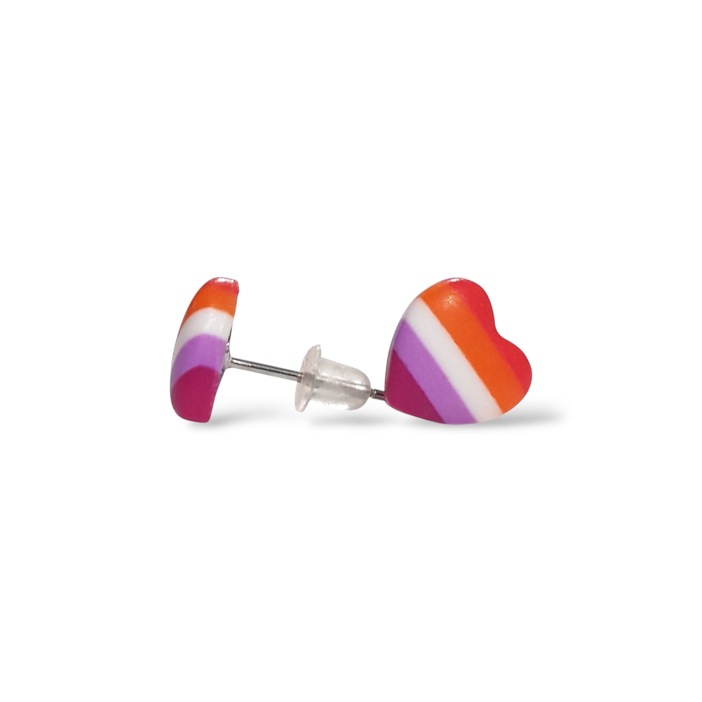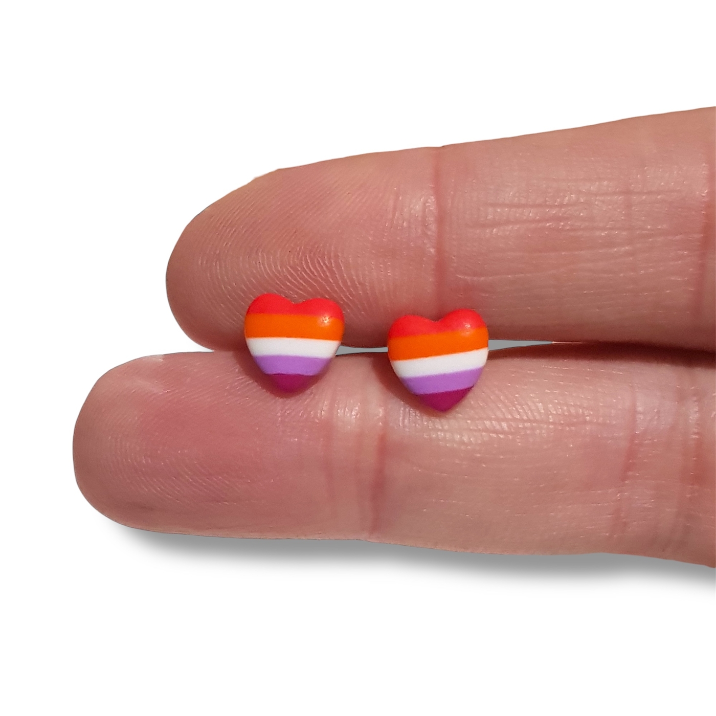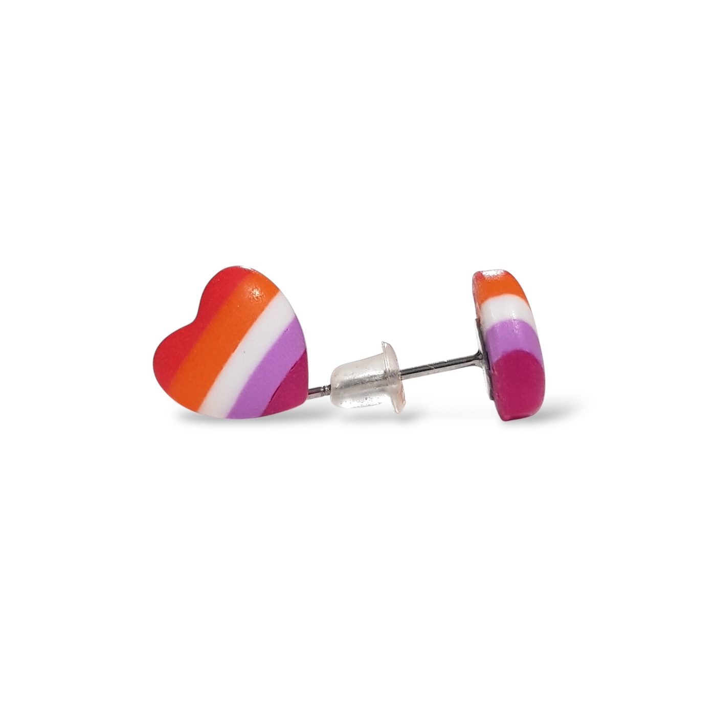Lesbian pride flag heart shaped stud earrings, handmade in polymer clay in the lesbian pride flag colours of dark orange, light orange, white, light pink, and magenta. Featuring hypoallergenic stainless steel posts and silicone rubber stoppers.