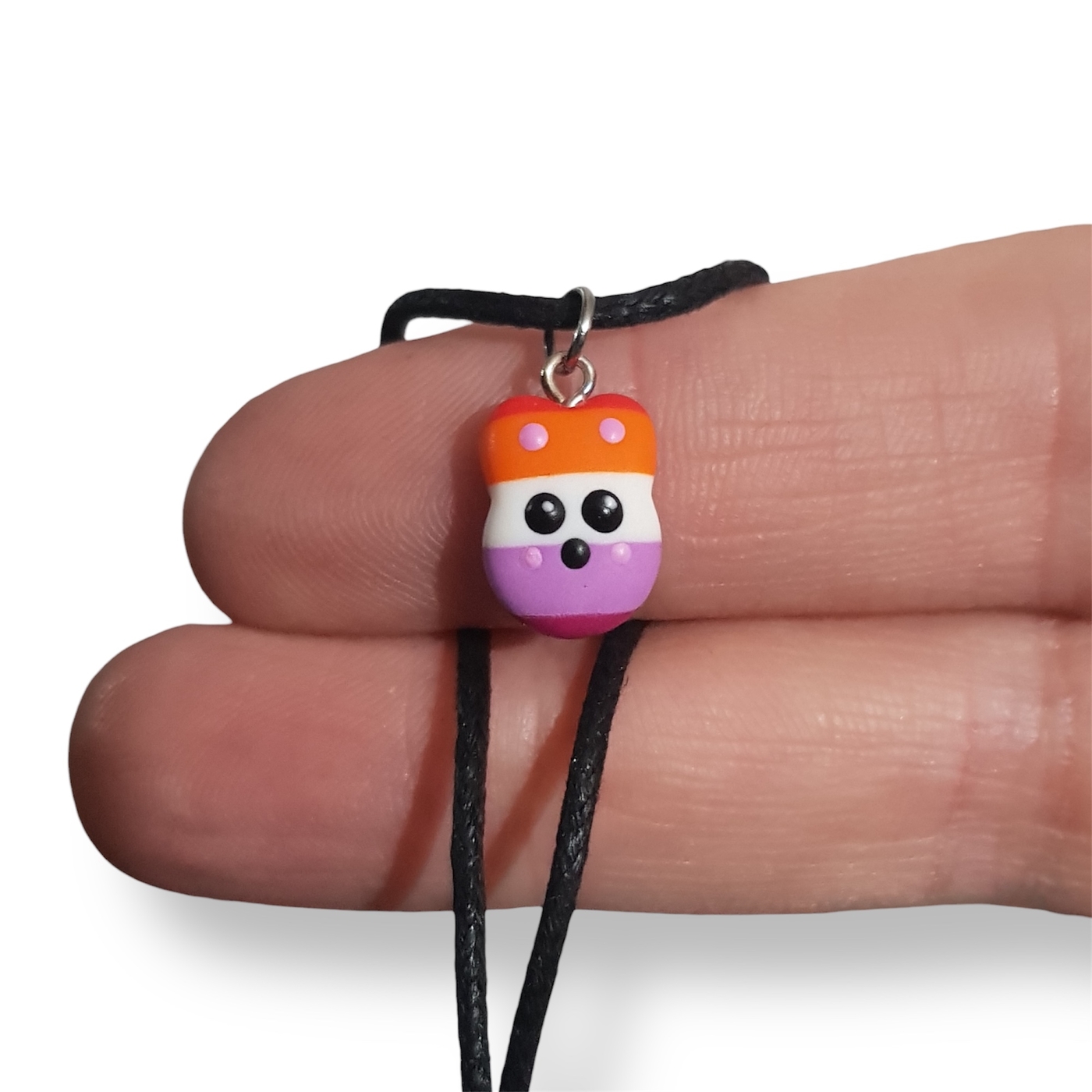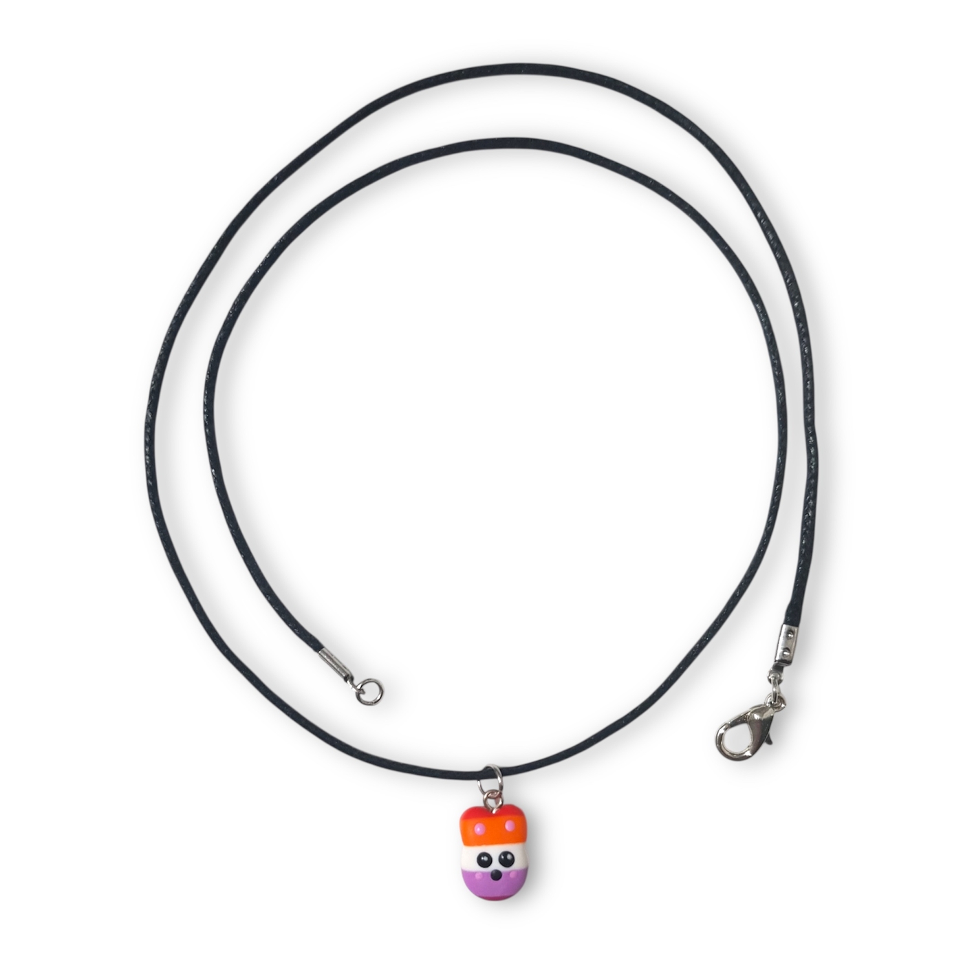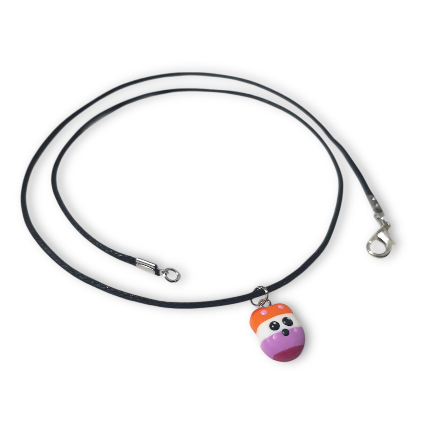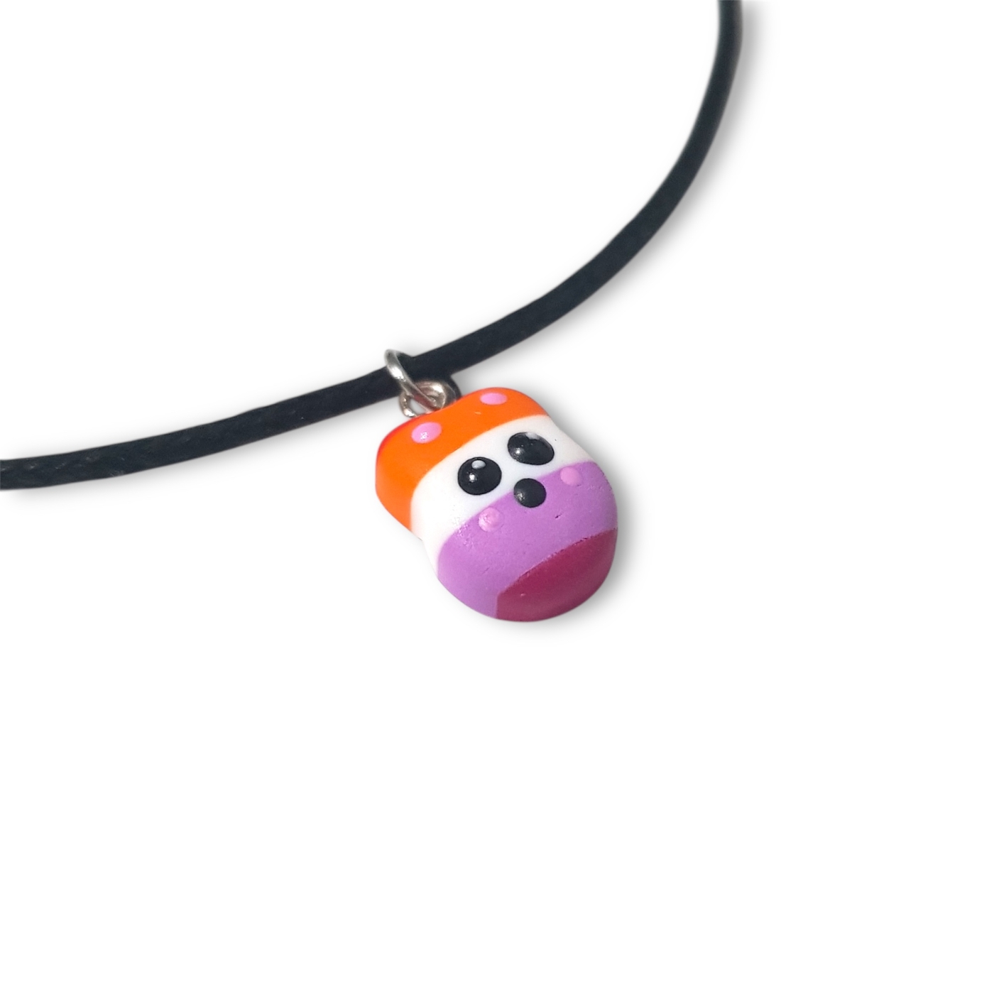 A cute kawaii rabbit shaped necklace in the lesbian pride flag colours of dark orange, light orange, white, pink, and dark pink.