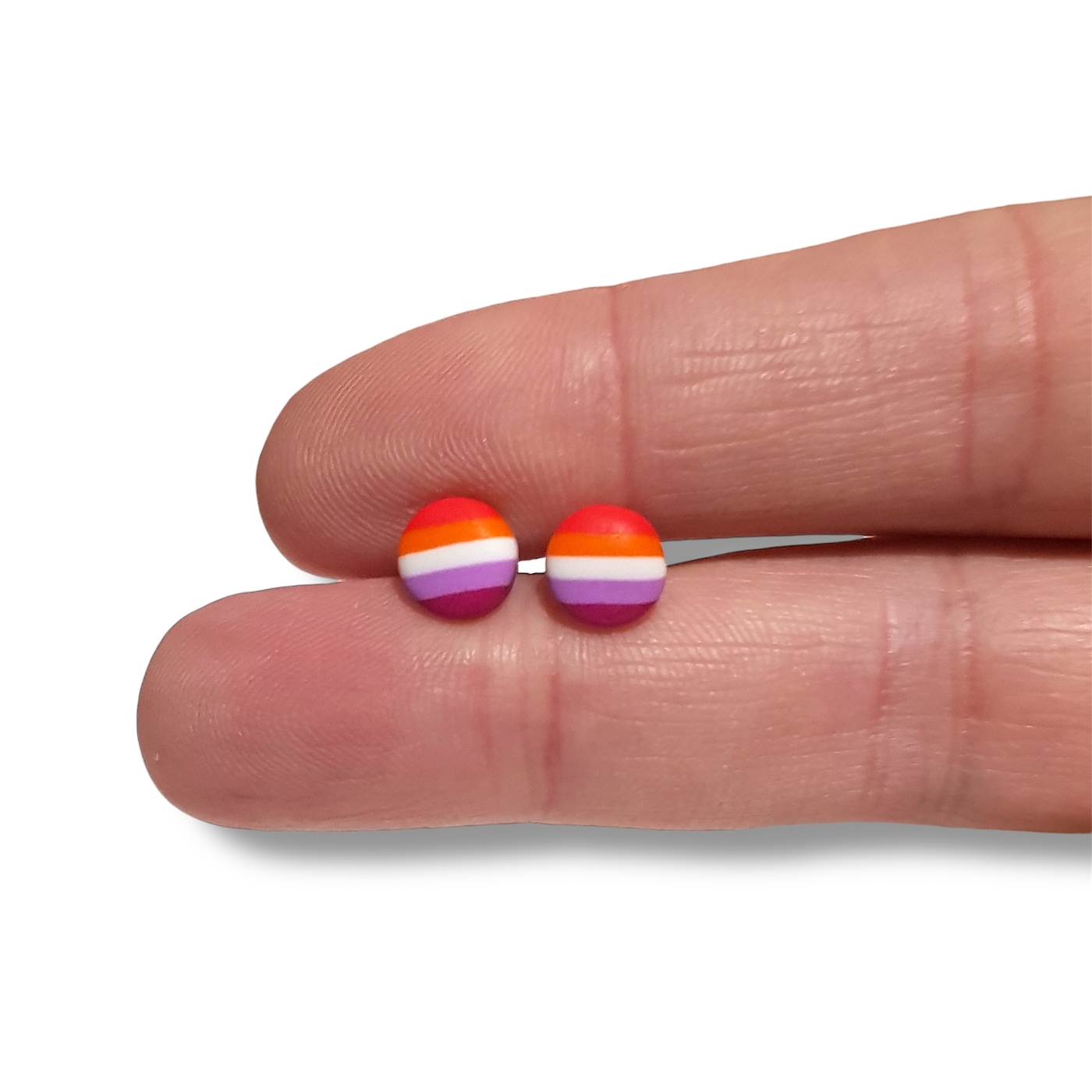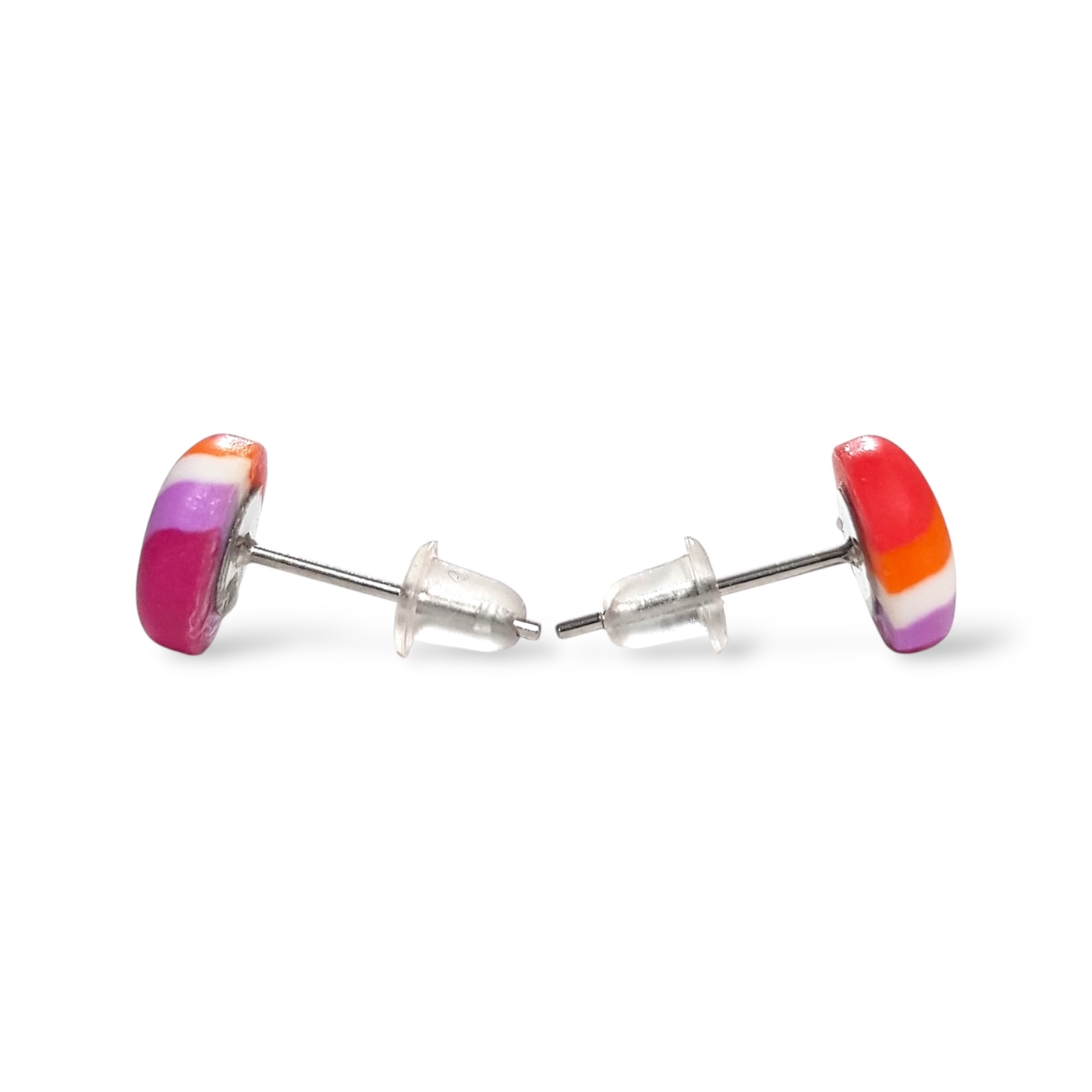 Lesbian pride flag round stud earrings, handmade in polymer clay in the lesbian pride flag colours of dark orange, light orange, white, light pink, and magenta. Featuring hypoallergenic stainless steel posts and silicone rubber stoppers.