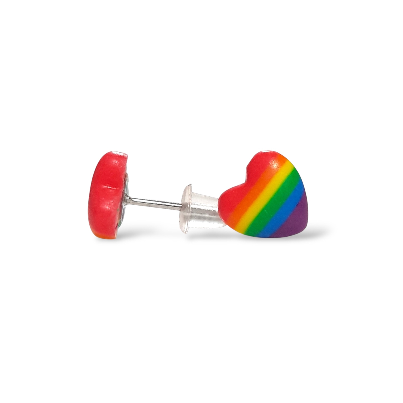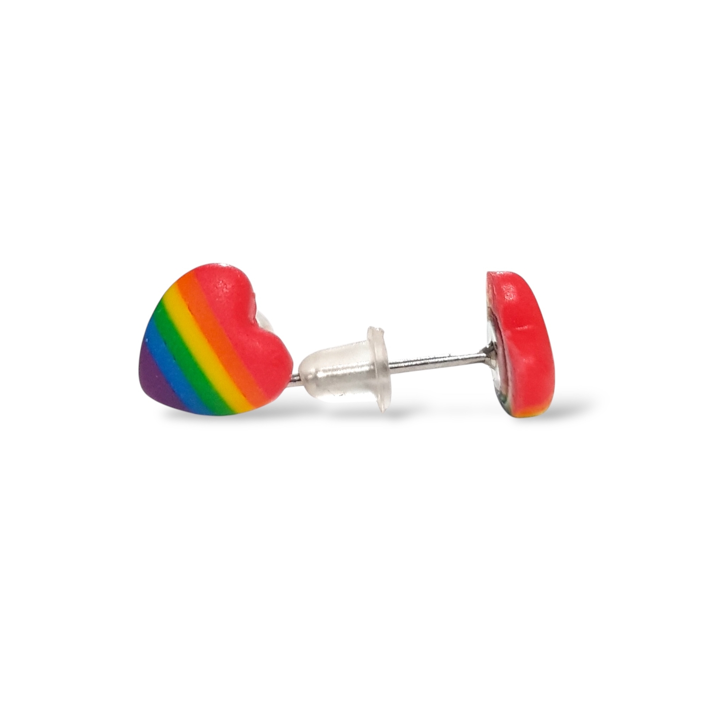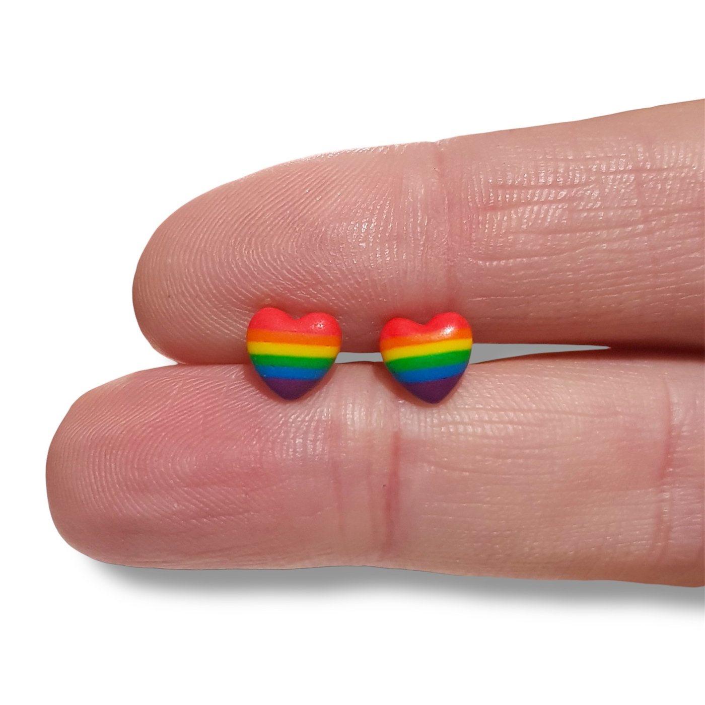 A beautiful pair of rainbow pride flag heart shaped earrings in the pride flag colours of red, orange, yellow, green, blue, and indigo. Handmade in polymer clay and featuring hypoallergenic stainless steel posts and silicone rubber stoppers.