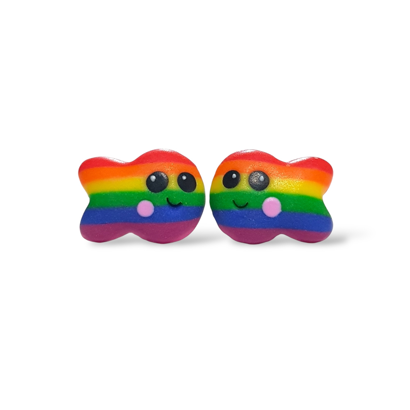 A beautiful pair of rainbow pride flag kawaii fish earrings in the lgtbq pride flag colours of red, orange, yellow, green, blue, and indigo. Handmade in polymer clay and featuring hypoallergenic stainless steel posts and silicone rubber stoppers.