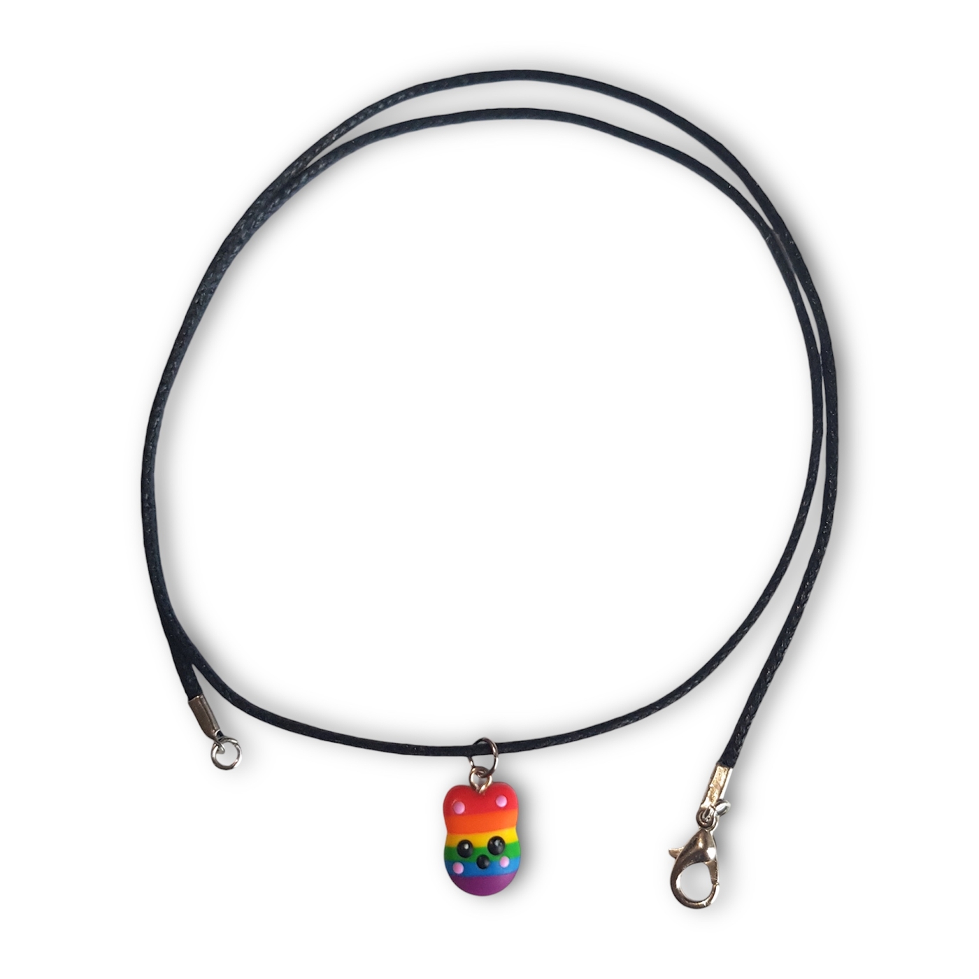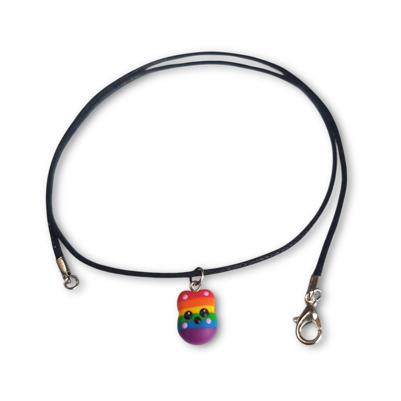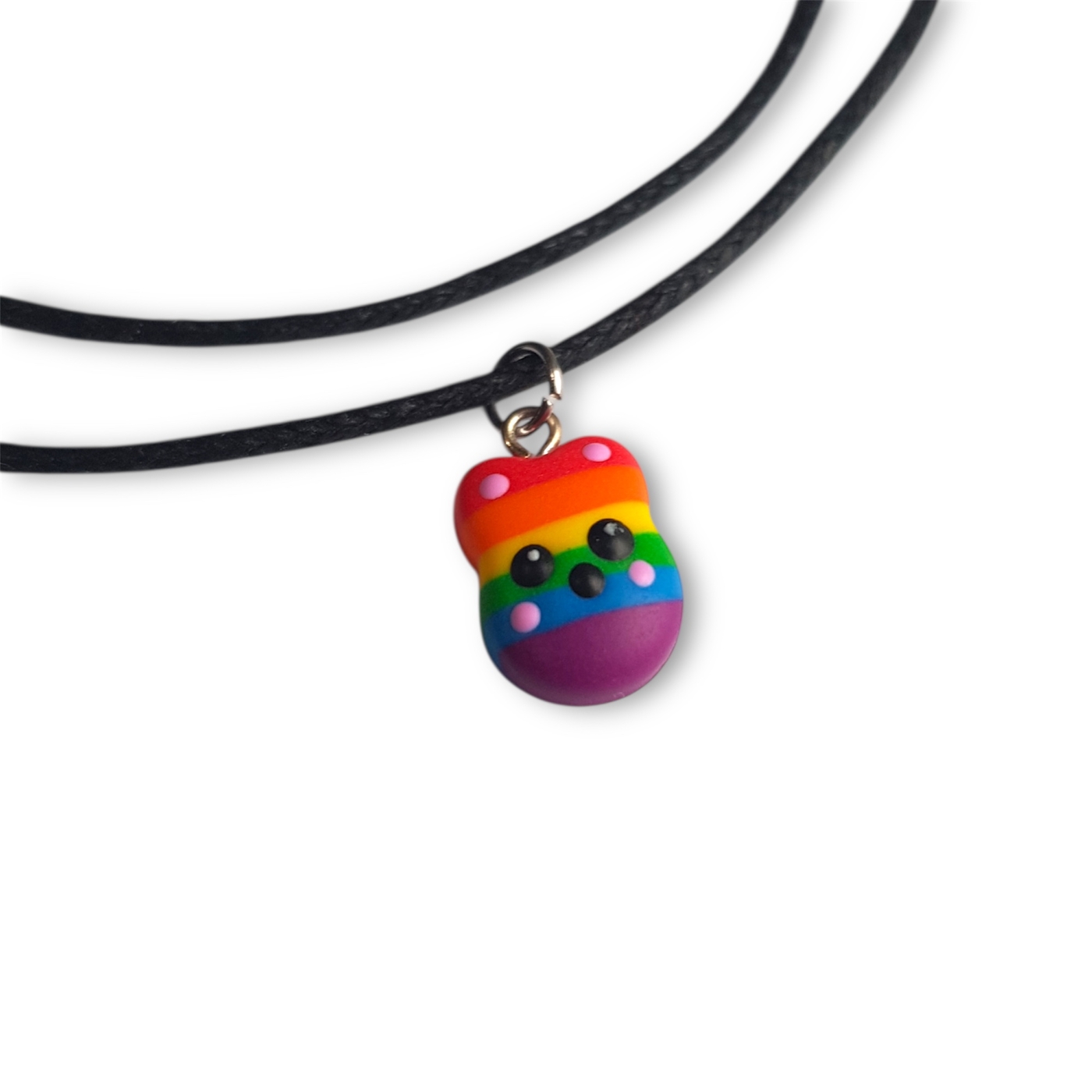 A cute kawaii rabbit necklace in the rainbow pride lgbtq flag colours of red, orange, yellow, green, blue, and indigo.