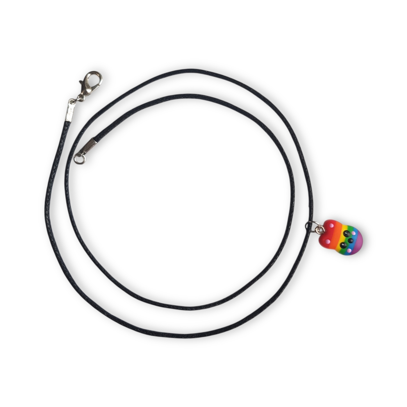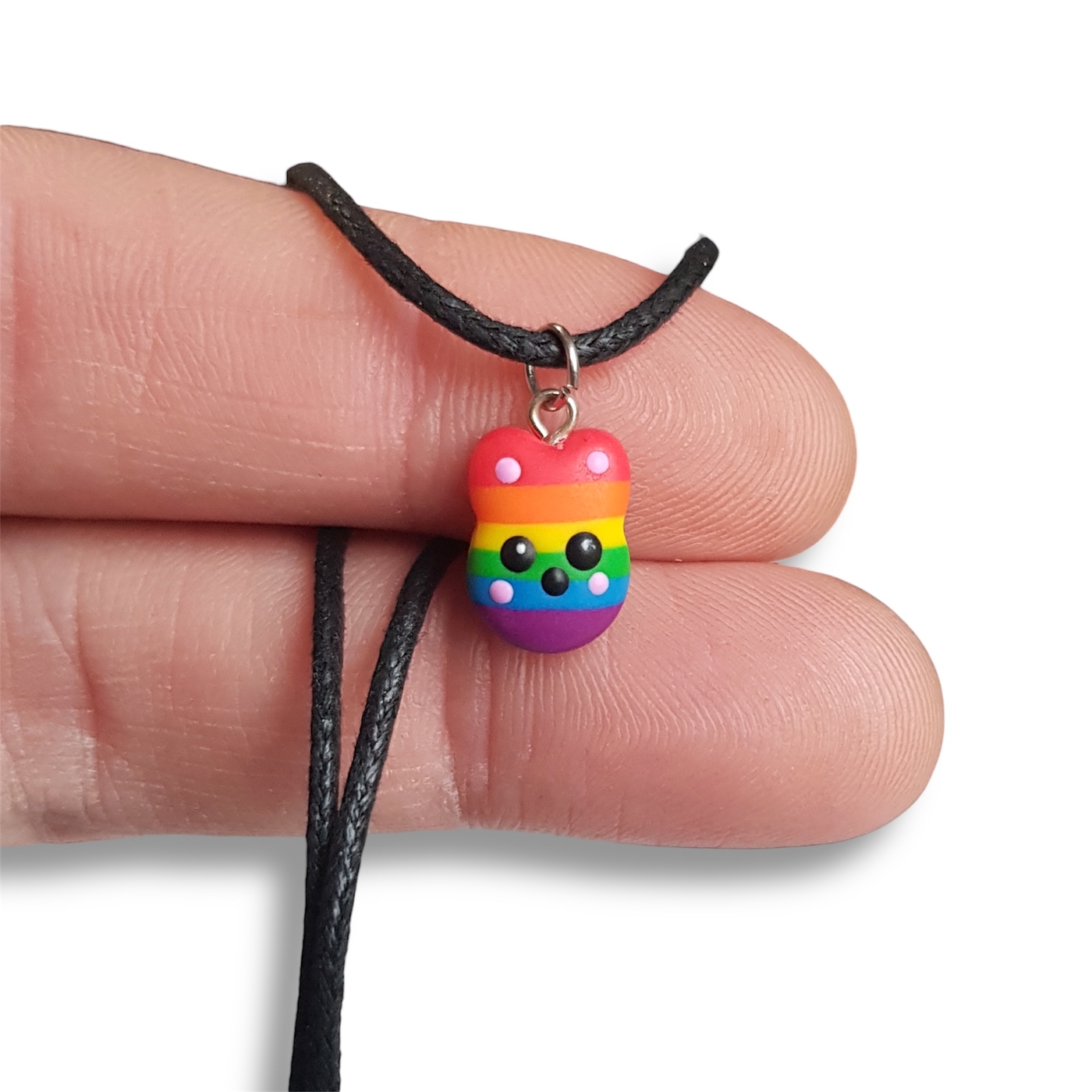 The pendant is handcrafted from polymer clay, and the necklace is made from waxed cotton with a lobster clasp fastening.