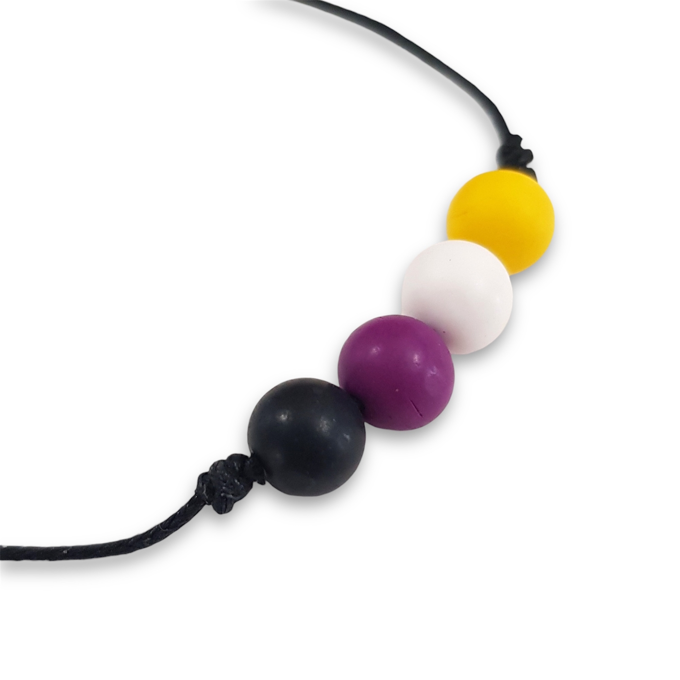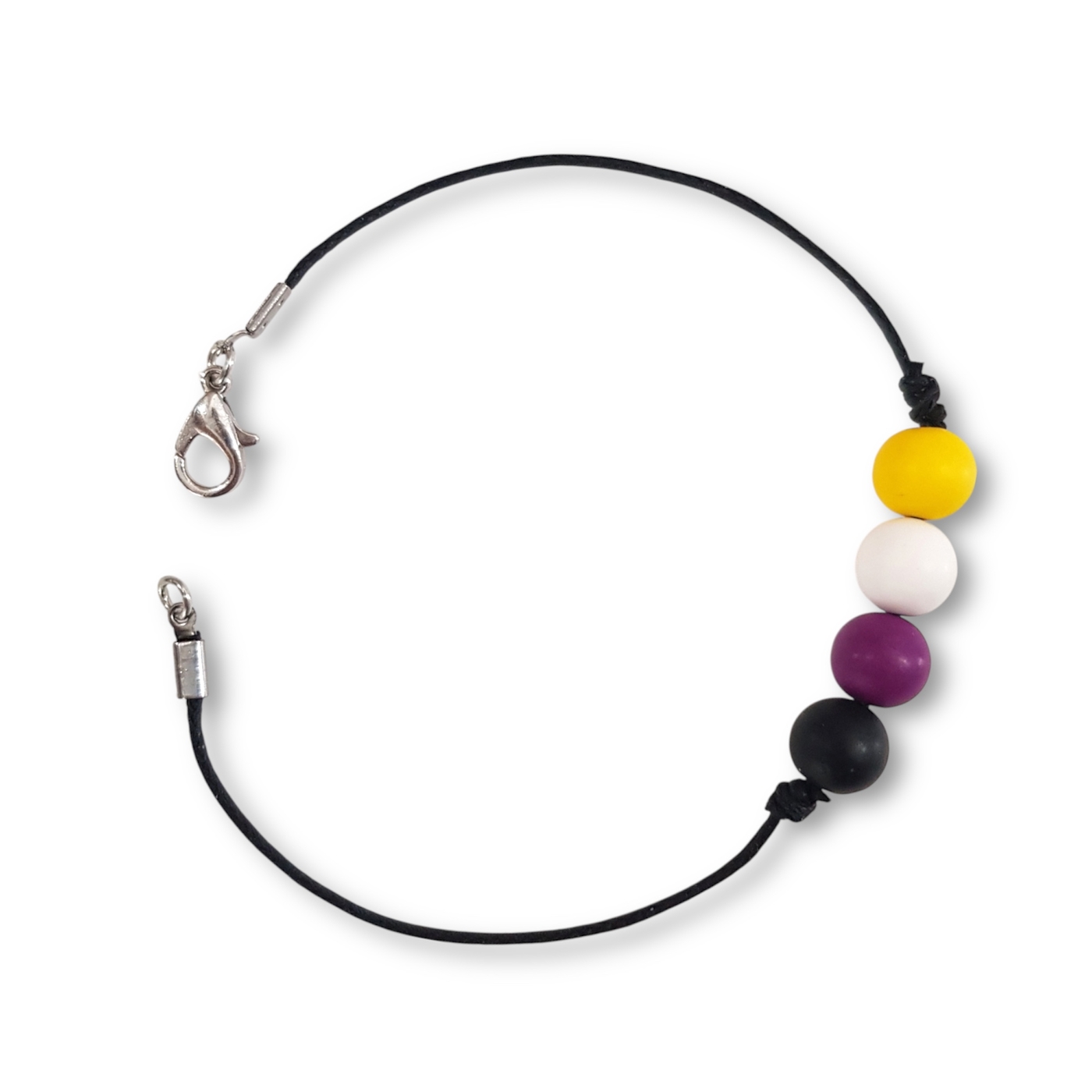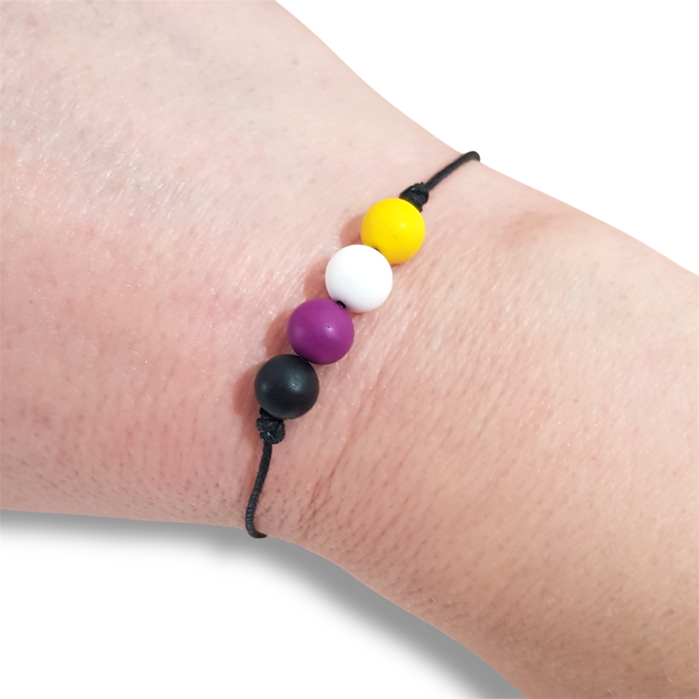 Nonbinary pride flag bracelet in the non binary pride flag colours of yellow, white, purple, and black.