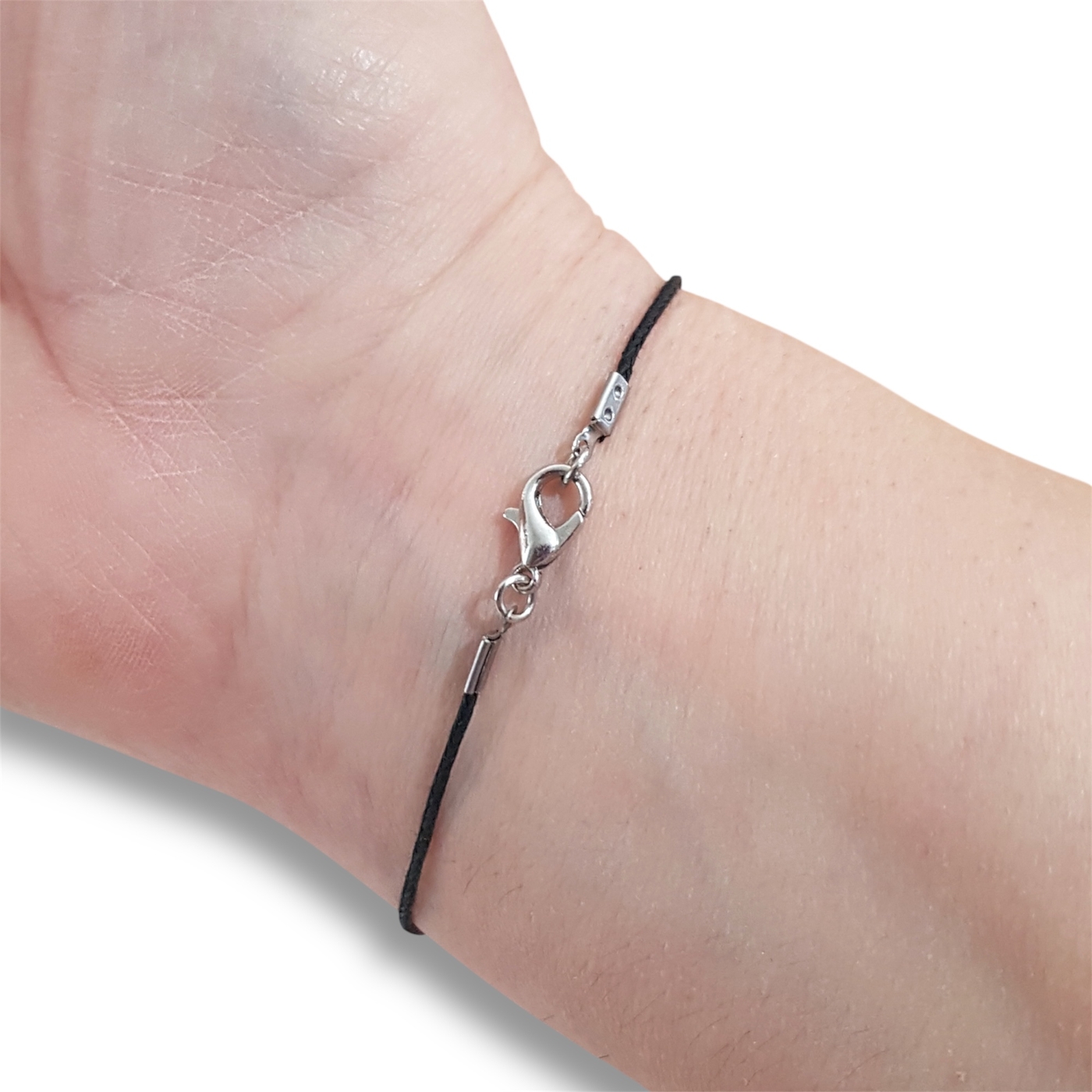 The beads are approximately 8mm in diameter and are handmade from polymer clay. The bracelet is made from 1mm waxed cotton, and closure is via a lobster clasp.
