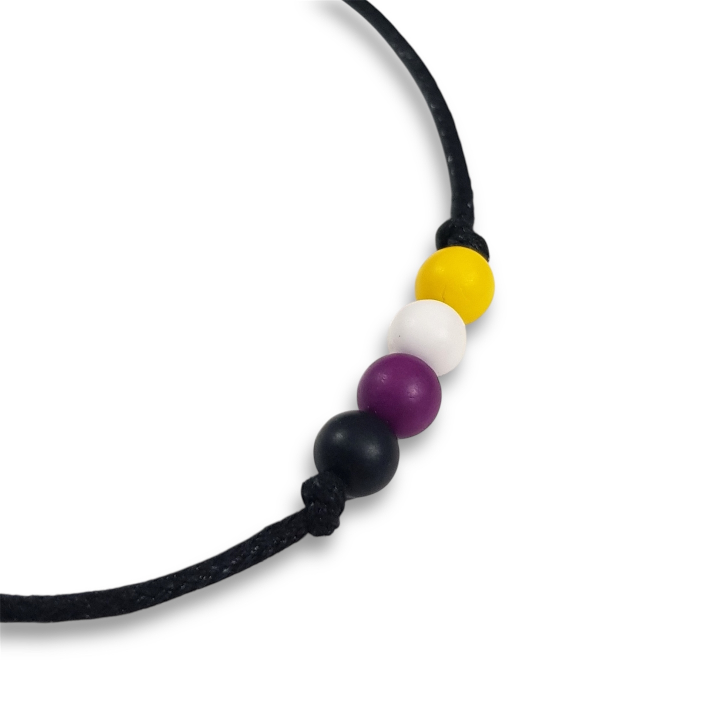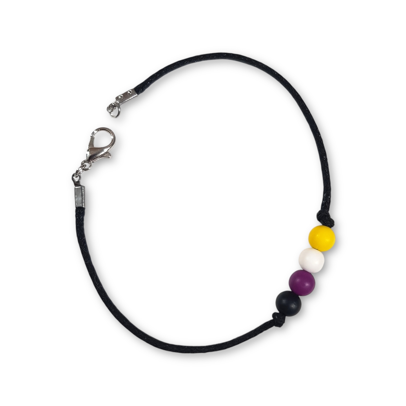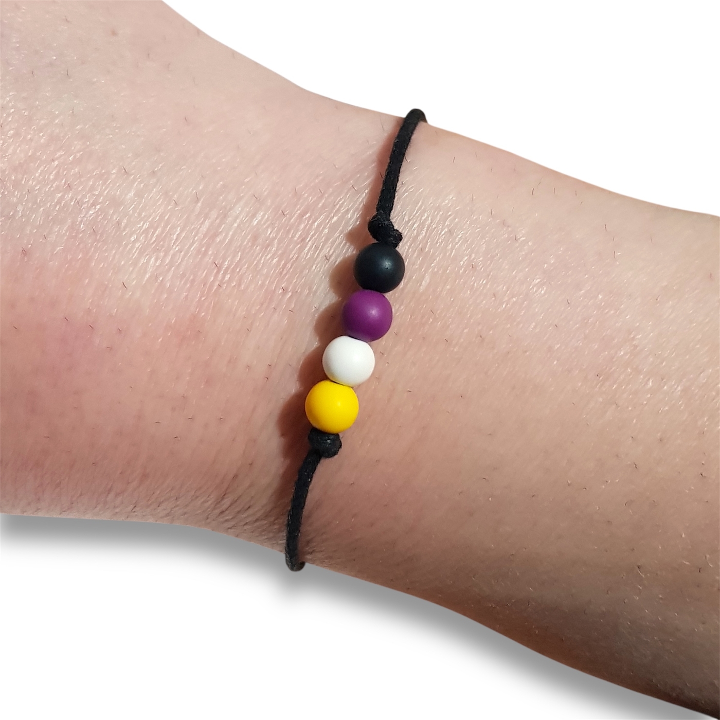 Nonbinary pride flag beaded bracelet in the non binary pride flag colours of yellow, white, purple, and black.