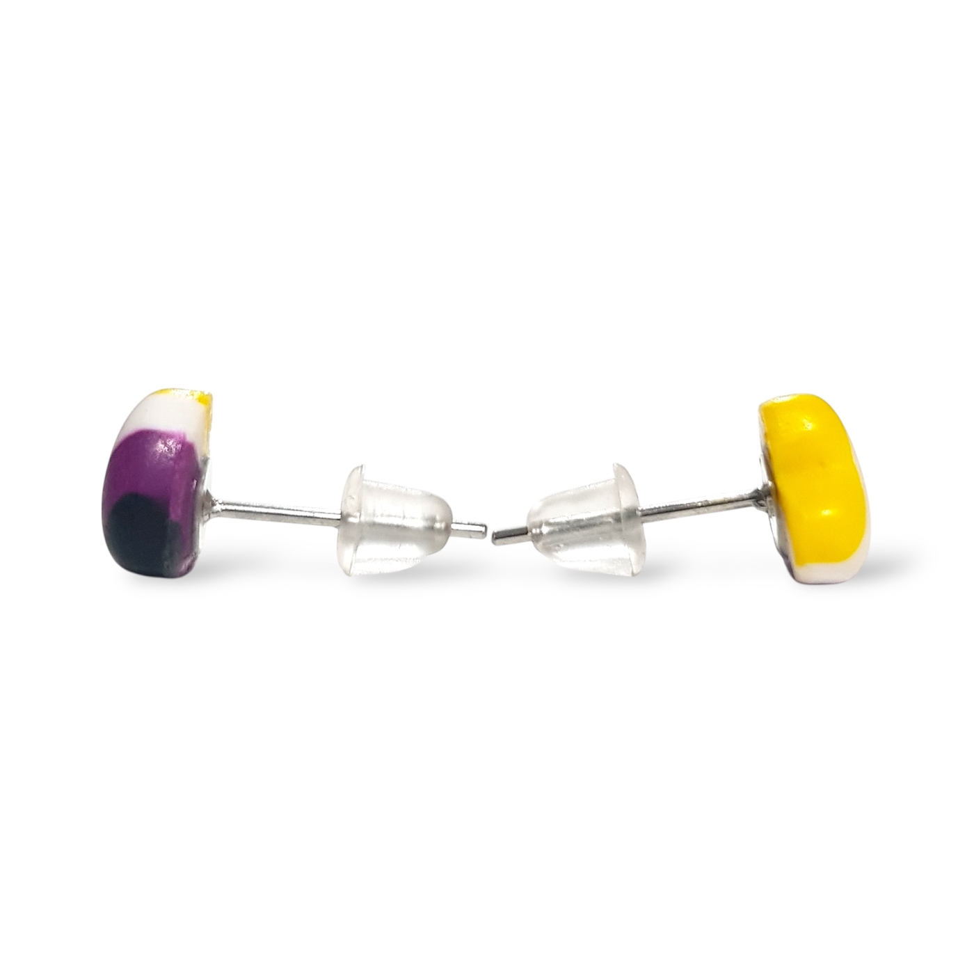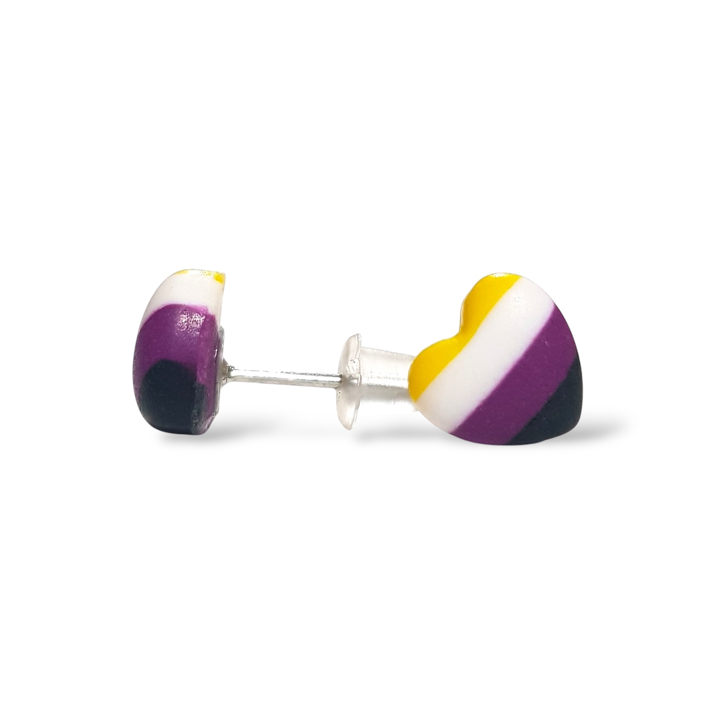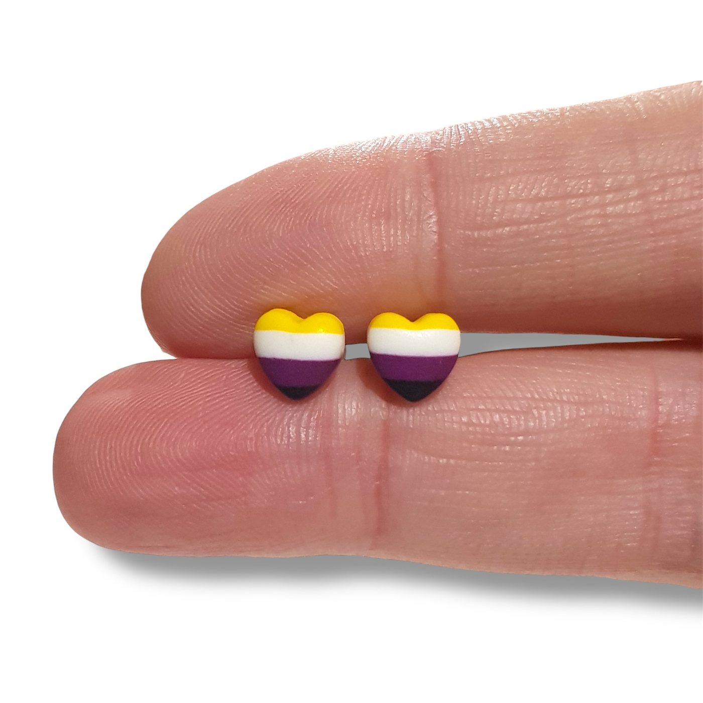 A beautiful pair of non binary pride flag heart shaped earrings in the colours of the nonbinary flag. Handmade in polymer clay and featuring hypoallergenic stainless steel posts and silicone rubber stoppers.