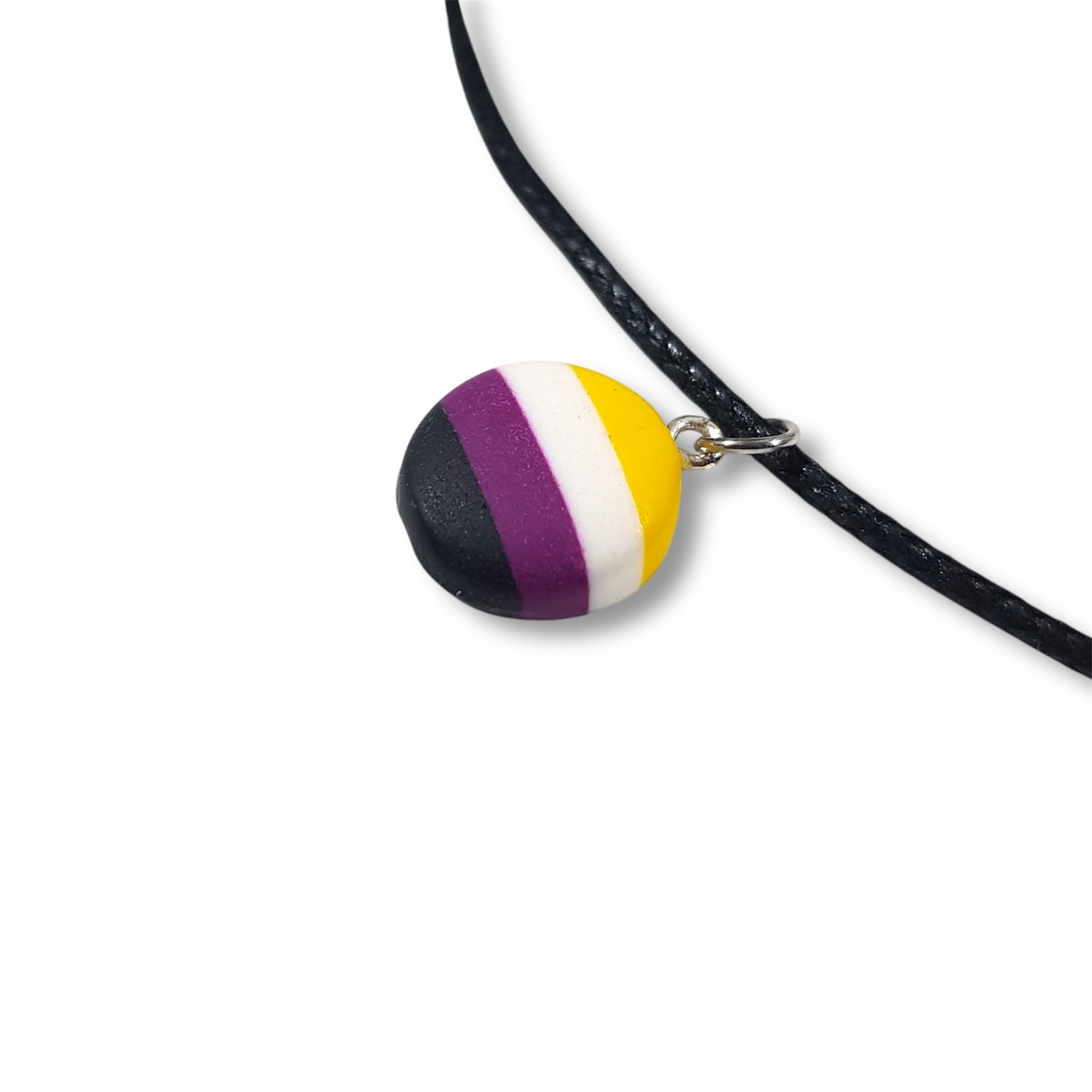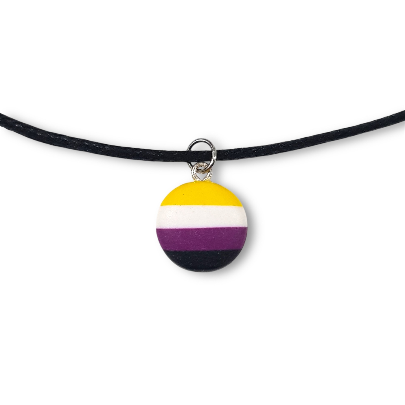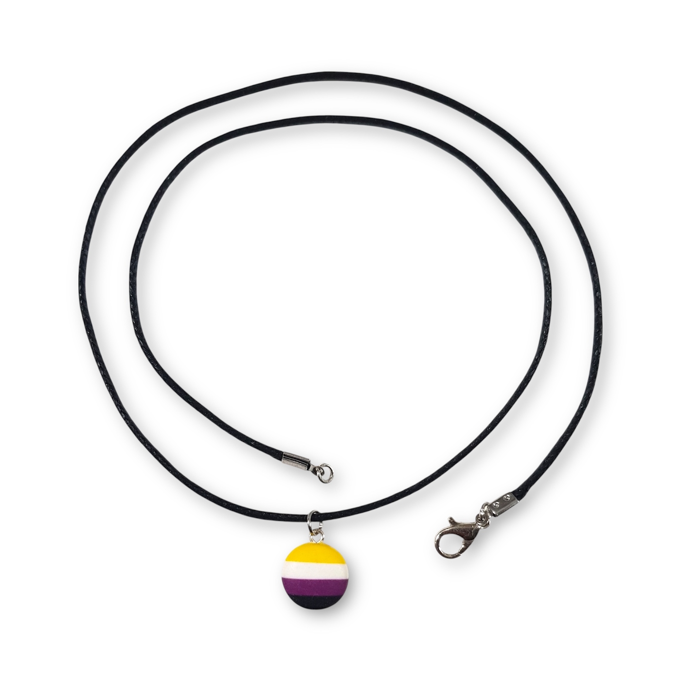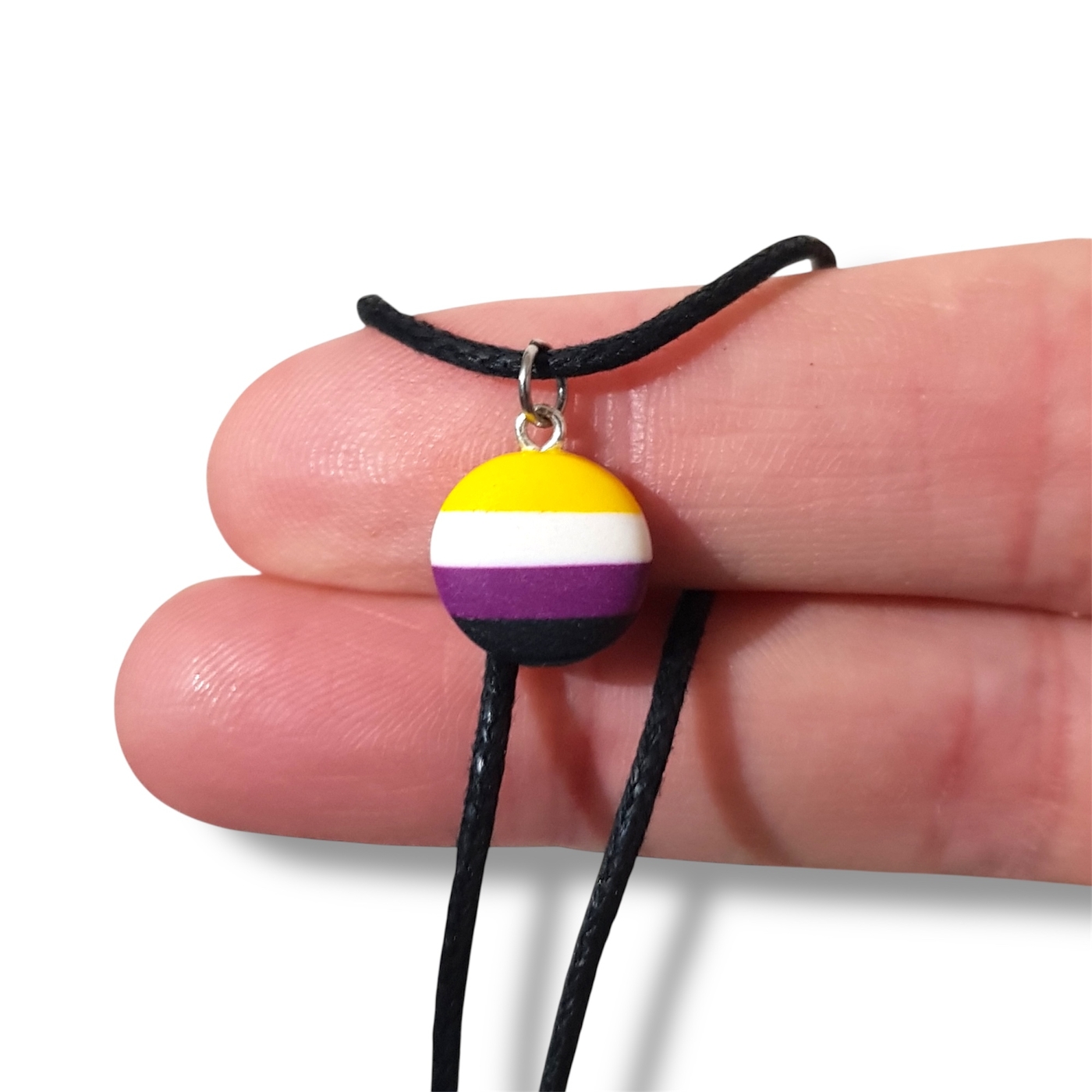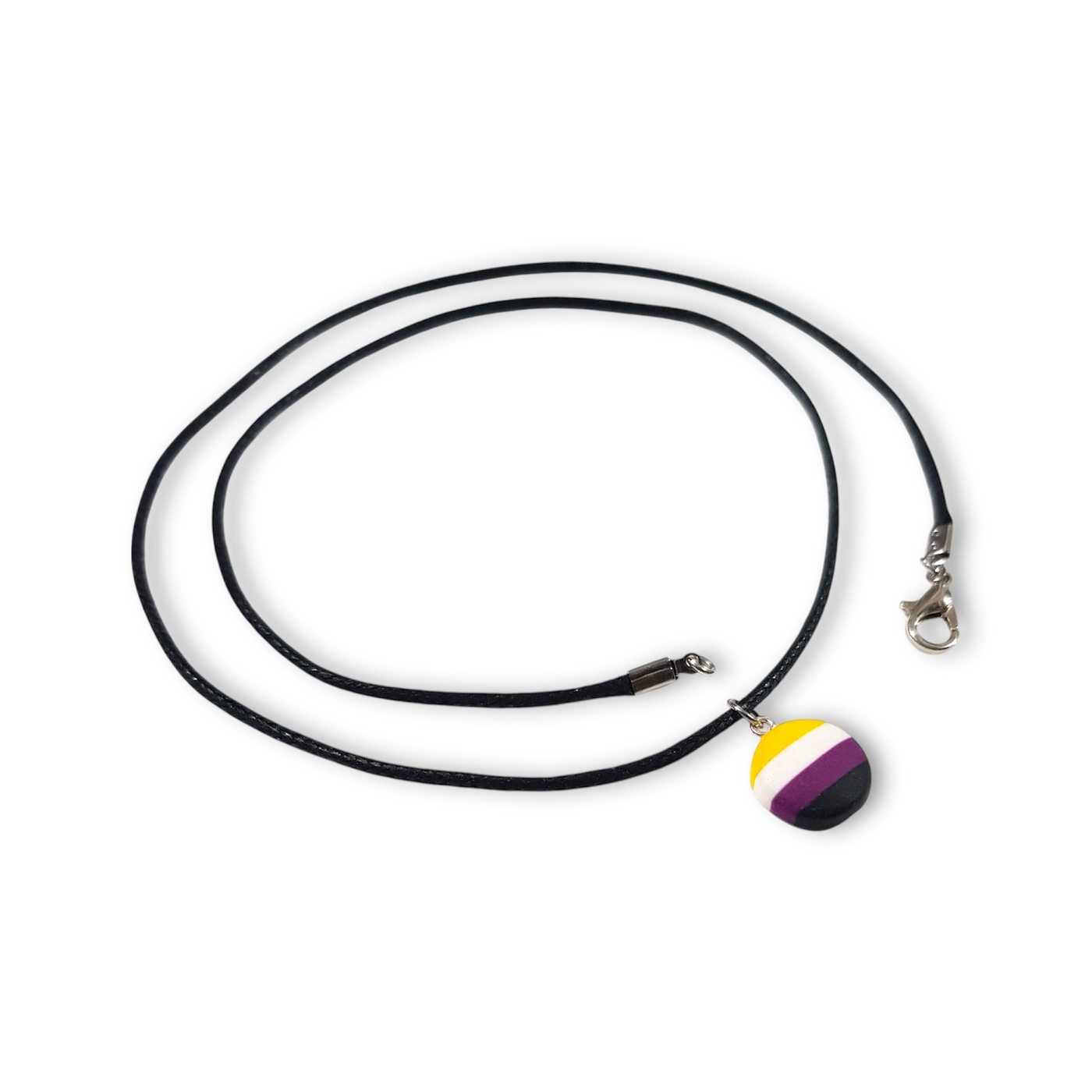 Nonbinary pride flag necklace in the non binary pride flag colours of yellow, white, purple, and black.