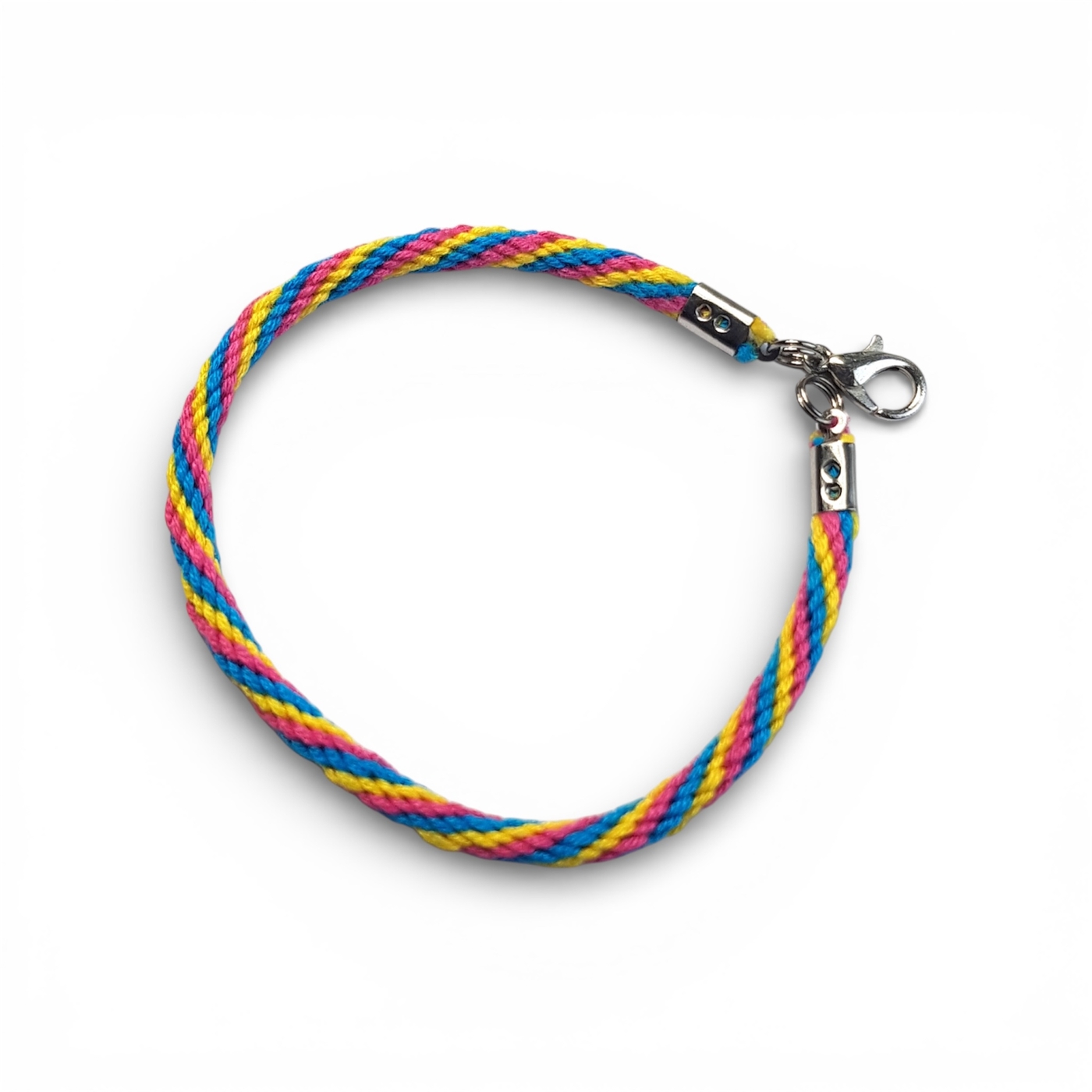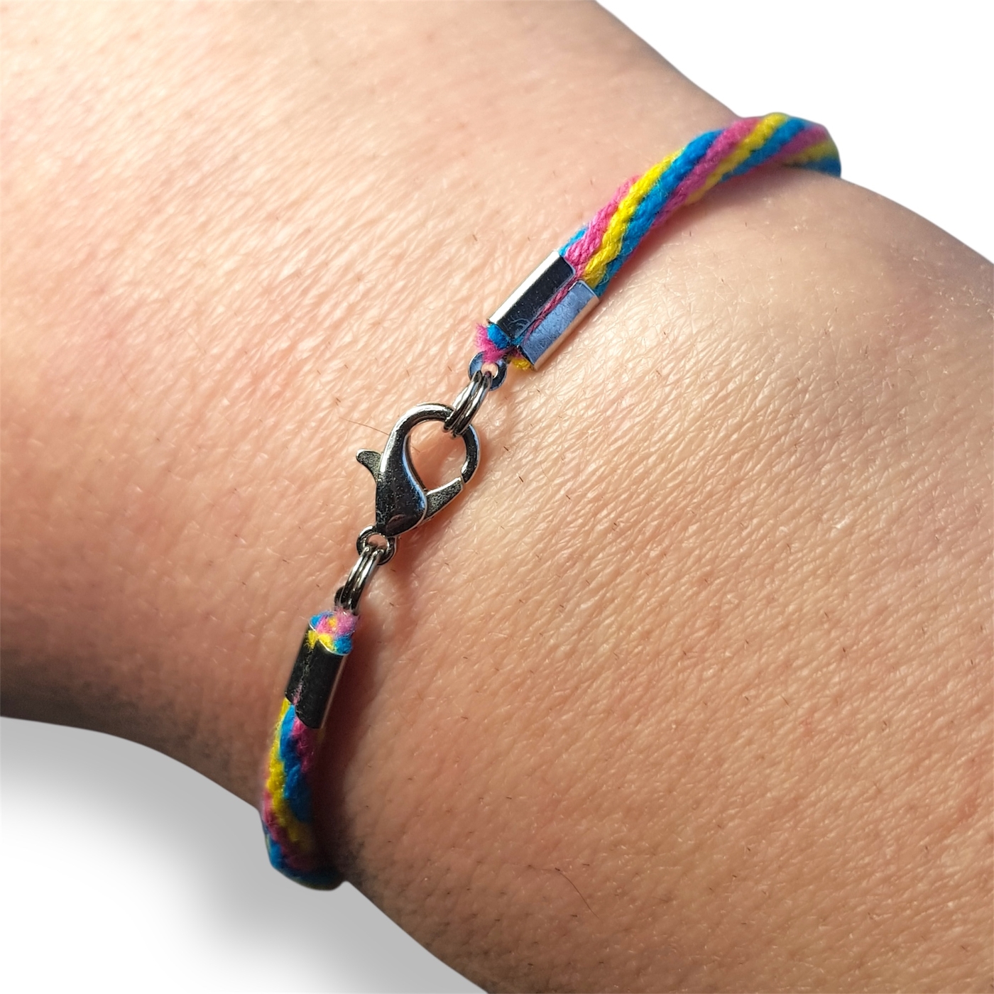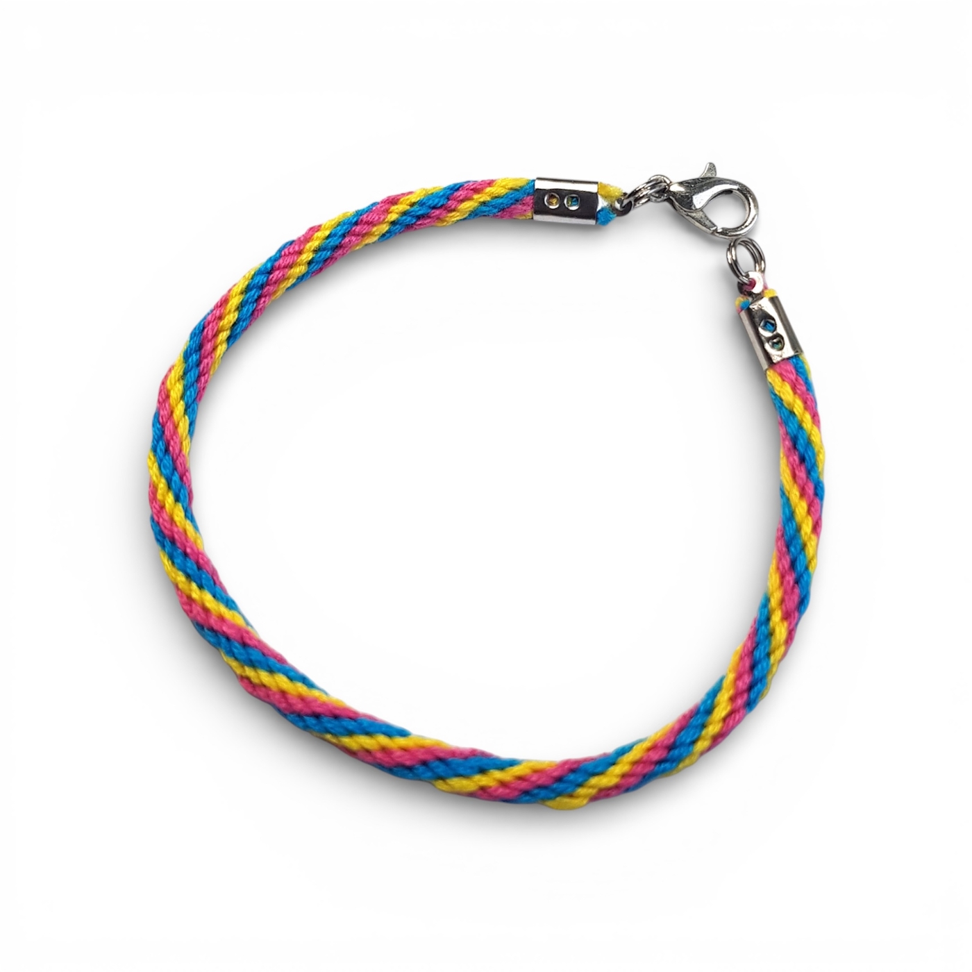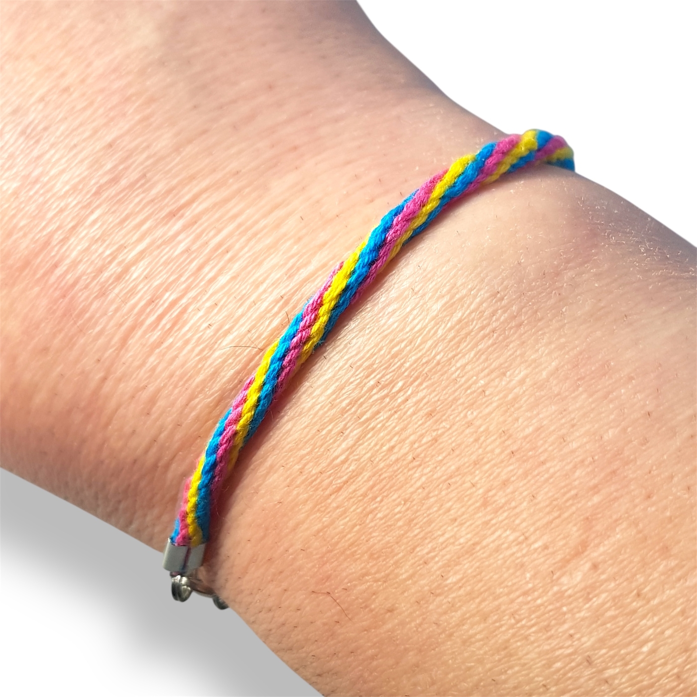 Handmade pansexual braided bracelet in the flag colours of pink, yellow, and blue.