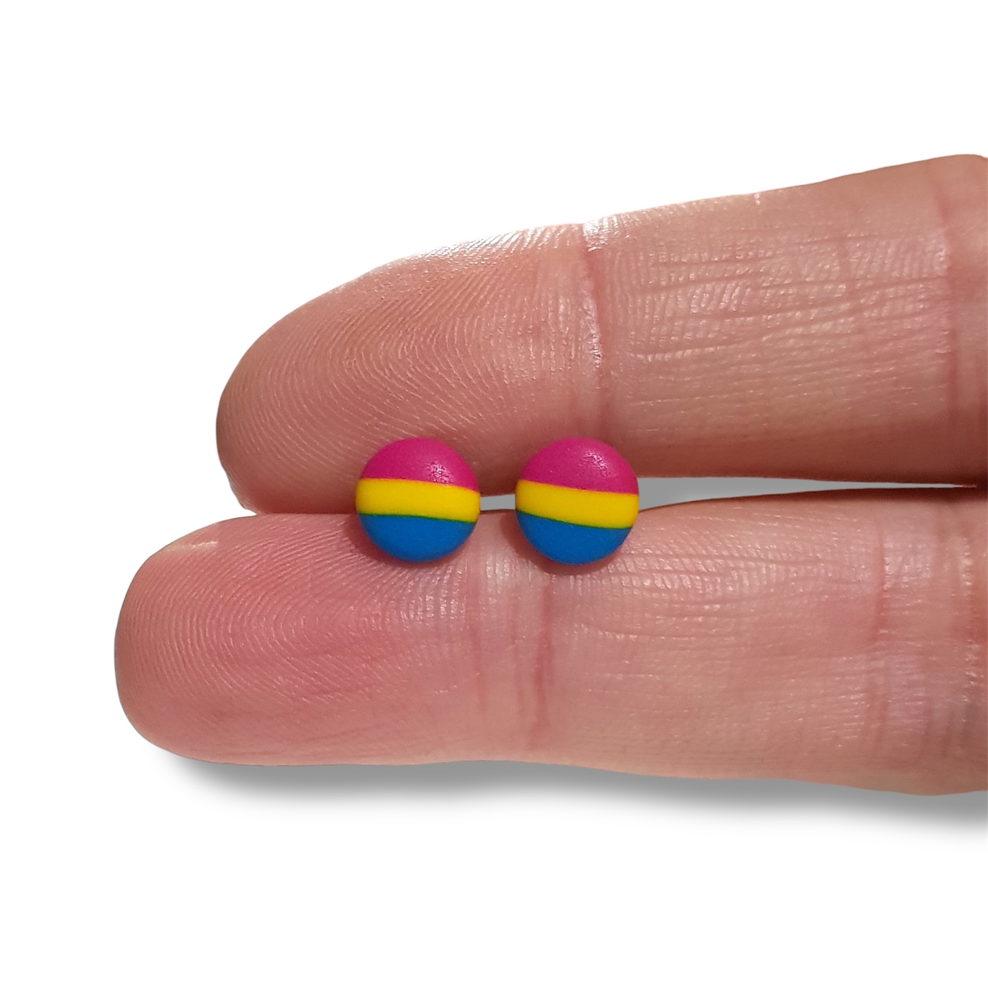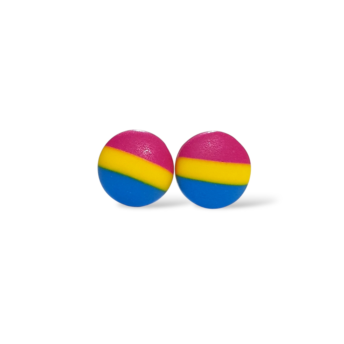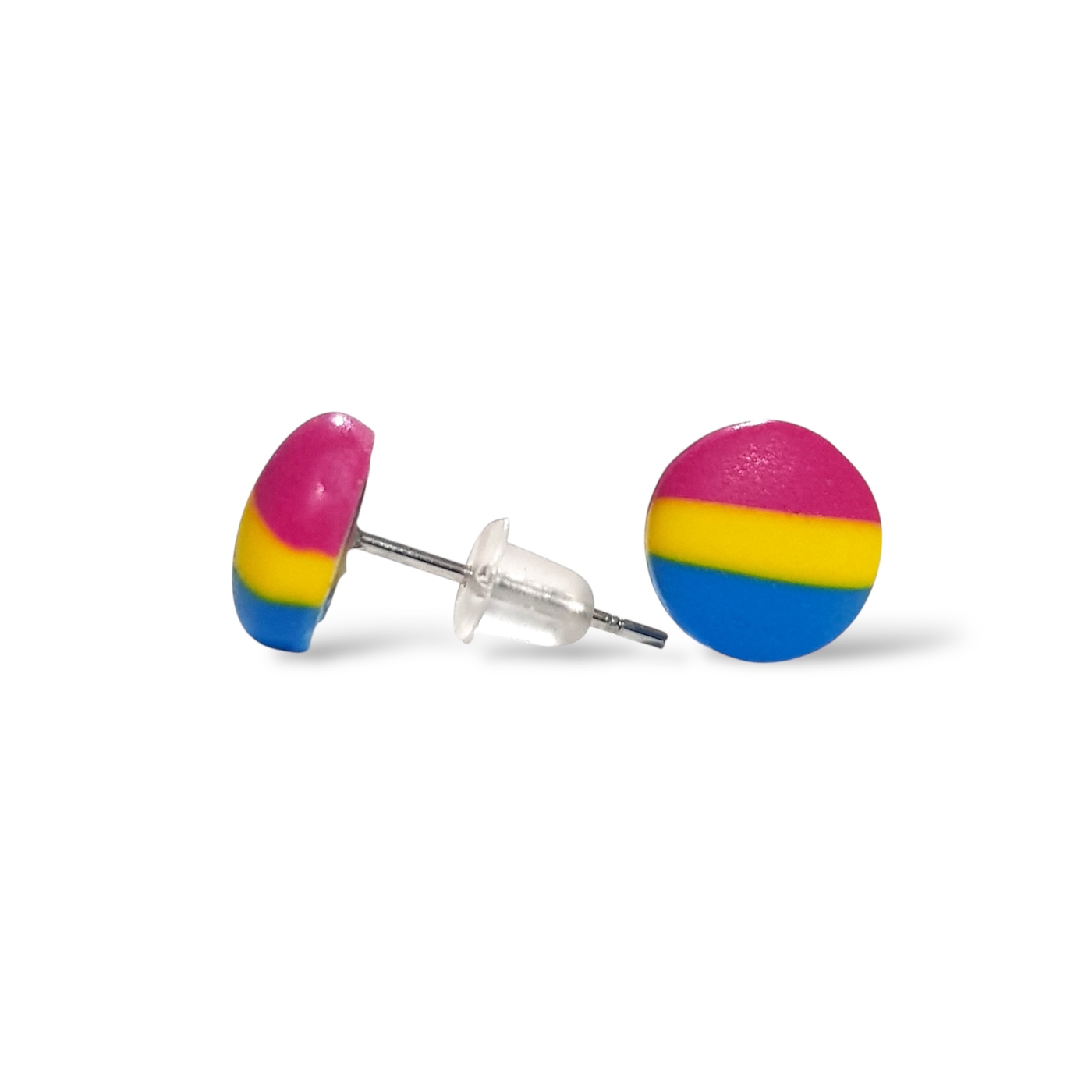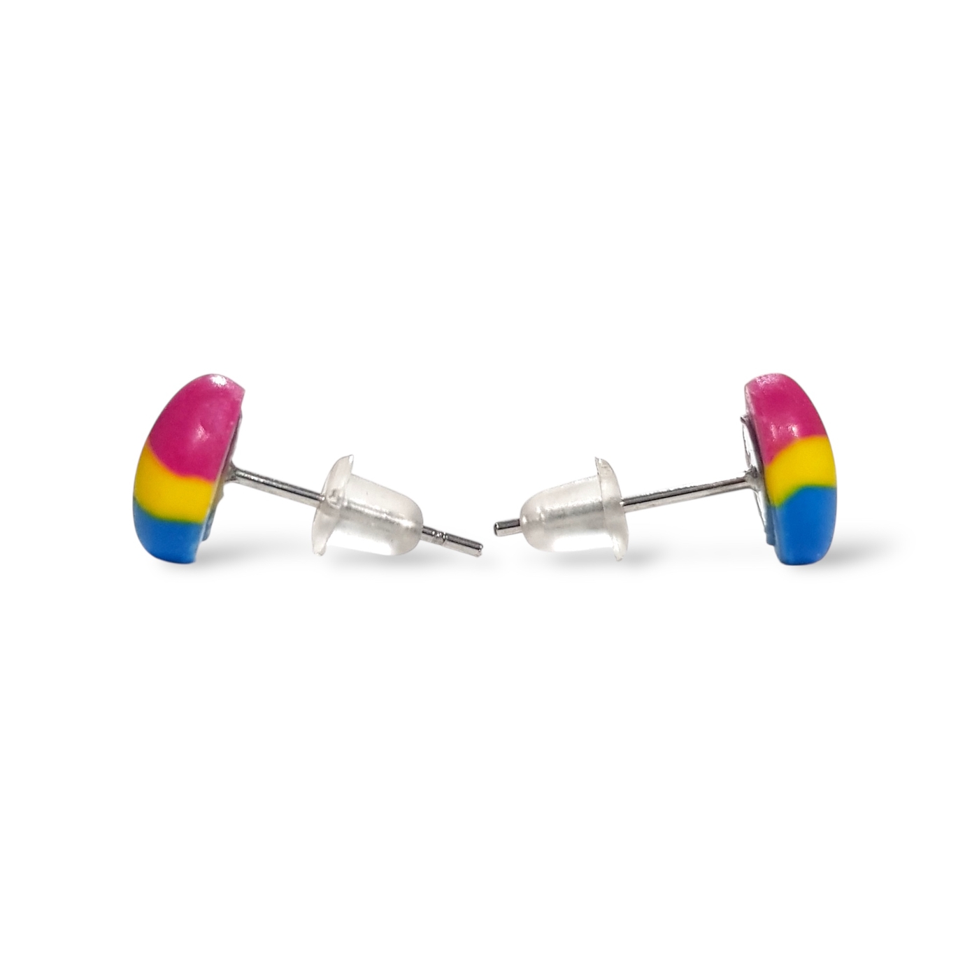 A beautiful pair of pansexual pride flag button shaped earrings in the pansexual pride flag colours of pink, yellow, and blue. Handmade in polymer clay and featuring hypoallergenic stainless steel posts and silicone rubber stoppers.