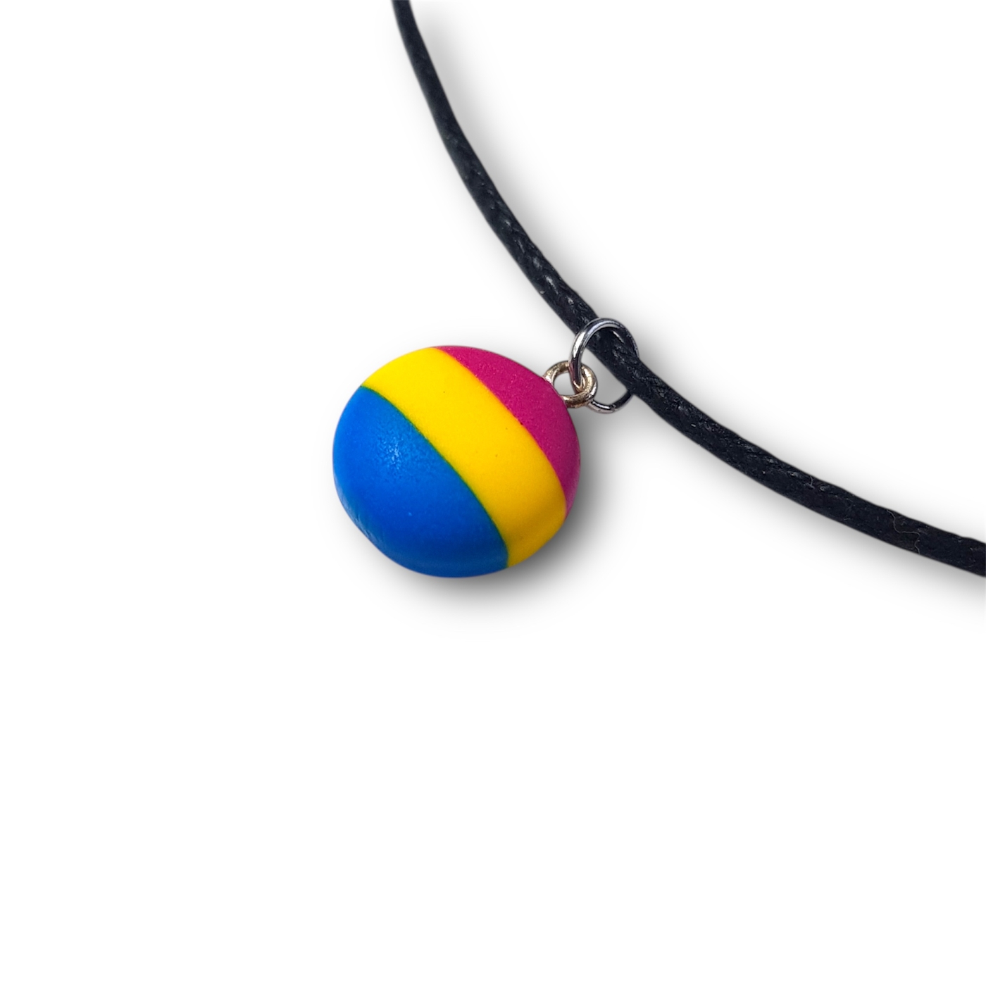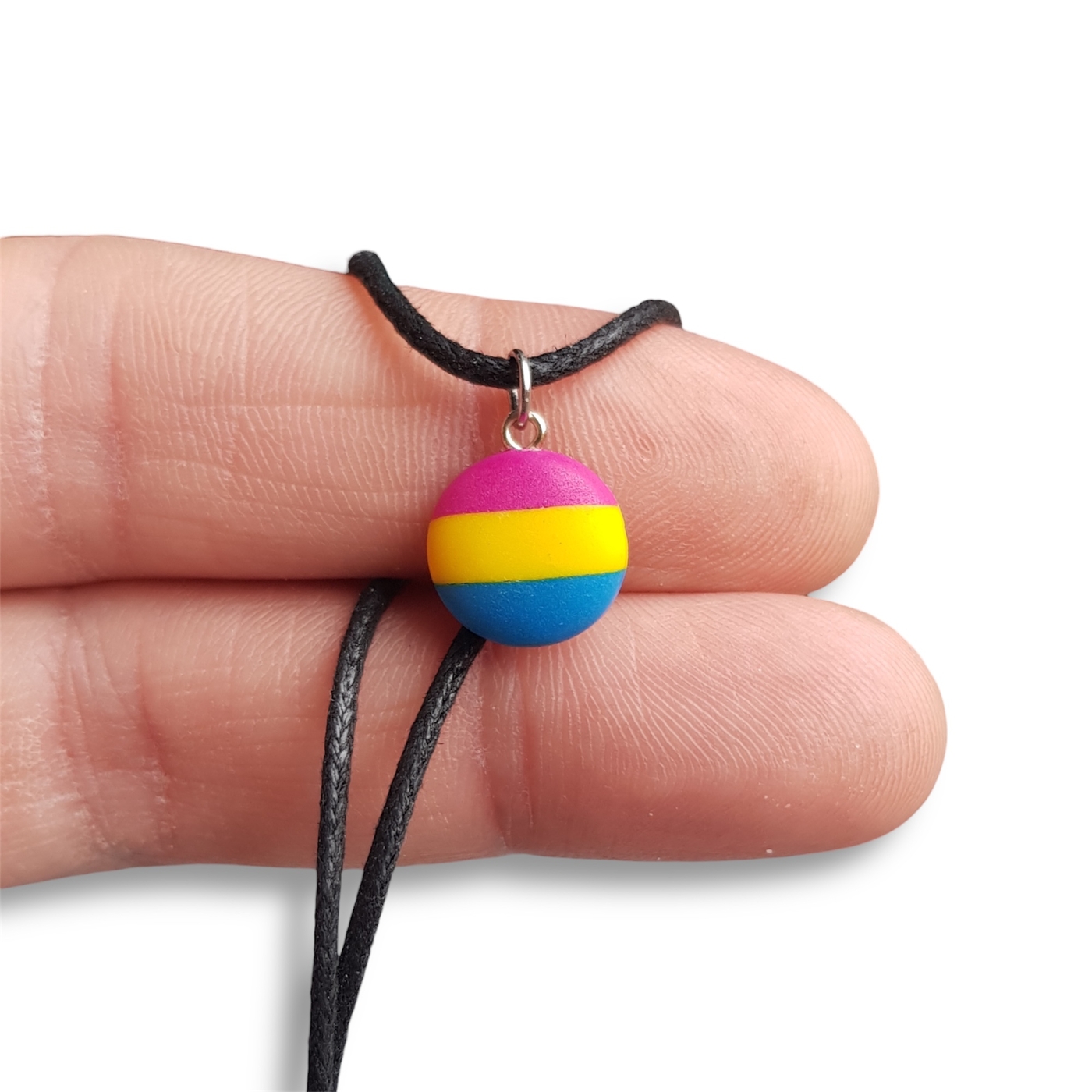 Pansexual pride flag pendant necklace in the pansexual pride flag colours of pink, yellow, and blue.