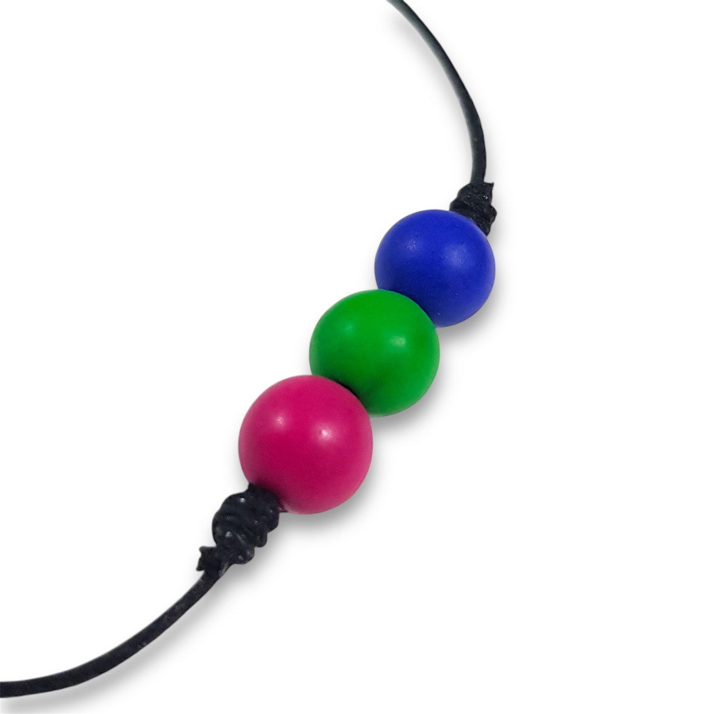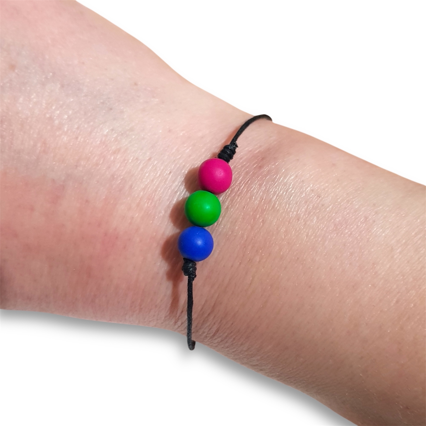 Polysexual bracelet in the poly pride flag colours of pink, green, and blue.