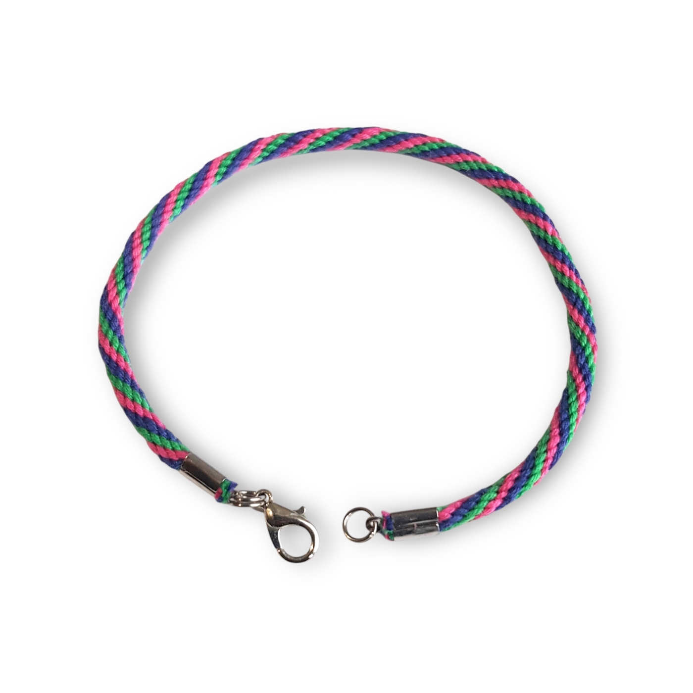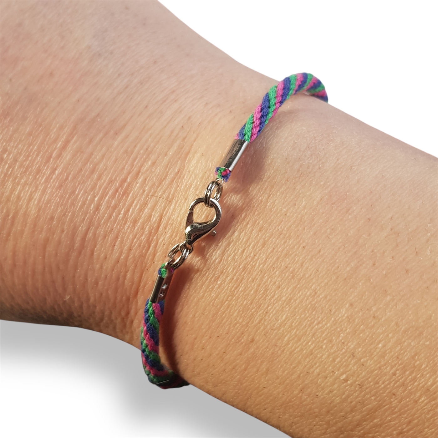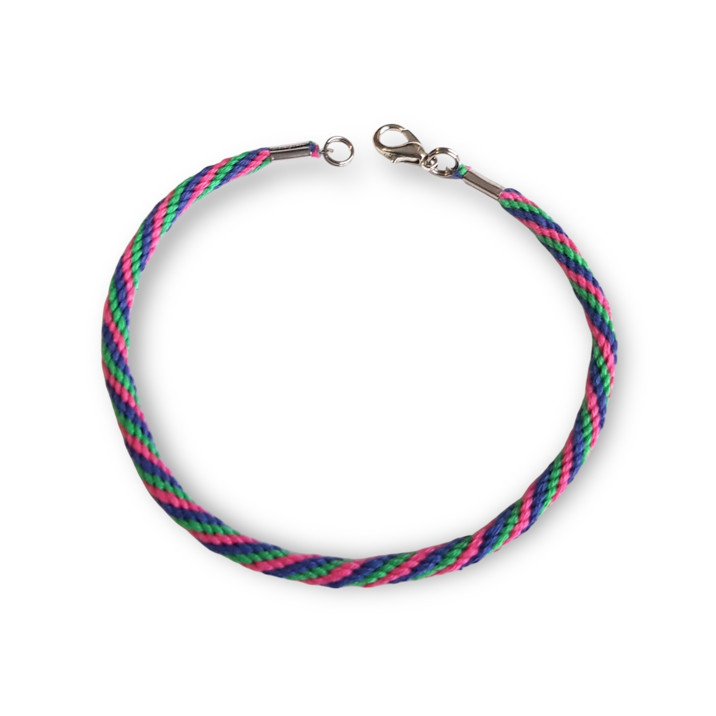 Handmade polysexual braided bracelet in the flag colours of pink, green, and blue.