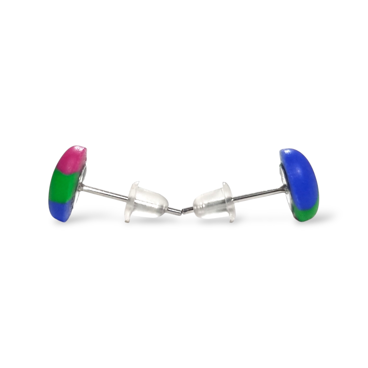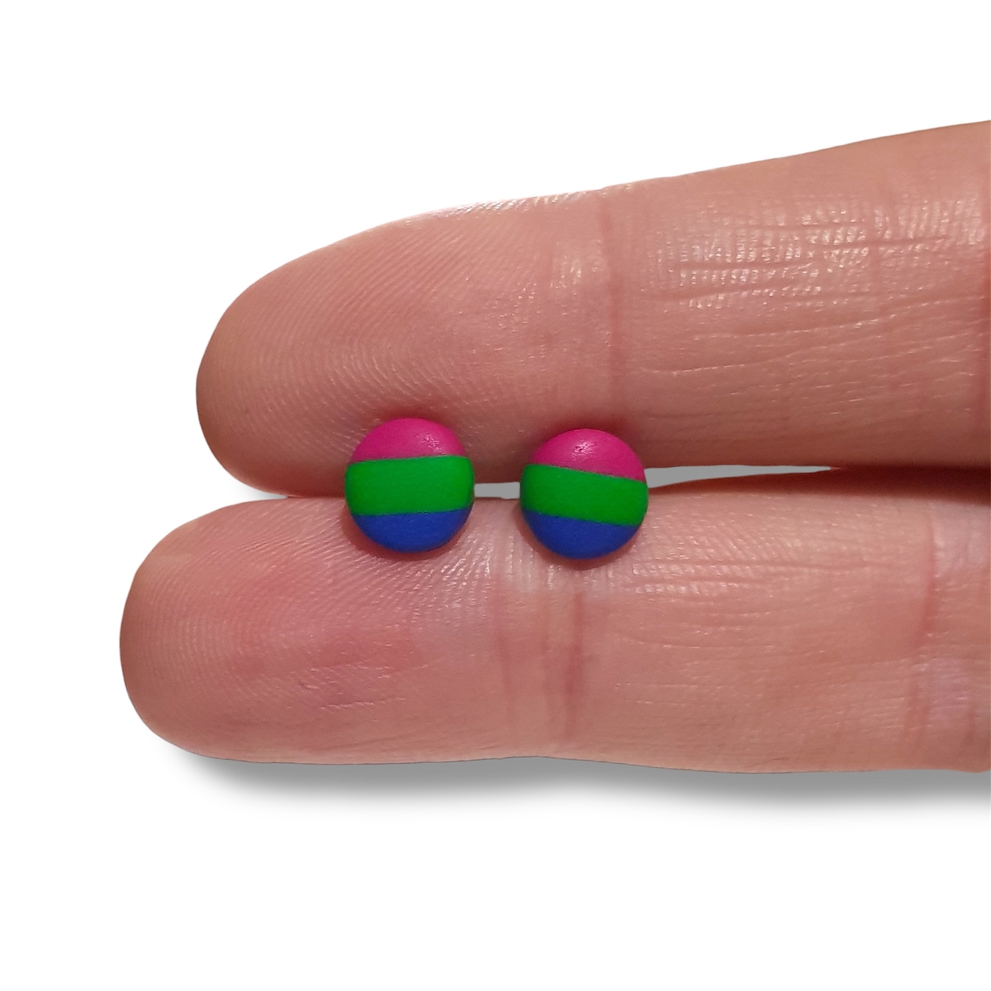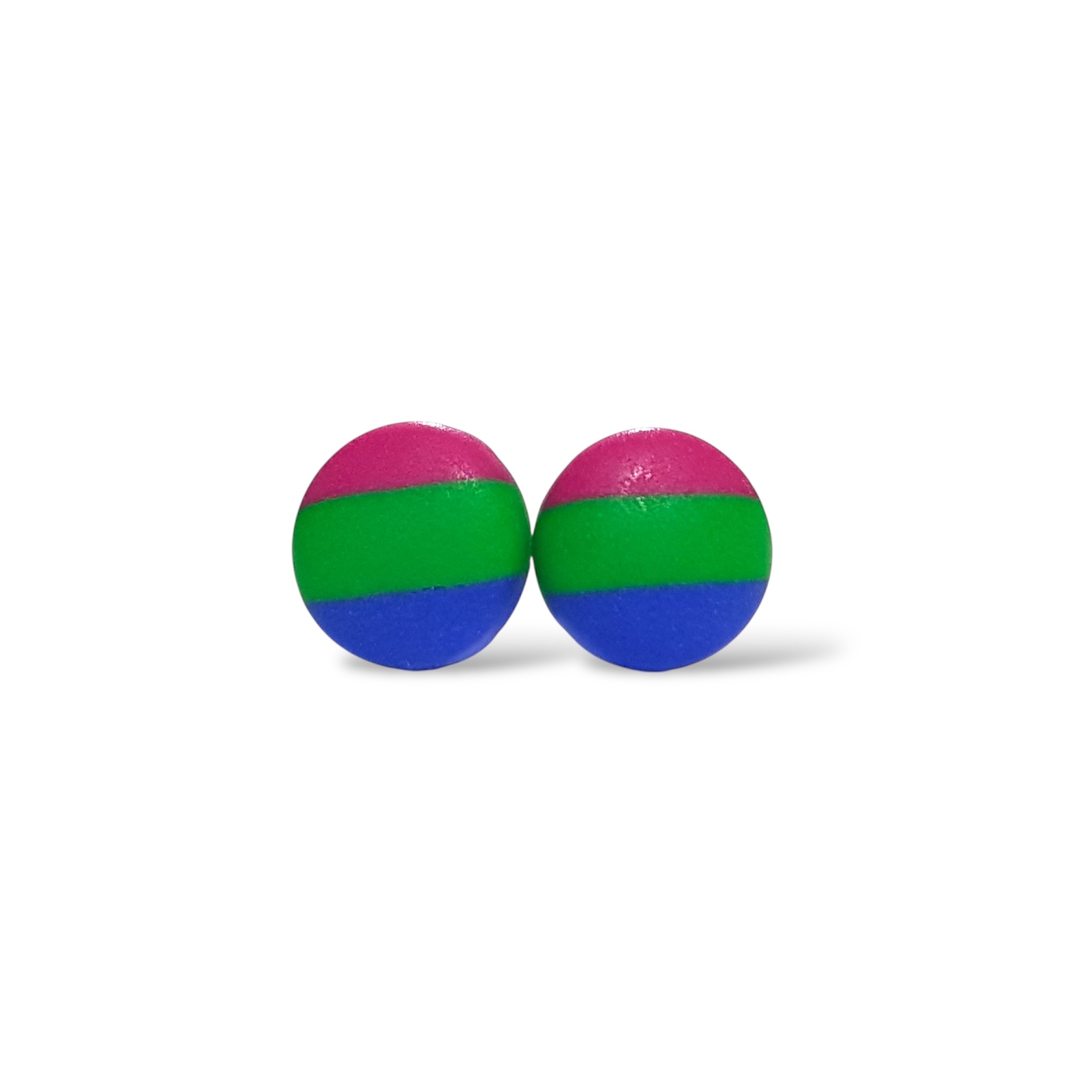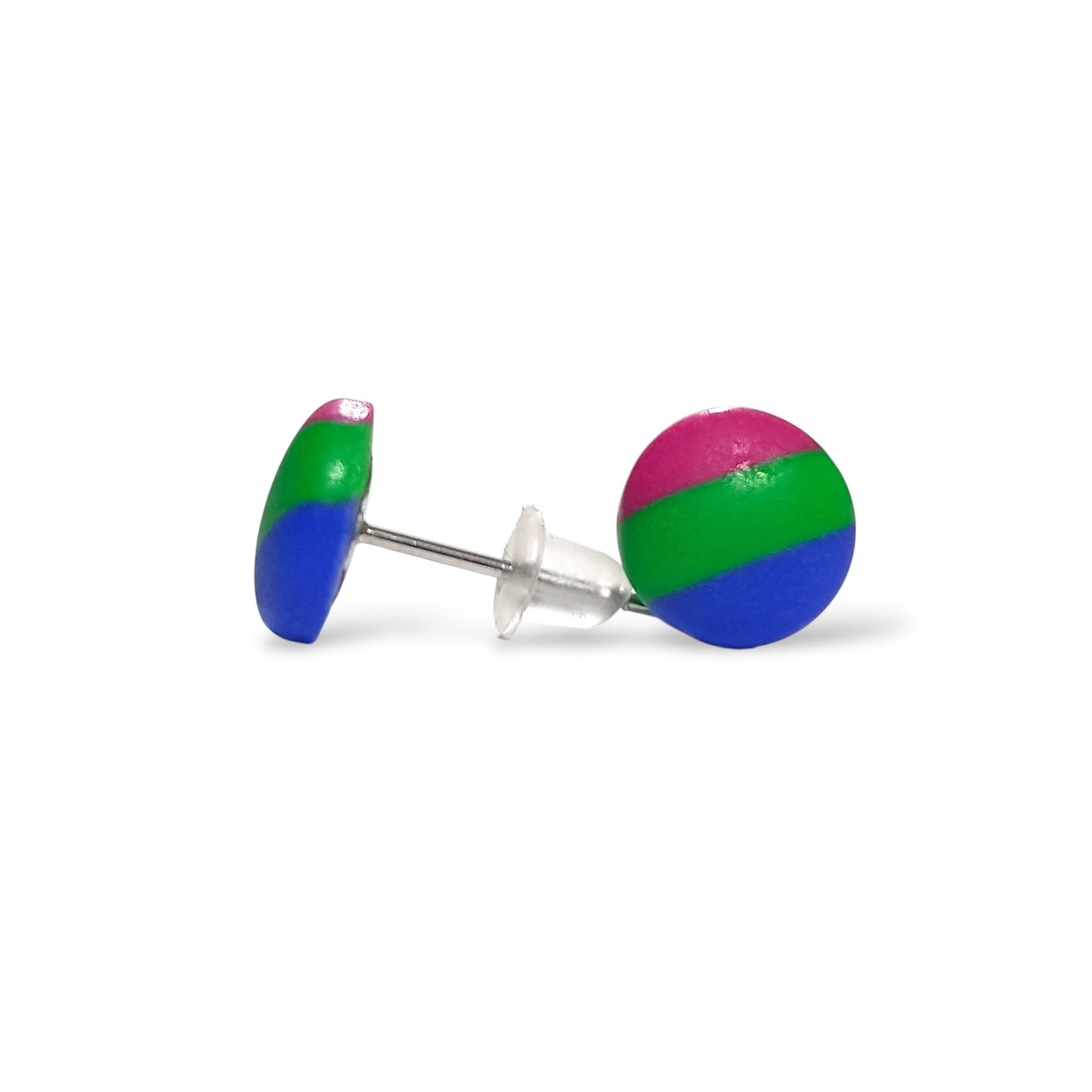 A beautiful pair of polysexual pride flag button shaped earrings in the colours of pink, green, and blue. Handmade in polymer clay and featuring hypoallergenic stainless steel posts and silicone rubber stoppers.