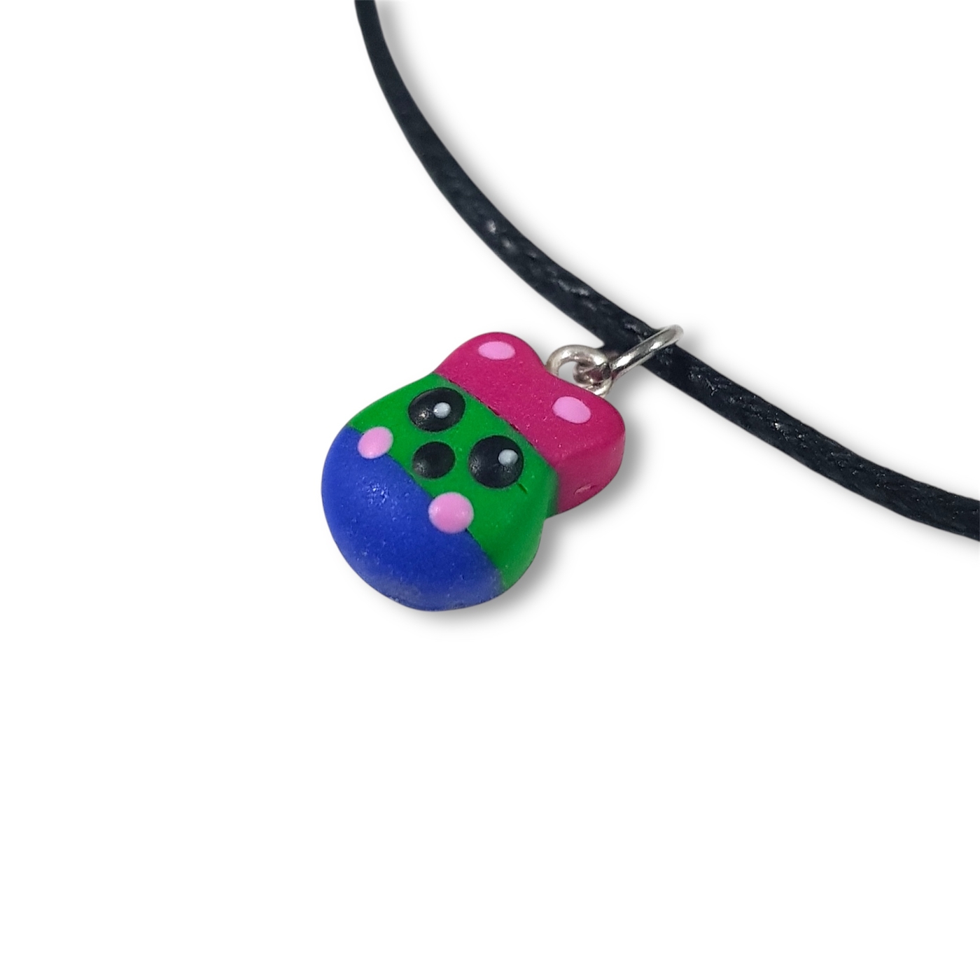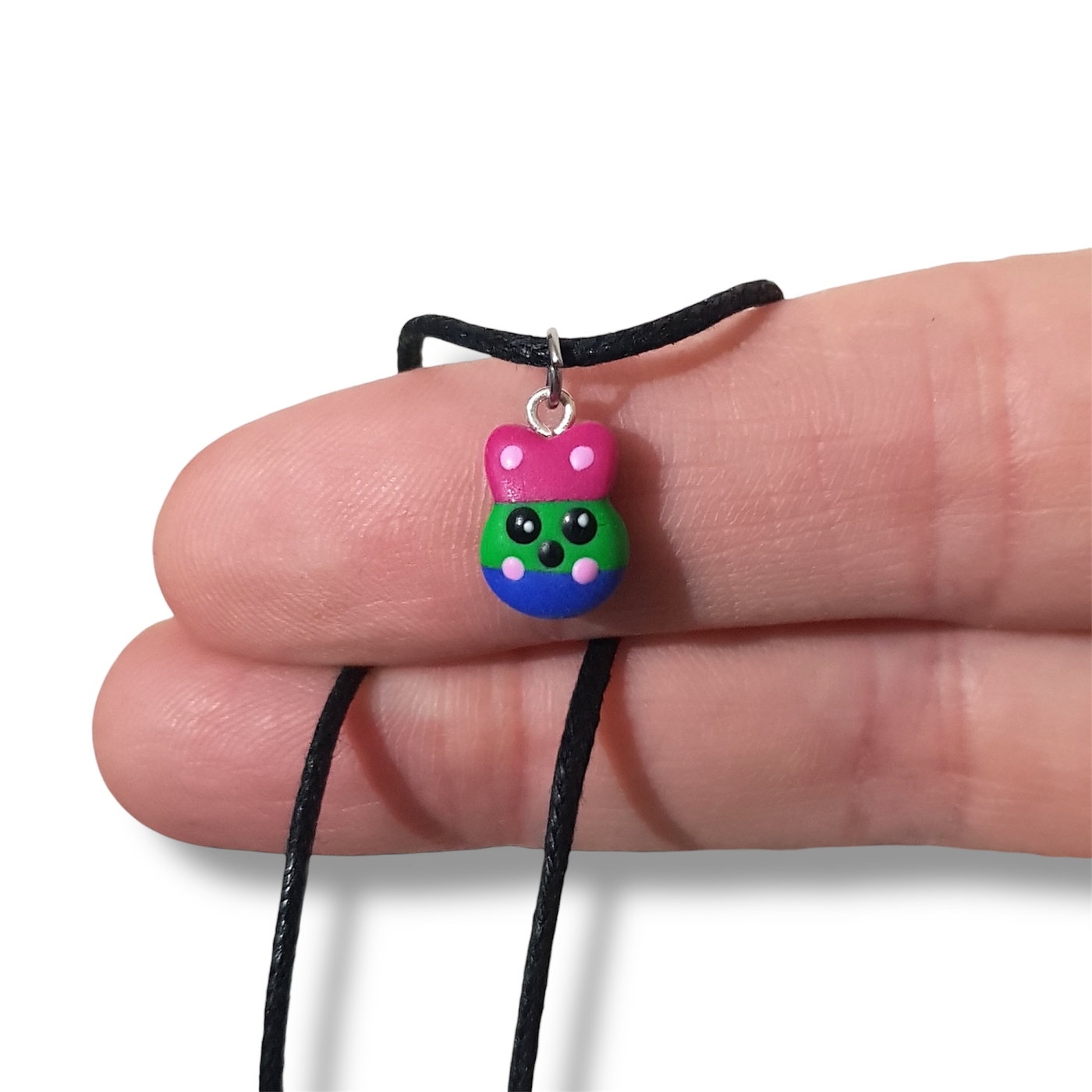 Polysexual pride flag kawaii rabbit necklace in the poly pride flag colours of pink, green, and blue.
