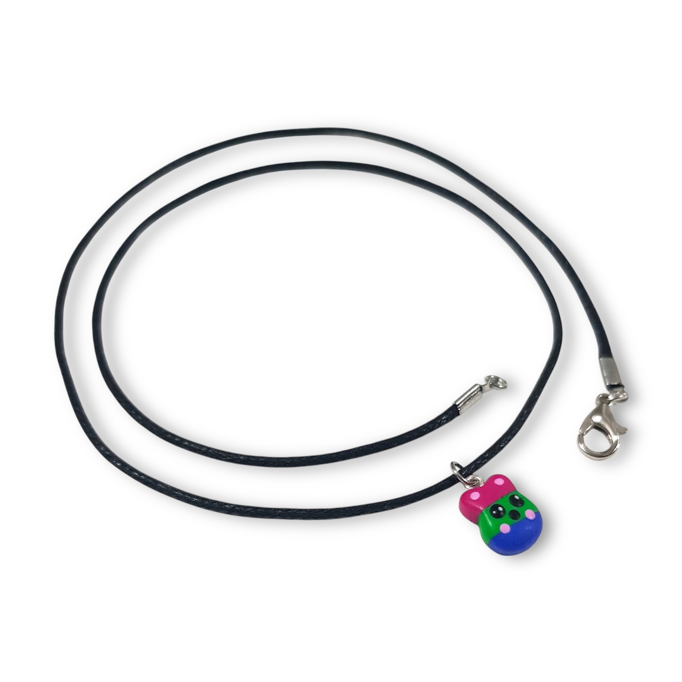 The pendant is handcrafted from polymer clay, and the necklace is made from waxed cotton with a lobster clasp fastening.