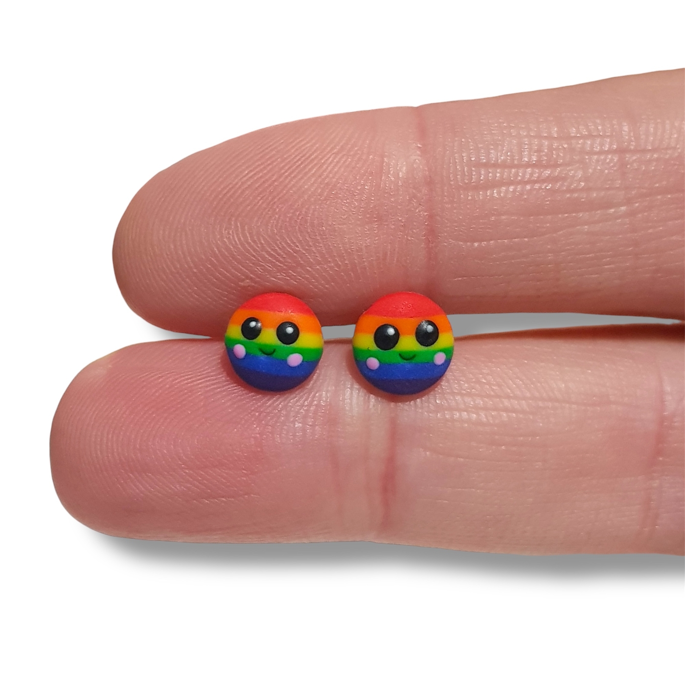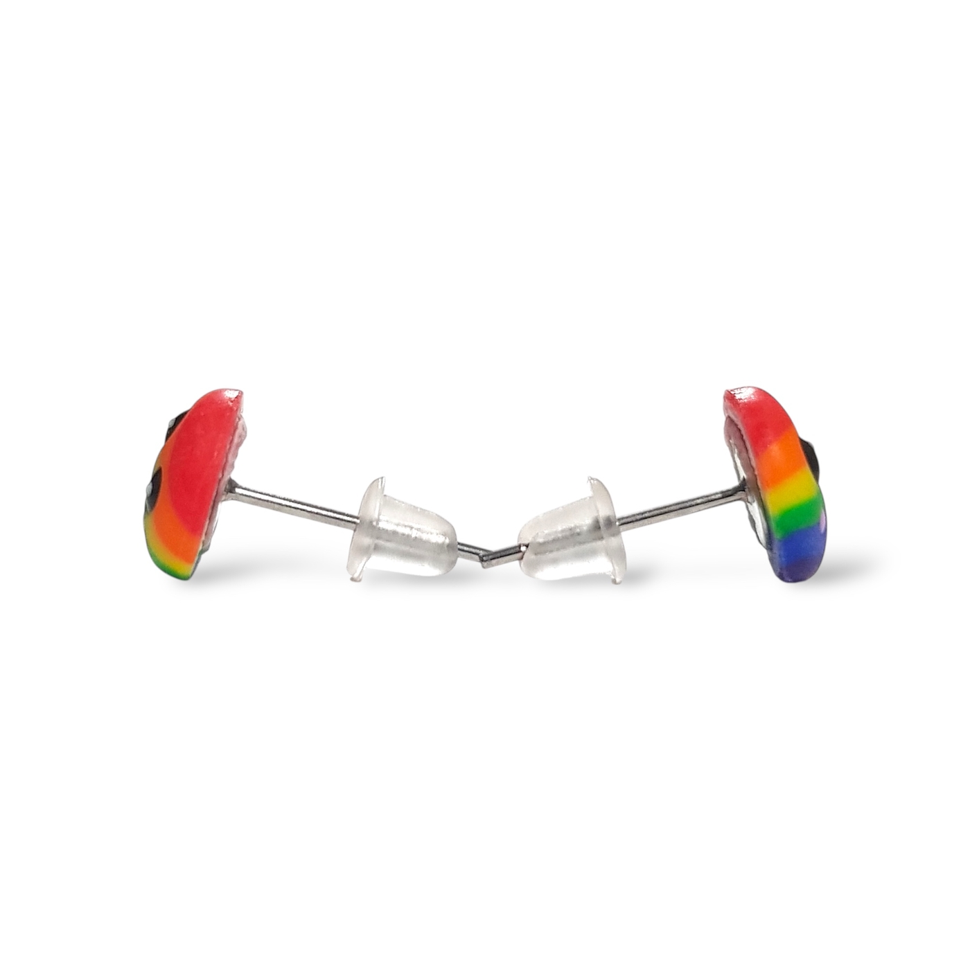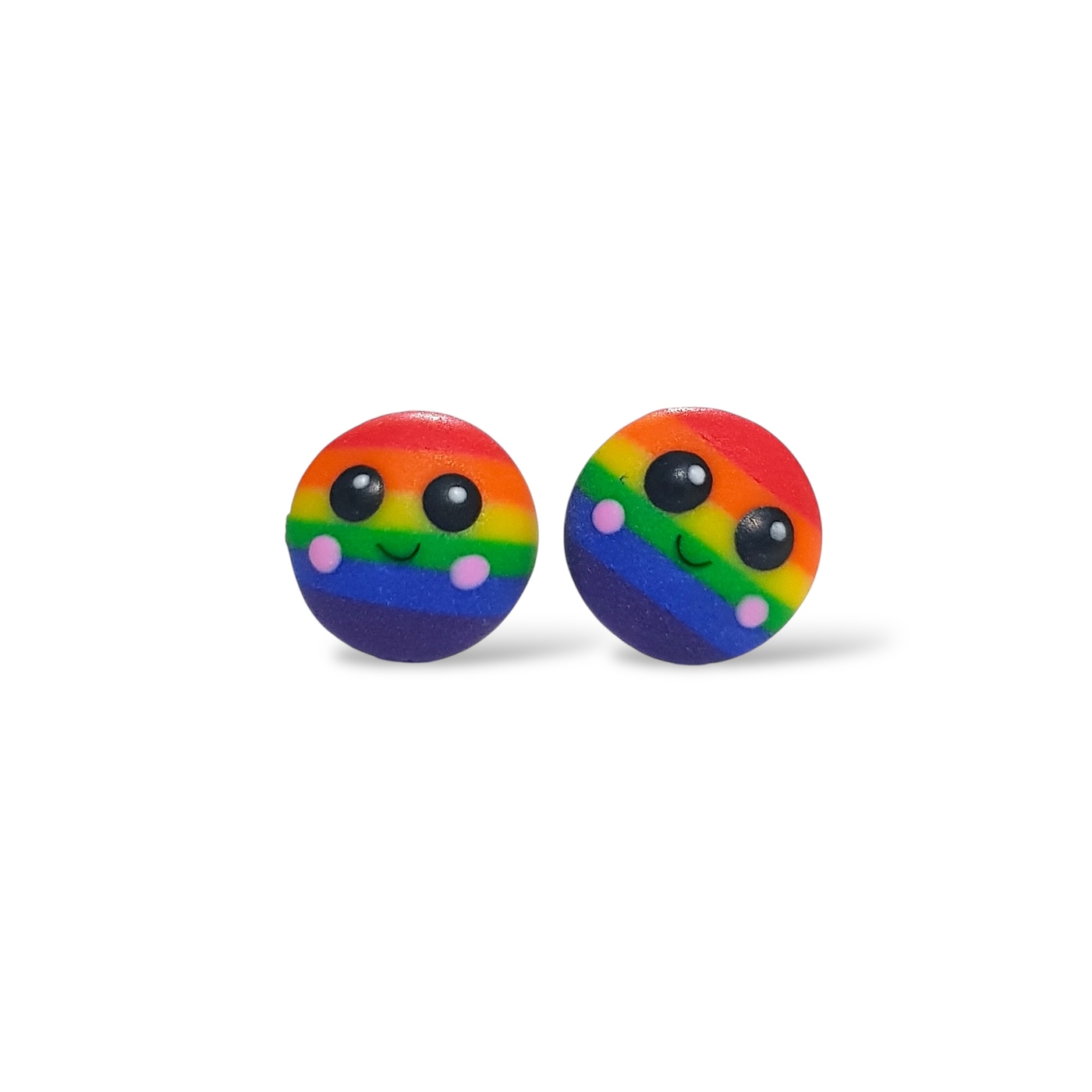 A beautiful pair of rainbow pride flag kawaii stud earrings. Handmade in polymer clay in the lgbtq pride flag colours of red, orange, yellow, green, blue, and indigo. Featuring hypoallergenic stainless steel posts and silicone rubber stoppers.