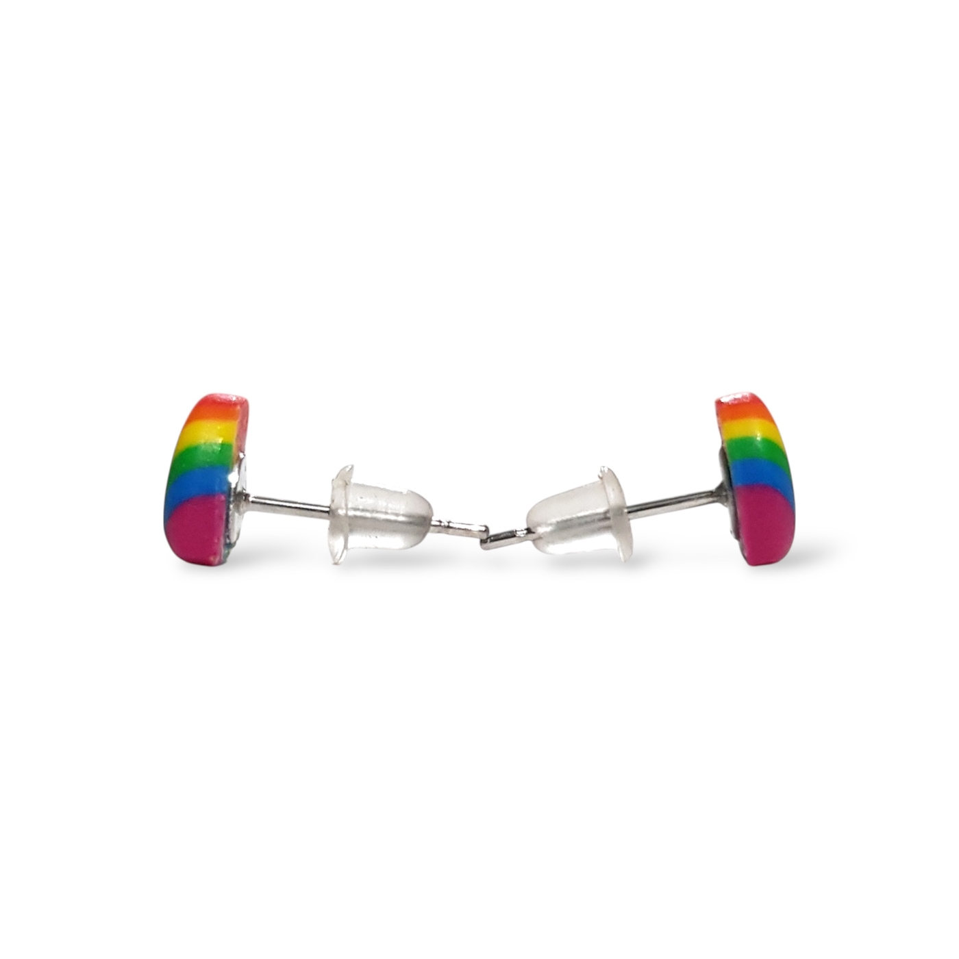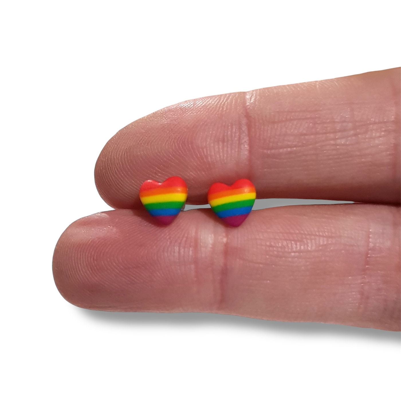 Pride flag small heart shaped stud earrings in the rainbow pride flag colours of red, orange, yellow, green, blue, and indigo.