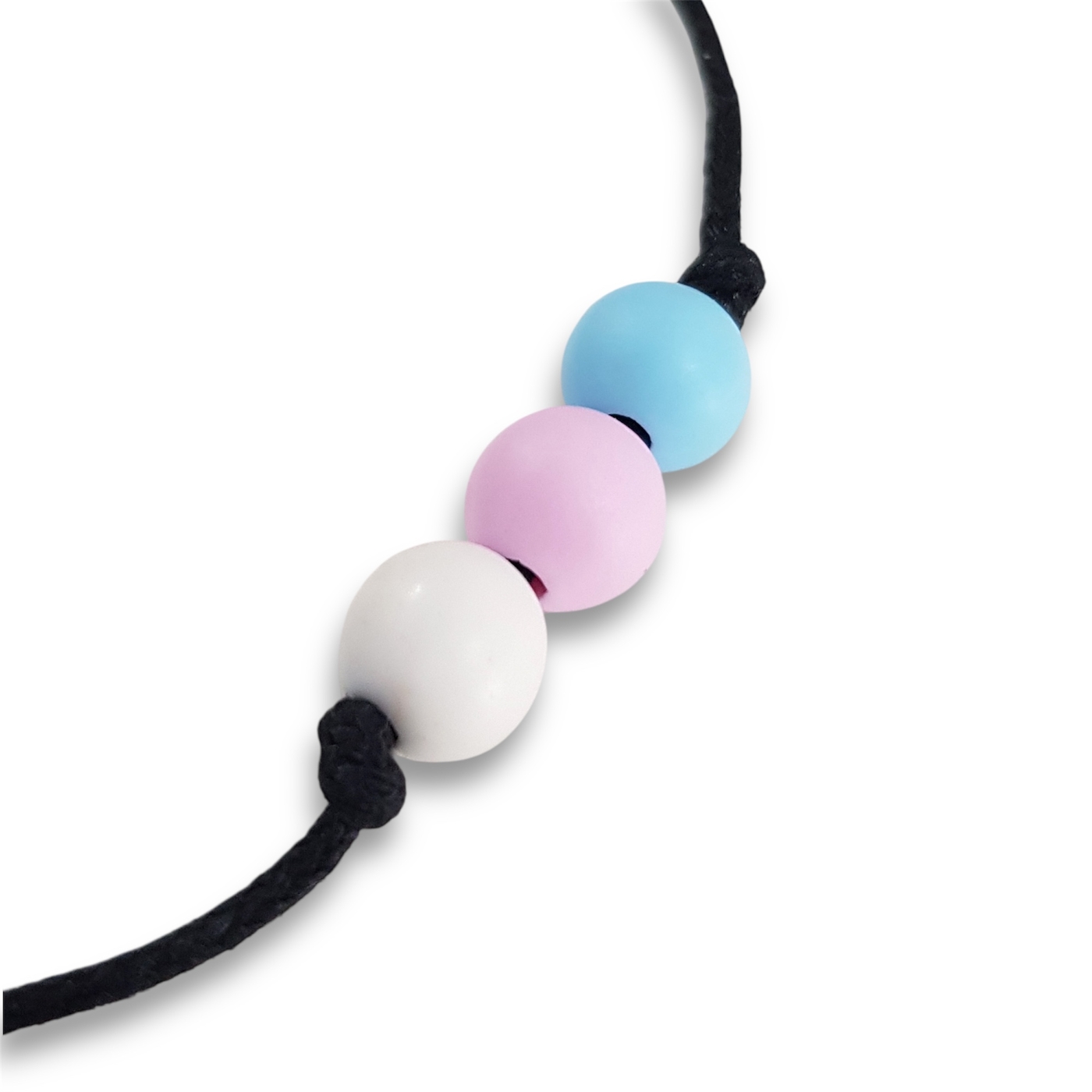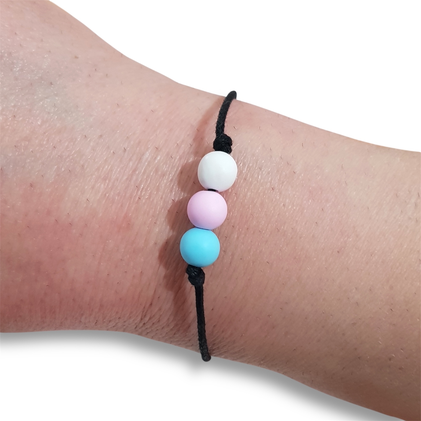Transgender pride flag bracelet in the trans flag colours of light blue, pink, and white.