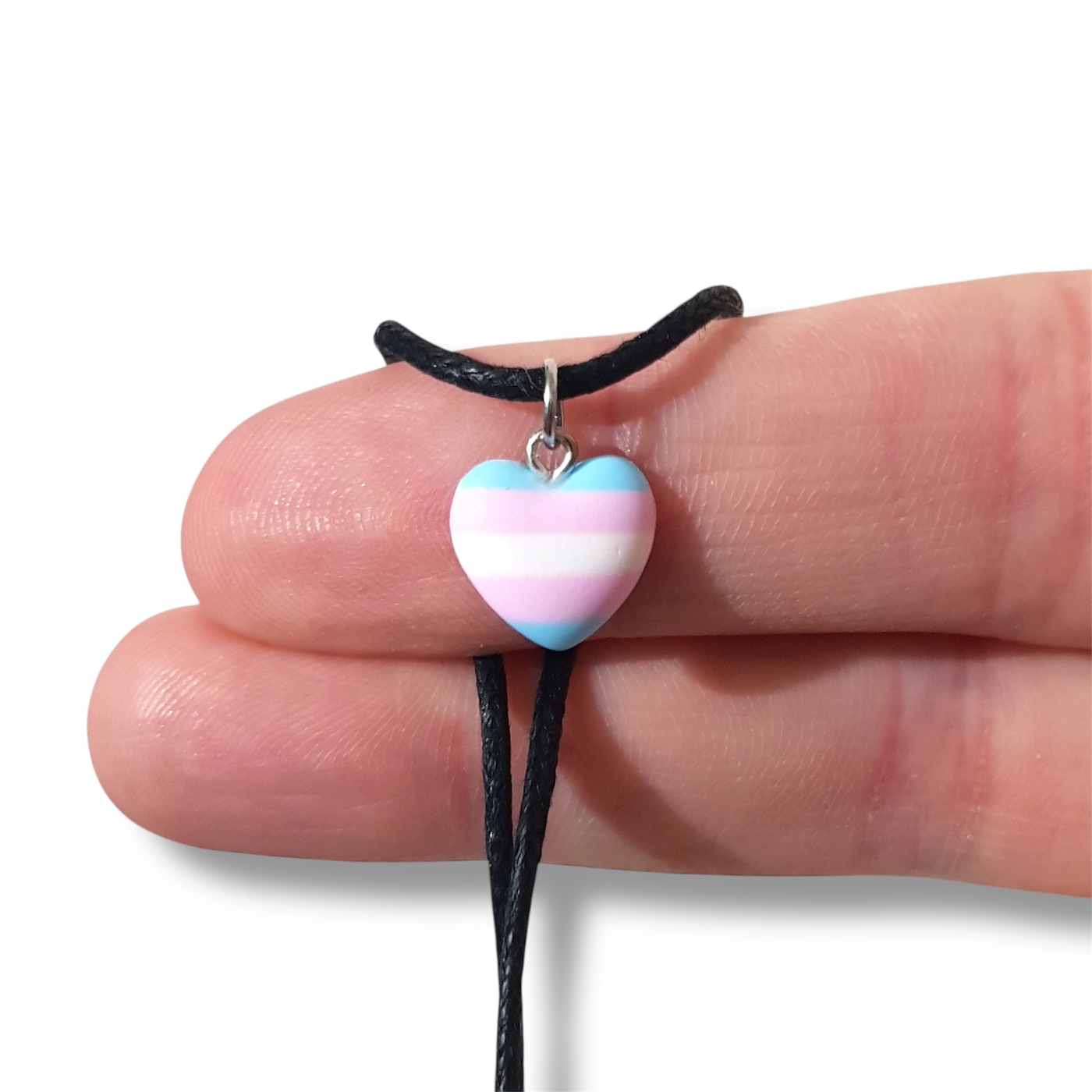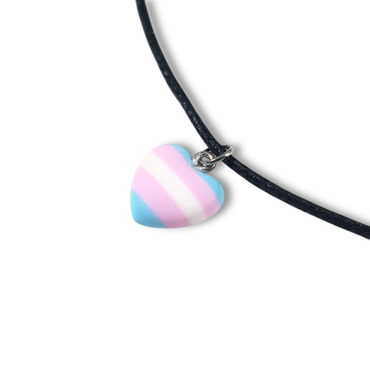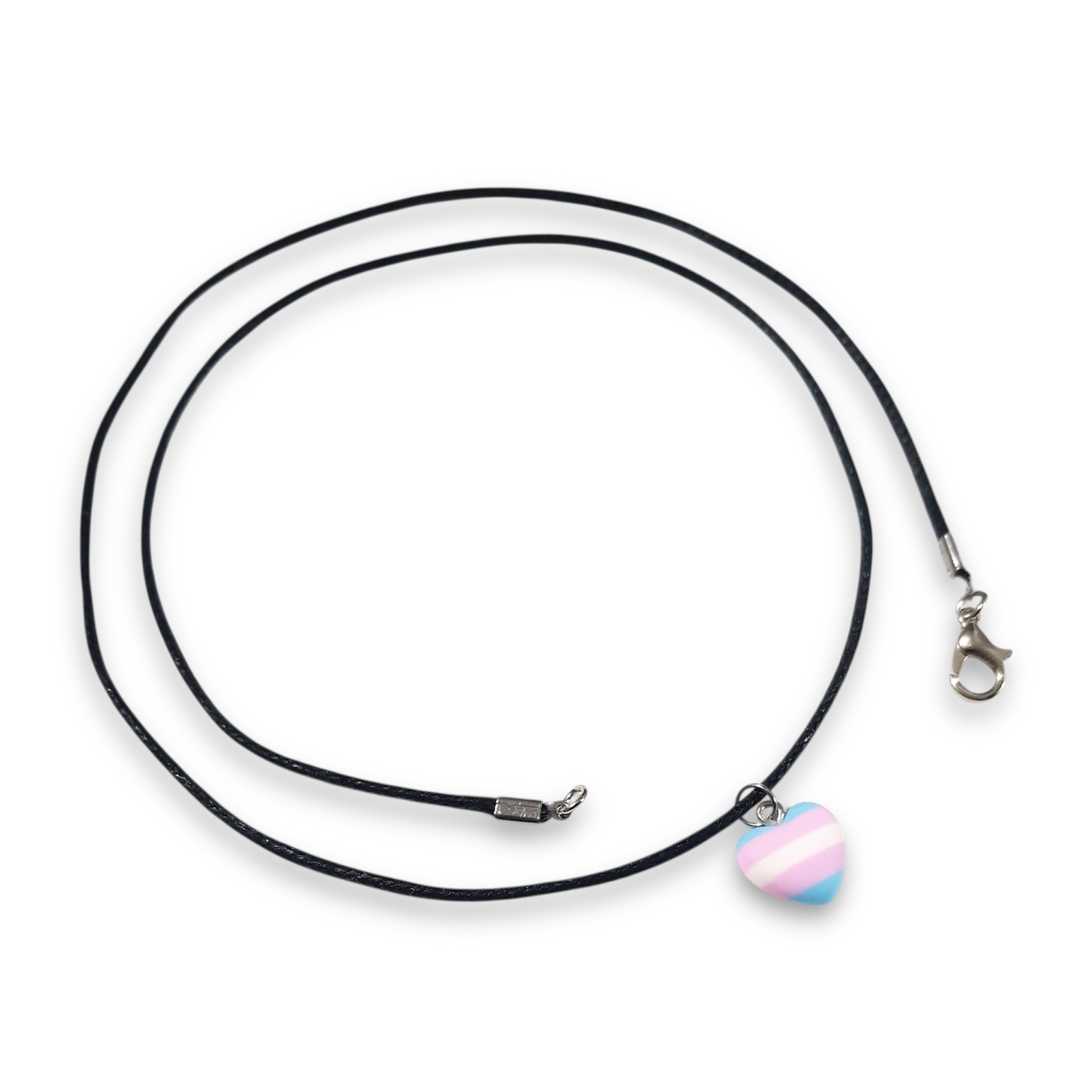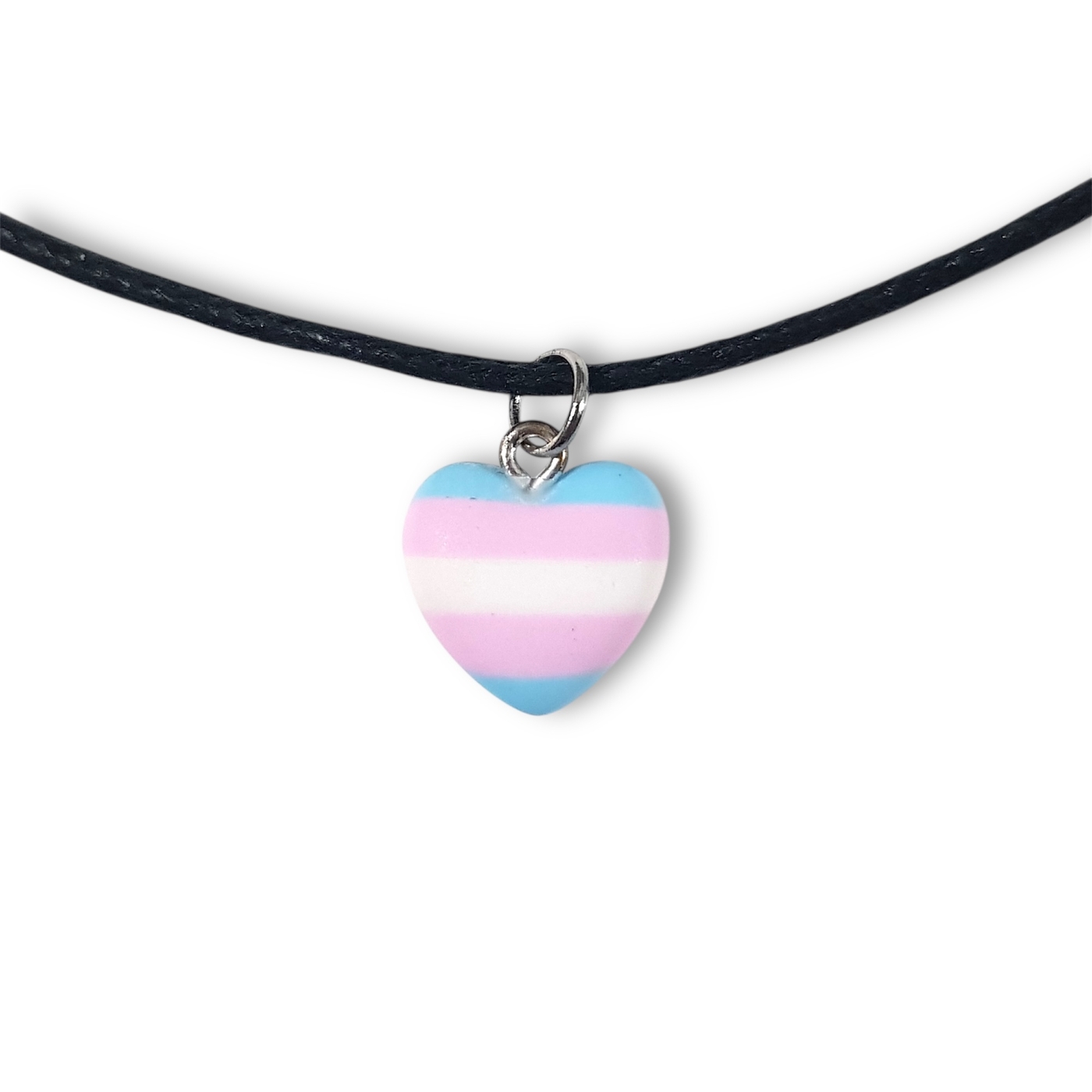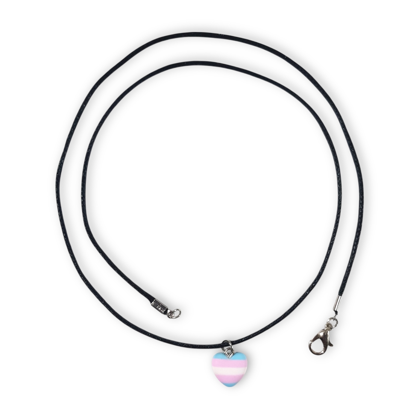 Transgender necklace in the trans pride flag colours of blue, pink, and white.